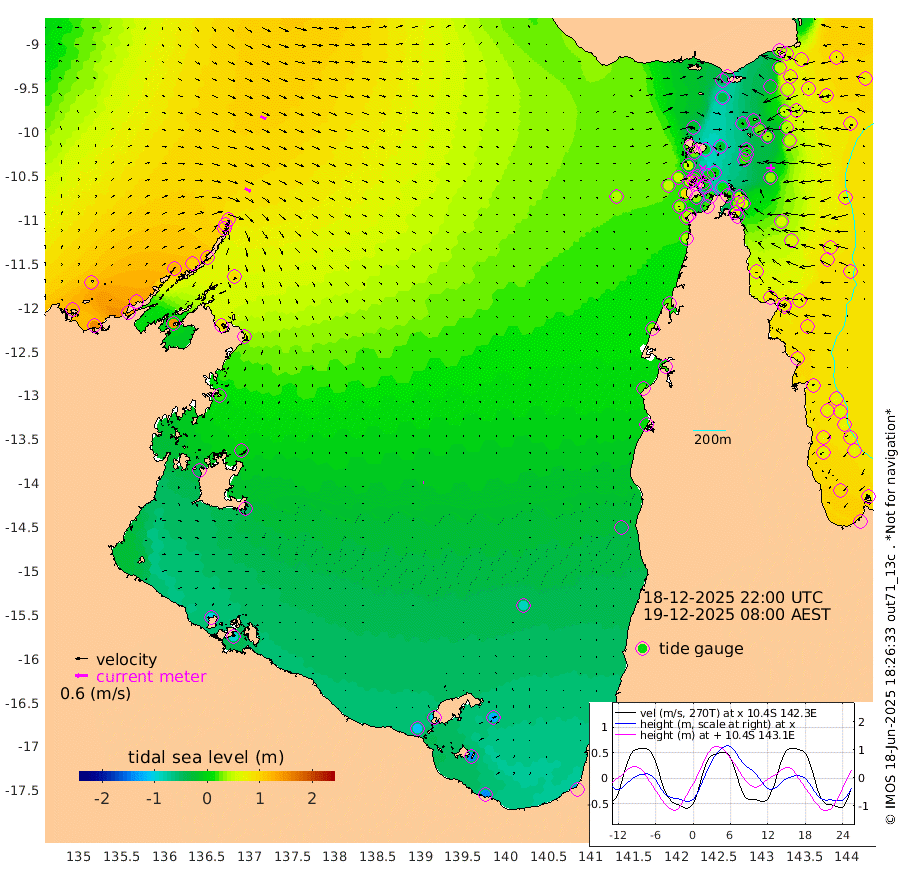 32cm/s 119T +3cm/s rms + 7cm/s -42T. ARA-GOC87 57m 5cm/s 126T +3cm/s rms + 2cm/s -2T. ARA-GOC87 60m 29cm/s 113T +2cm/s rms + 3cm/s 61T. ARA-GOC87 47m 41cm Daru 48cm Bobo Island 70cm Meer Island Barge 78cm Bramble Cay 68cm Unnamed Cay 56cm Pearce Cay 66cm Stephens Island 77cm Merrie England Shoals 51cm Mutacomal Reef 64cm Darnley Island Barge 75cm East Cay 49cm Yorke Island Barge 51cm Rennel Island 38cm Aureed Island 26cm Dungeness Reef -10cm Zagai Island -11cm Yam Island -46cm Dauan Island -42cm Saibai Island -33cm Phipi Reef -22cm Warrior Reef - West -18cm Mabuiag Island Barge 47cm Half Way Island 37cm Coconut Island 34cm Dugong Islet 10cm Poll Island 16cm Kirkcaldie Reef -15cm Suarji Island 8cm Sue Islet 50cm Hawkesbury Island 7cm Alert Patches 3cm Twin Island 31cm Badu Island -13cm St Pauls (Moa Island) 27cm Kubin (Moa Island) 3cm Ince Point 8cm Thursday Island 5cm Nardana Patches 21cm Turtle Head 43cm Round Island 46cm Goods Island 52cm Booby Island 47cm White Rocks Area 45cm Carpentaria -1cm Papou Point 84cm Bampfield Head 44cm Crab Island 41cm Red Wallis Island 33cm Packe Island 37cm Harrington Reef 42cm Herald Camp -17cm Sharp Point 18cm Red Island Point 21cm Possession Island 8cm Alpha Rock 18cm Frederick Point 53cm Wyborn Reef Light 44cm Tetley Island 56cm Triangle Reef 66cm Turtle Head Island 61cm Maclennan Cay 71cm Raine Island 59cm Mcsweeny Reef 65cm Collette Reef 68cm Shadwell Reef 76cm Hannibal Island 84cm Round Point 43cm Vrilya Point 76cm Cape Grenville 72cm Hicks Island 70cm Sir Charles Hardy Island 21cm Harvey Island 84cm Kay Reef 73cm Rocky Island 74cm Chapman Island 71cm Ham Reef 72cm Jubilee Reef 63cm Night Island 72cm Unnamed Reef No. 3 78cm Morris Island 74cm 1st 3 Mile Opening 73cm Creech Reef 67cm Fife Island 93cm Eden Reef 82cm Stanley Island 85cm Normanby River 121cm Yabooma Island 152cm Hutchison River 126cm Elcho Island 110cm North West Crocodile Island 93cm Cape Wessel 124cm Stevens Island 101cm Guluwuru Island 115cm Hopeful Bay 105cm Auster Point 102cm Two Island Bay 126cm Cadell Strait 144cm Mallison Island 86cm Melville Bay (Gove Harbour) 95cm Truant Island 55cm Cape Arnhem 21cm Cape Grey 6cm Hawk Island -38cm Milner Bay (Groote Eylandt) -49cm Cape Beatrice -99cm West Island -94cm Centre Island -103cm Mornington Island -110cm West Wellesley Islands -127cm Bountiful Island -140cm Albert River Mouth -141cm Sweers Island -137cm Karumba -83cm Nassau River Offshore -44cm Christmas Creek 8cm Archer River 18cm Boyd Point 19cm Weipa (Humbug Point) 34cm Pennefather River 29cm Cullen Point