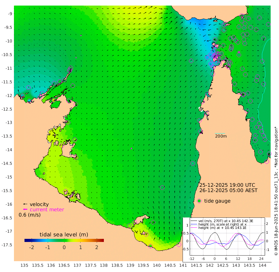 15cm/s 11T +3cm/s rms + 7cm/s -42T. ARA-GOC87 57m 24cm/s 16T +3cm/s rms + 2cm/s -2T. ARA-GOC87 60m 14cm/s 22T +2cm/s rms + 3cm/s 61T. ARA-GOC87 47m -25cm Daru -23cm Bobo Island -35cm Meer Island Barge -34cm Bramble Cay -28cm Unnamed Cay -39cm Pearce Cay -34cm Stephens Island -24cm Merrie England Shoals -25cm Mutacomal Reef -27cm Darnley Island Barge -39cm East Cay -24cm Yorke Island Barge -33cm Rennel Island -27cm Aureed Island -41cm Dungeness Reef -25cm Zagai Island -43cm Yam Island -64cm Dauan Island -36cm Saibai Island -63cm Phipi Reef -42cm Warrior Reef - West -45cm Mabuiag Island Barge -36cm Half Way Island -24cm Coconut Island -38cm Dugong Islet -35cm Poll Island -38cm Kirkcaldie Reef -35cm Suarji Island -19cm Sue Islet -123cm Hawkesbury Island -41cm Alert Patches -43cm Twin Island -105cm Badu Island -43cm St Pauls (Moa Island) -104cm Kubin (Moa Island) -59cm Ince Point -70cm Thursday Island -67cm Nardana Patches -96cm Turtle Head -95cm Round Island -122cm Goods Island -123cm Booby Island -122cm White Rocks Area -63cm Carpentaria -41cm Papou Point -105cm Bampfield Head -100cm Crab Island -121cm Red Wallis Island -119cm Packe Island -27cm Harrington Reef -128cm Herald Camp 0cm Sharp Point -80cm Red Island Point -53cm Possession Island -24cm Alpha Rock -33cm Frederick Point -19cm Wyborn Reef Light -19cm Tetley Island -34cm Triangle Reef -29cm Turtle Head Island -41cm Maclennan Cay -40cm Raine Island -25cm Mcsweeny Reef -22cm Collette Reef -29cm Shadwell Reef -25cm Hannibal Island -36cm Round Point -80cm Vrilya Point -32cm Cape Grenville -40cm Hicks Island -48cm Sir Charles Hardy Island -11cm Harvey Island -31cm Kay Reef -38cm Rocky Island -40cm Chapman Island -35cm Ham Reef -37cm Jubilee Reef -36cm Night Island -37cm Unnamed Reef No. 3 -39cm Morris Island -42cm 1st 3 Mile Opening -40cm Creech Reef -34cm Fife Island -49cm Eden Reef -39cm Stanley Island -43cm Normanby River -98cm Yabooma Island -104cm Hutchison River -82cm Elcho Island -84cm North West Crocodile Island -22cm Cape Wessel -53cm Stevens Island -9cm Guluwuru Island -49cm Hopeful Bay -35cm Auster Point -46cm Two Island Bay -73cm Cadell Strait 84cm Mallison Island -10cm Melville Bay (Gove Harbour) -9cm Truant Island 5cm Cape Arnhem 26cm Cape Grey 27cm Hawk Island 54cm Milner Bay (Groote Eylandt) 44cm Cape Beatrice 70cm West Island 71cm Centre Island 28cm Mornington Island 28cm West Wellesley Islands 14cm Bountiful Island 17cm Albert River Mouth 60cm Sweers Island 11cm Karumba -31cm Nassau River Offshore -60cm Christmas Creek -66cm Archer River -66cm Boyd Point -88cm Weipa (Humbug Point) -52cm Pennefather River -84cm Cullen Point