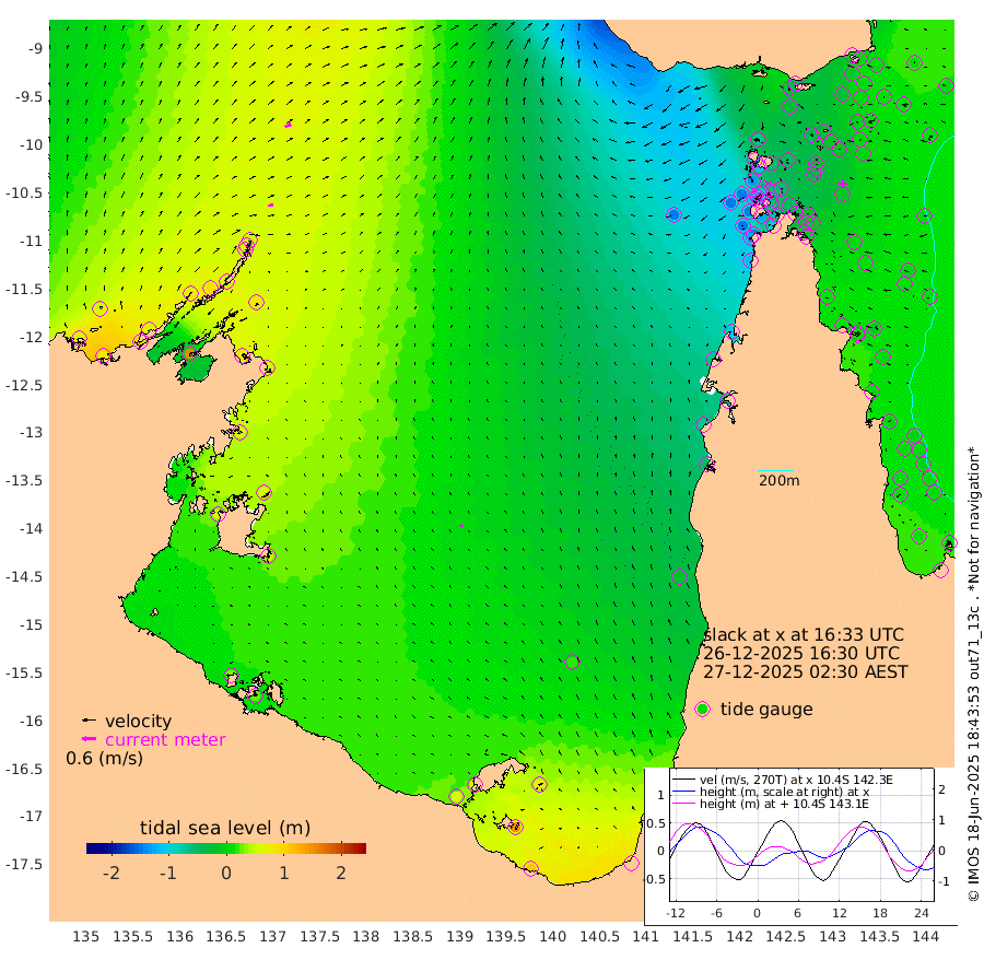 25cm/s 77T +3cm/s rms + 7cm/s -42T. ARA-GOC87 57m 12cm/s -30T +3cm/s rms + 2cm/s -2T. ARA-GOC87 60m 30cm/s 62T +2cm/s rms + 3cm/s 61T. ARA-GOC87 47m 2cm Daru 5cm Bobo Island 11cm Meer Island Barge 10cm Bramble Cay 5cm Unnamed Cay 7cm Pearce Cay 8cm Stephens Island 6cm Merrie England Shoals -8cm Mutacomal Reef 13cm Darnley Island Barge 5cm East Cay 7cm Yorke Island Barge -4cm Rennel Island 2cm Aureed Island -11cm Dungeness Reef -24cm Zagai Island -44cm Yam Island -44cm Dauan Island -50cm Saibai Island -29cm Phipi Reef -28cm Warrior Reef - West -71cm Mabuiag Island Barge -5cm Half Way Island -15cm Coconut Island -14cm Dugong Islet -28cm Poll Island -33cm Kirkcaldie Reef -46cm Suarji Island -25cm Sue Islet -135cm Hawkesbury Island -57cm Alert Patches -58cm Twin Island -113cm Badu Island -57cm St Pauls (Moa Island) -106cm Kubin (Moa Island) -76cm Ince Point -90cm Thursday Island -86cm Nardana Patches -100cm Turtle Head -109cm Round Island -127cm Goods Island -147cm Booby Island -145cm White Rocks Area -147cm Carpentaria -60cm Papou Point -147cm Bampfield Head -122cm Crab Island -149cm Red Wallis Island -123cm Packe Island -16cm Harrington Reef -143cm Herald Camp -14cm Sharp Point -100cm Red Island Point -69cm Possession Island -49cm Alpha Rock -38cm Frederick Point -8cm Wyborn Reef Light -15cm Tetley Island -3cm Triangle Reef -2cm Turtle Head Island -4cm Maclennan Cay 3cm Raine Island 6cm Mcsweeny Reef 8cm Collette Reef 8cm Shadwell Reef 13cm Hannibal Island 8cm Round Point -118cm Vrilya Point 2cm Cape Grenville 5cm Hicks Island -9cm Sir Charles Hardy Island 2cm Harvey Island 1cm Kay Reef 4cm Rocky Island 0cm Chapman Island -3cm Ham Reef 3cm Jubilee Reef 5cm Night Island -5cm Unnamed Reef No. 3 5cm Morris Island 5cm 1st 3 Mile Opening 2cm Creech Reef 14cm Fife Island 11cm Eden Reef 5cm Stanley Island 7cm Normanby River 57cm Yabooma Island 77cm Hutchison River 66cm Elcho Island 57cm North West Crocodile Island 52cm Cape Wessel 77cm Stevens Island 83cm Guluwuru Island 70cm Hopeful Bay 65cm Auster Point 65cm Two Island Bay 103cm Cadell Strait 152cm Mallison Island 81cm Melville Bay (Gove Harbour) 80cm Truant Island 63cm Cape Arnhem 59cm Cape Grey 60cm Hawk Island 54cm Milner Bay (Groote Eylandt) 46cm Cape Beatrice 32cm West Island 30cm Centre Island 60cm Mornington Island 56cm West Wellesley Islands 73cm Bountiful Island 108cm Albert River Mouth 145cm Sweers Island 100cm Karumba 22cm Nassau River Offshore -18cm Christmas Creek -49cm Archer River -69cm Boyd Point -73cm Weipa (Humbug Point) -63cm Pennefather River -111cm Cullen Point