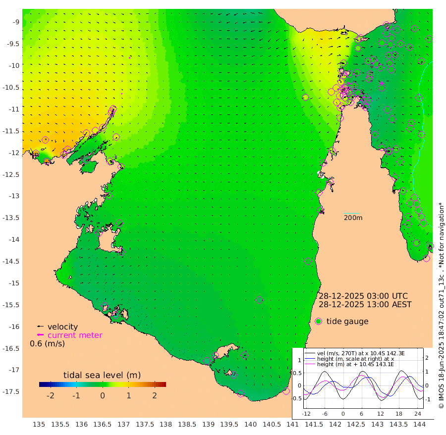 9cm/s 135T +3cm/s rms + 7cm/s -42T. ARA-GOC87 57m 3cm/s -121T +3cm/s rms + 2cm/s -2T. ARA-GOC87 60m 11cm/s 118T +2cm/s rms + 3cm/s 61T. ARA-GOC87 47m -18cm Daru -12cm Bobo Island 8cm Meer Island Barge -4cm Bramble Cay -14cm Unnamed Cay -2cm Pearce Cay -7cm Stephens Island -26cm Merrie England Shoals -25cm Mutacomal Reef -6cm Darnley Island Barge 9cm East Cay -9cm Yorke Island Barge -8cm Rennel Island -7cm Aureed Island -3cm Dungeness Reef 2cm Zagai Island 6cm Yam Island 40cm Dauan Island 31cm Saibai Island 23cm Phipi Reef 8cm Warrior Reef - West 34cm Mabuiag Island Barge -14cm Half Way Island -13cm Coconut Island -9cm Dugong Islet -4cm Poll Island -10cm Kirkcaldie Reef 12cm Suarji Island -6cm Sue Islet 81cm Hawkesbury Island 7cm Alert Patches 7cm Twin Island 70cm Badu Island 10cm St Pauls (Moa Island) 59cm Kubin (Moa Island) 23cm Ince Point 32cm Thursday Island 31cm Nardana Patches 52cm Turtle Head 62cm Round Island 76cm Goods Island 80cm Booby Island 81cm White Rocks Area 47cm Carpentaria 15cm Papou Point 93cm Bampfield Head 56cm Crab Island 71cm Red Wallis Island 54cm Packe Island -17cm Harrington Reef 82cm Herald Camp -10cm Sharp Point 45cm Red Island Point 28cm Possession Island -5cm Alpha Rock -4cm Frederick Point -18cm Wyborn Reef Light -16cm Tetley Island 9cm Triangle Reef -9cm Turtle Head Island 13cm Maclennan Cay 17cm Raine Island -11cm Mcsweeny Reef -11cm Collette Reef 2cm Shadwell Reef -15cm Hannibal Island -4cm Round Point 35cm Vrilya Point -6cm Cape Grenville 8cm Hicks Island 19cm Sir Charles Hardy Island 0cm Harvey Island 0cm Kay Reef 15cm Rocky Island 20cm Chapman Island 18cm Ham Reef 14cm Jubilee Reef 6cm Night Island 14cm Unnamed Reef No. 3 12cm Morris Island 20cm 1st 3 Mile Opening 14cm Creech Reef 9cm Fife Island 18cm Eden Reef 8cm Stanley Island 12cm Normanby River 140cm Yabooma Island 150cm Hutchison River 123cm Elcho Island 119cm North West Crocodile Island 81cm Cape Wessel 97cm Stevens Island 61cm Guluwuru Island 92cm Hopeful Bay 90cm Auster Point 90cm Two Island Bay 114cm Cadell Strait -45cm Mallison Island 57cm Melville Bay (Gove Harbour) 64cm Truant Island 33cm Cape Arnhem 16cm Cape Grey -3cm Hawk Island -26cm Milner Bay (Groote Eylandt) -32cm Cape Beatrice -64cm West Island -67cm Centre Island -63cm Mornington Island -55cm West Wellesley Islands -34cm Bountiful Island -54cm Albert River Mouth -68cm Sweers Island -57cm Karumba -38cm Nassau River Offshore -13cm Christmas Creek 13cm Archer River 28cm Boyd Point 41cm Weipa (Humbug Point) 5cm Pennefather River 41cm Cullen Point