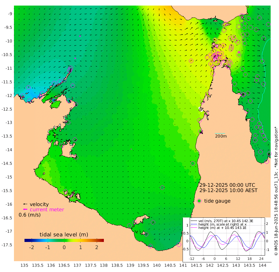22cm/s -86T +3cm/s rms + 7cm/s -42T. ARA-GOC87 57m 7cm/s 33T +3cm/s rms + 2cm/s -2T. ARA-GOC87 60m 22cm/s -100T +2cm/s rms + 3cm/s 61T. ARA-GOC87 47m 17cm Daru 13cm Bobo Island -16cm Meer Island Barge -8cm Bramble Cay 13cm Unnamed Cay 7cm Pearce Cay 0cm Stephens Island 10cm Merrie England Shoals 28cm Mutacomal Reef -4cm Darnley Island Barge -14cm East Cay 10cm Yorke Island Barge 19cm Rennel Island 18cm Aureed Island 30cm Dungeness Reef 48cm Zagai Island 49cm Yam Island 46cm Dauan Island 54cm Saibai Island 52cm Phipi Reef 41cm Warrior Reef - West 73cm Mabuiag Island Barge 14cm Half Way Island 39cm Coconut Island 26cm Dugong Islet 46cm Poll Island 41cm Kirkcaldie Reef 83cm Suarji Island 47cm Sue Islet 82cm Hawkesbury Island 81cm Alert Patches 72cm Twin Island 78cm Badu Island 73cm St Pauls (Moa Island) 71cm Kubin (Moa Island) 76cm Ince Point 80cm Thursday Island 79cm Nardana Patches 77cm Turtle Head 90cm Round Island 80cm Goods Island 89cm Booby Island 93cm White Rocks Area 96cm Carpentaria 65cm Papou Point 122cm Bampfield Head 66cm Crab Island 84cm Red Wallis Island 74cm Packe Island 38cm Harrington Reef 89cm Herald Camp 22cm Sharp Point 67cm Red Island Point 84cm Possession Island 66cm Alpha Rock 56cm Frederick Point 36cm Wyborn Reef Light 41cm Tetley Island 1cm Triangle Reef 29cm Turtle Head Island -6cm Maclennan Cay -16cm Raine Island 9cm Mcsweeny Reef 7cm Collette Reef -6cm Shadwell Reef 3cm Hannibal Island -5cm Round Point 61cm Vrilya Point -1cm Cape Grenville -10cm Hicks Island -6cm Sir Charles Hardy Island -2cm Harvey Island -6cm Kay Reef -13cm Rocky Island -12cm Chapman Island -13cm Ham Reef -16cm Jubilee Reef -14cm Night Island -12cm Unnamed Reef No. 3 -16cm Morris Island -12cm 1st 3 Mile Opening -14cm Creech Reef -28cm Fife Island -26cm Eden Reef -16cm Stanley Island -22cm Normanby River -87cm Yabooma Island -100cm Hutchison River -87cm Elcho Island -86cm North West Crocodile Island -64cm Cape Wessel -88cm Stevens Island -83cm Guluwuru Island -76cm Hopeful Bay -65cm Auster Point -85cm Two Island Bay -134cm Cadell Strait -149cm Mallison Island -72cm Melville Bay (Gove Harbour) -71cm Truant Island -48cm Cape Arnhem -28cm Cape Grey -19cm Hawk Island -5cm Milner Bay (Groote Eylandt) -6cm Cape Beatrice 17cm West Island 26cm Centre Island -15cm Mornington Island -10cm West Wellesley Islands -21cm Bountiful Island -50cm Albert River Mouth -43cm Sweers Island -45cm Karumba -24cm Nassau River Offshore -8cm Christmas Creek 17cm Archer River 33cm Boyd Point 30cm Weipa (Humbug Point) 33cm Pennefather River 57cm Cullen Point