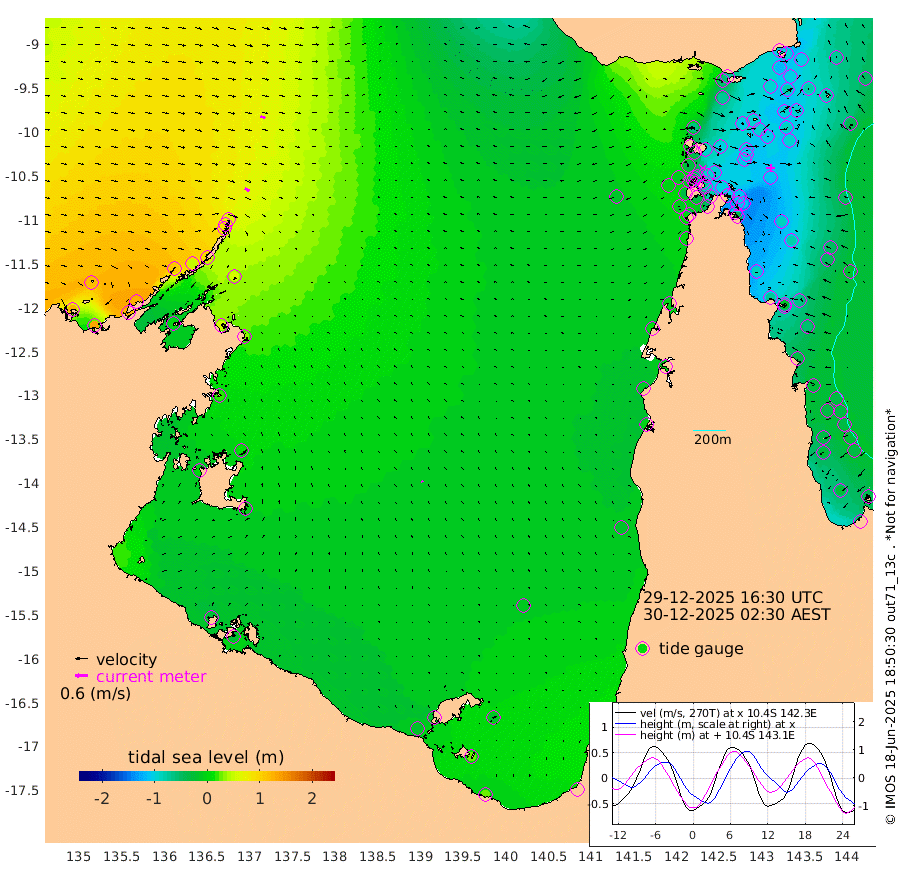23cm/s 119T +3cm/s rms + 7cm/s -42T. ARA-GOC87 57m 7cm/s -35T +3cm/s rms + 2cm/s -2T. ARA-GOC87 60m 24cm/s 109T +2cm/s rms + 3cm/s 61T. ARA-GOC87 47m -104cm Daru -96cm Bobo Island -43cm Meer Island Barge -68cm Bramble Cay -100cm Unnamed Cay -80cm Pearce Cay -82cm Stephens Island -100cm Merrie England Shoals -117cm Mutacomal Reef -76cm Darnley Island Barge -52cm East Cay -90cm Yorke Island Barge -96cm Rennel Island -89cm Aureed Island -96cm Dungeness Reef -93cm Zagai Island -104cm Yam Island -55cm Dauan Island -71cm Saibai Island -69cm Phipi Reef -92cm Warrior Reef - West -62cm Mabuiag Island Barge -94cm Half Way Island -102cm Coconut Island -105cm Dugong Islet -99cm Poll Island -109cm Kirkcaldie Reef -103cm Suarji Island -105cm Sue Islet -30cm Hawkesbury Island -94cm Alert Patches -96cm Twin Island -22cm Badu Island -93cm St Pauls (Moa Island) -41cm Kubin (Moa Island) -74cm Ince Point -63cm Thursday Island -65cm Nardana Patches -43cm Turtle Head -46cm Round Island -15cm Goods Island -3cm Booby Island -12cm White Rocks Area -18cm Carpentaria -85cm Papou Point -31cm Bampfield Head 4cm Crab Island -9cm Red Wallis Island -33cm Packe Island -115cm Harrington Reef -42cm Herald Camp -35cm Sharp Point -47cm Red Island Point -75cm Possession Island -103cm Alpha Rock -103cm Frederick Point -111cm Wyborn Reef Light -111cm Tetley Island -46cm Triangle Reef -100cm Turtle Head Island -49cm Maclennan Cay -22cm Raine Island -85cm Mcsweeny Reef -80cm Collette Reef -48cm Shadwell Reef -86cm Hannibal Island -68cm Round Point 6cm Vrilya Point -69cm Cape Grenville -56cm Hicks Island -64cm Sir Charles Hardy Island -20cm Harvey Island -58cm Kay Reef -37cm Rocky Island -28cm Chapman Island -31cm Ham Reef -33cm Jubilee Reef -31cm Night Island -31cm Unnamed Reef No. 3 -36cm Morris Island -27cm 1st 3 Mile Opening -33cm Creech Reef -25cm Fife Island -30cm Eden Reef -40cm Stanley Island -44cm Normanby River 121cm Yabooma Island 134cm Hutchison River 126cm Elcho Island 118cm North West Crocodile Island 66cm Cape Wessel 106cm Stevens Island 48cm Guluwuru Island 97cm Hopeful Bay 82cm Auster Point 86cm Two Island Bay 124cm Cadell Strait 7cm Mallison Island 54cm Melville Bay (Gove Harbour) 57cm Truant Island 36cm Cape Arnhem 16cm Cape Grey 12cm Hawk Island 5cm Milner Bay (Groote Eylandt) 0cm Cape Beatrice -26cm West Island -27cm Centre Island -18cm Mornington Island -20cm West Wellesley Islands -19cm Bountiful Island 23cm Albert River Mouth 28cm Sweers Island 12cm Karumba -13cm Nassau River Offshore -19cm Christmas Creek -3cm Archer River -8cm Boyd Point 1cm Weipa (Humbug Point) 9cm Pennefather River -3cm Cullen Point