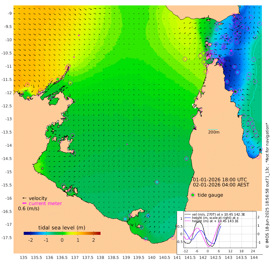 19cm/s 129T +3cm/s rms + 7cm/s -42T. ARA-GOC87 57m 18cm/s 16T +3cm/s rms + 2cm/s -2T. ARA-GOC87 60m 24cm/s 127T +2cm/s rms + 3cm/s 61T. ARA-GOC87 47m -167cm Daru -160cm Bobo Island -92cm Meer Island Barge -126cm Bramble Cay -161cm Unnamed Cay -151cm Pearce Cay -147cm Stephens Island -160cm Merrie England Shoals -174cm Mutacomal Reef -137cm Darnley Island Barge -102cm East Cay -150cm Yorke Island Barge -157cm Rennel Island -154cm Aureed Island -159cm Dungeness Reef -133cm Zagai Island -139cm Yam Island -87cm Dauan Island -82cm Saibai Island -120cm Phipi Reef -142cm Warrior Reef - West -52cm Mabuiag Island Barge -155cm Half Way Island -154cm Coconut Island -164cm Dugong Islet -145cm Poll Island -153cm Kirkcaldie Reef -140cm Suarji Island -139cm Sue Islet 11cm Hawkesbury Island -115cm Alert Patches -120cm Twin Island 5cm Badu Island -116cm St Pauls (Moa Island) -29cm Kubin (Moa Island) -81cm Ince Point -58cm Thursday Island -64cm Nardana Patches -38cm Turtle Head -21cm Round Island 13cm Goods Island 49cm Booby Island 33cm White Rocks Area 62cm Carpentaria -96cm Papou Point 30cm Bampfield Head 50cm Crab Island 39cm Red Wallis Island -19cm Packe Island -172cm Harrington Reef -6cm Herald Camp -39cm Sharp Point -28cm Red Island Point -79cm Possession Island -120cm Alpha Rock -140cm Frederick Point -161cm Wyborn Reef Light -157cm Tetley Island -87cm Triangle Reef -154cm Turtle Head Island -94cm Maclennan Cay -59cm Raine Island -144cm Mcsweeny Reef -135cm Collette Reef -92cm Shadwell Reef -148cm Hannibal Island -126cm Round Point 61cm Vrilya Point -119cm Cape Grenville -107cm Hicks Island -111cm Sir Charles Hardy Island -37cm Harvey Island -100cm Kay Reef -79cm Rocky Island -66cm Chapman Island -63cm Ham Reef -72cm Jubilee Reef -74cm Night Island -65cm Unnamed Reef No. 3 -80cm Morris Island -69cm 1st 3 Mile Opening -75cm Creech Reef -75cm Fife Island -82cm Eden Reef -84cm Stanley Island -93cm Normanby River 108cm Yabooma Island 108cm Hutchison River 112cm Elcho Island 107cm North West Crocodile Island 64cm Cape Wessel 91cm Stevens Island 18cm Guluwuru Island 84cm Hopeful Bay 73cm Auster Point 76cm Two Island Bay 85cm Cadell Strait -37cm Mallison Island 25cm Melville Bay (Gove Harbour) 31cm Truant Island 12cm Cape Arnhem -2cm Cape Grey -14cm Hawk Island -9cm Milner Bay (Groote Eylandt) -22cm Cape Beatrice -39cm West Island -40cm Centre Island -90cm Mornington Island -92cm West Wellesley Islands -107cm Bountiful Island -84cm Albert River Mouth -78cm Sweers Island -92cm Karumba -87cm Nassau River Offshore -73cm Christmas Creek -16cm Archer River 0cm Boyd Point 2cm Weipa (Humbug Point) 30cm Pennefather River 38cm Cullen Point