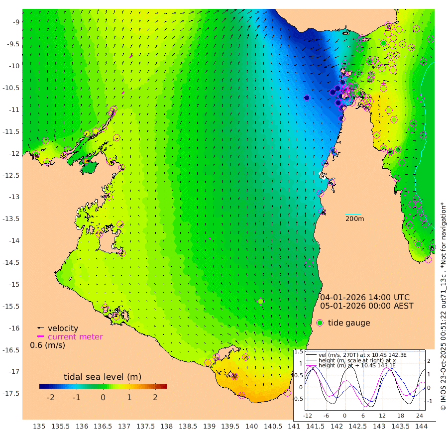 28cm/s 49T +3cm/s rms + 7cm/s -42T. ARA-GOC87 57m 24cm/s -12T +3cm/s rms + 2cm/s -2T. ARA-GOC87 60m 36cm/s 46T +2cm/s rms + 3cm/s 61T. ARA-GOC87 47m 52cm Daru 61cm Bobo Island 13cm Meer Island Barge 33cm Bramble Cay 47cm Unnamed Cay 53cm Pearce Cay 45cm Stephens Island 48cm Merrie England Shoals 52cm Mutacomal Reef 41cm Darnley Island Barge 13cm East Cay 48cm Yorke Island Barge 42cm Rennel Island 54cm Aureed Island 37cm Dungeness Reef 24cm Zagai Island 8cm Yam Island -44cm Dauan Island -39cm Saibai Island -25cm Phipi Reef 15cm Warrior Reef - West -70cm Mabuiag Island Barge 46cm Half Way Island 38cm Coconut Island 43cm Dugong Islet 27cm Poll Island 18cm Kirkcaldie Reef 7cm Suarji Island 22cm Sue Islet -198cm Hawkesbury Island -29cm Alert Patches -16cm Twin Island -171cm Badu Island -17cm St Pauls (Moa Island) -136cm Kubin (Moa Island) -63cm Ince Point -92cm Thursday Island -84cm Nardana Patches -131cm Turtle Head -153cm Round Island -193cm Goods Island -231cm Booby Island -207cm White Rocks Area -207cm Carpentaria -25cm Papou Point -232cm Bampfield Head -201cm Crab Island -214cm Red Wallis Island -162cm Packe Island 51cm Harrington Reef -207cm Herald Camp 5cm Sharp Point -123cm Red Island Point -65cm Possession Island 0cm Alpha Rock 12cm Frederick Point 48cm Wyborn Reef Light 42cm Tetley Island 5cm Triangle Reef 42cm Turtle Head Island 3cm Maclennan Cay -16cm Raine Island 42cm Mcsweeny Reef 35cm Collette Reef 7cm Shadwell Reef 44cm Hannibal Island 30cm Round Point -194cm Vrilya Point 20cm Cape Grenville 14cm Hicks Island -1cm Sir Charles Hardy Island 7cm Harvey Island 6cm Kay Reef -4cm Rocky Island -13cm Chapman Island -16cm Ham Reef -8cm Jubilee Reef 0cm Night Island -15cm Unnamed Reef No. 3 -3cm Morris Island -15cm 1st 3 Mile Opening -9cm Creech Reef 7cm Fife Island -3cm Eden Reef -4cm Stanley Island 9cm Normanby River 20cm Yabooma Island 33cm Hutchison River 28cm Elcho Island 27cm North West Crocodile Island 50cm Cape Wessel 54cm Stevens Island 71cm Guluwuru Island 42cm Hopeful Bay 47cm Auster Point 49cm Two Island Bay 68cm Cadell Strait 130cm Mallison Island 68cm Melville Bay (Gove Harbour) 67cm Truant Island 56cm Cape Arnhem 64cm Cape Grey 73cm Hawk Island 90cm Milner Bay (Groote Eylandt) 82cm Cape Beatrice 93cm West Island 89cm Centre Island 99cm Mornington Island 102cm West Wellesley Islands 116cm Bountiful Island 154cm Albert River Mouth 193cm Sweers Island 136cm Karumba 33cm Nassau River Offshore -35cm Christmas Creek -101cm Archer River -124cm Boyd Point -138cm Weipa (Humbug Point) -127cm Pennefather River -177cm Cullen Point