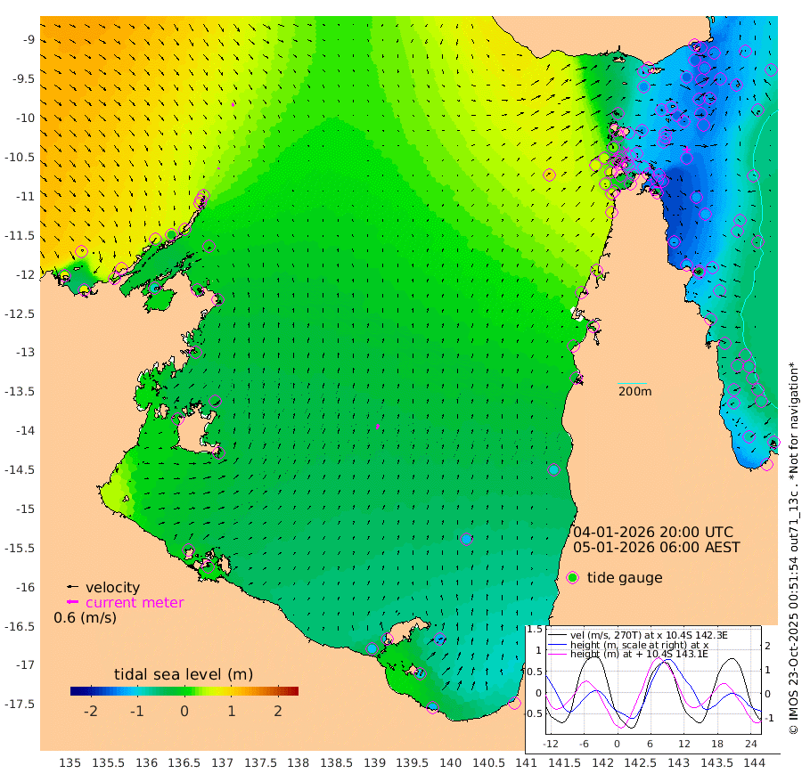 7cm/s 164T +3cm/s rms + 7cm/s -42T. ARA-GOC87 57m 27cm/s 16T +3cm/s rms + 2cm/s -2T. ARA-GOC87 60m 15cm/s 148T +2cm/s rms + 3cm/s 61T. ARA-GOC87 47m -159cm Daru -154cm Bobo Island -86cm Meer Island Barge -116cm Bramble Cay -141cm Unnamed Cay -152cm Pearce Cay -137cm Stephens Island -139cm Merrie England Shoals -155cm Mutacomal Reef -128cm Darnley Island Barge -96cm East Cay -140cm Yorke Island Barge -146cm Rennel Island -150cm Aureed Island -153cm Dungeness Reef -132cm Zagai Island -131cm Yam Island -111cm Dauan Island -93cm Saibai Island -136cm Phipi Reef -152cm Warrior Reef - West -49cm Mabuiag Island Barge -143cm Half Way Island -144cm Coconut Island -151cm Dugong Islet -139cm Poll Island -141cm Kirkcaldie Reef -129cm Suarji Island -128cm Sue Islet 25cm Hawkesbury Island -102cm Alert Patches -109cm Twin Island 4cm Badu Island -109cm St Pauls (Moa Island) -20cm Kubin (Moa Island) -72cm Ince Point -48cm Thursday Island -55cm Nardana Patches -32cm Turtle Head 5cm Round Island 21cm Goods Island 64cm Booby Island 48cm White Rocks Area 96cm Carpentaria -85cm Papou Point 75cm Bampfield Head 56cm Crab Island 49cm Red Wallis Island -12cm Packe Island -157cm Harrington Reef 24cm Herald Camp -36cm Sharp Point -22cm Red Island Point -56cm Possession Island -101cm Alpha Rock -129cm Frederick Point -143cm Wyborn Reef Light -140cm Tetley Island -84cm Triangle Reef -137cm Turtle Head Island -86cm Maclennan Cay -57cm Raine Island -134cm Mcsweeny Reef -123cm Collette Reef -84cm Shadwell Reef -133cm Hannibal Island -117cm Round Point 70cm Vrilya Point -103cm Cape Grenville -98cm Hicks Island -99cm Sir Charles Hardy Island -33cm Harvey Island -84cm Kay Reef -73cm Rocky Island -65cm Chapman Island -57cm Ham Reef -67cm Jubilee Reef -71cm Night Island -61cm Unnamed Reef No. 3 -73cm Morris Island -62cm 1st 3 Mile Opening -70cm Creech Reef -82cm Fife Island -77cm Eden Reef -73cm Stanley Island -84cm Normanby River 80cm Yabooma Island 72cm Hutchison River 83cm Elcho Island 79cm North West Crocodile Island 43cm Cape Wessel 61cm Stevens Island -9cm Guluwuru Island 62cm Hopeful Bay 53cm Auster Point 53cm Two Island Bay 25cm Cadell Strait -88cm Mallison Island -2cm Melville Bay (Gove Harbour) 4cm Truant Island -8cm Cape Arnhem -9cm Cape Grey -19cm Hawk Island -3cm Milner Bay (Groote Eylandt) -19cm Cape Beatrice -23cm West Island -19cm Centre Island -104cm Mornington Island -106cm West Wellesley Islands -121cm Bountiful Island -116cm Albert River Mouth -104cm Sweers Island -122cm Karumba -115cm Nassau River Offshore -96cm Christmas Creek -27cm Archer River -2cm Boyd Point -4cm Weipa (Humbug Point) 28cm Pennefather River 48cm Cullen Point