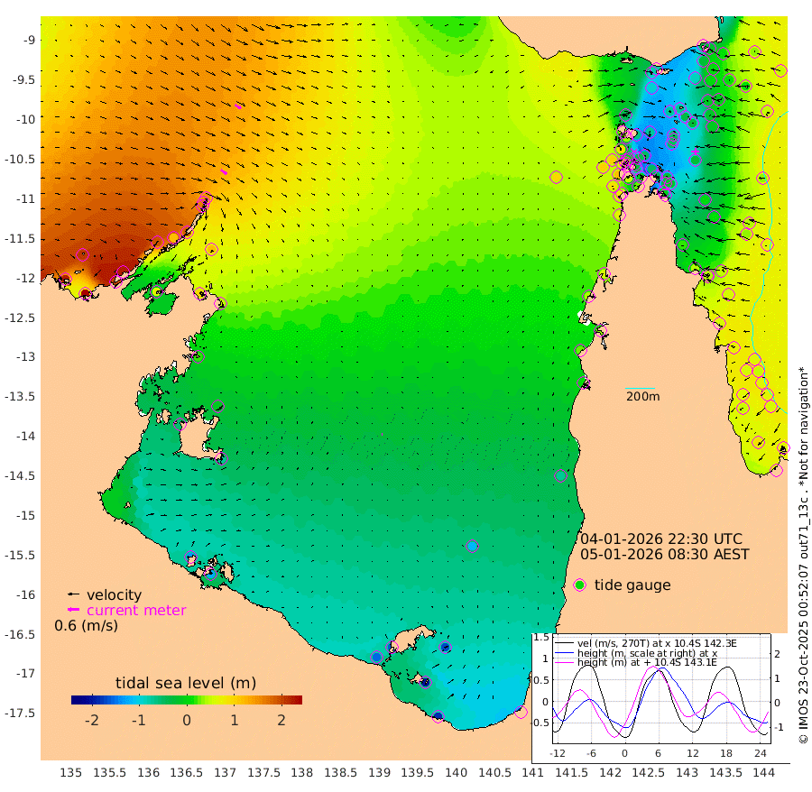 37cm/s 125T +3cm/s rms + 7cm/s -42T. ARA-GOC87 57m 4cm/s 71T +3cm/s rms + 2cm/s -2T. ARA-GOC87 60m 38cm/s 121T +2cm/s rms + 3cm/s 61T. ARA-GOC87 47m -35cm Daru -15cm Bobo Island 46cm Meer Island Barge 37cm Bramble Cay 4cm Unnamed Cay 6cm Pearce Cay 13cm Stephens Island 11cm Merrie England Shoals -23cm Mutacomal Reef 15cm Darnley Island Barge 50cm East Cay -10cm Yorke Island Barge -9cm Rennel Island -17cm Aureed Island -37cm Dungeness Reef -71cm Zagai Island -68cm Yam Island -86cm Dauan Island -80cm Saibai Island -93cm Phipi Reef -85cm Warrior Reef - West -40cm Mabuiag Island Barge -11cm Half Way Island -30cm Coconut Island -26cm Dugong Islet -49cm Poll Island -49cm Kirkcaldie Reef -70cm Suarji Island -54cm Sue Islet 83cm Hawkesbury Island -44cm Alert Patches -45cm Twin Island 49cm Badu Island -64cm St Pauls (Moa Island) 34cm Kubin (Moa Island) -27cm Ince Point -8cm Thursday Island -15cm Nardana Patches 21cm Turtle Head 48cm Round Island 80cm Goods Island 103cm Booby Island 98cm White Rocks Area 90cm Carpentaria -37cm Papou Point 119cm Bampfield Head 79cm Crab Island 89cm Red Wallis Island 48cm Packe Island -32cm Harrington Reef 68cm Herald Camp -41cm Sharp Point 24cm Red Island Point -9cm Possession Island -45cm Alpha Rock -40cm Frederick Point -20cm Wyborn Reef Light -28cm Tetley Island 33cm Triangle Reef -2cm Turtle Head Island 42cm Maclennan Cay 62cm Raine Island 2cm Mcsweeny Reef 11cm Collette Reef 37cm Shadwell Reef 18cm Hannibal Island 42cm Round Point 75cm Vrilya Point 38cm Cape Grenville 42cm Hicks Island 48cm Sir Charles Hardy Island 9cm Harvey Island 58cm Kay Reef 58cm Rocky Island 68cm Chapman Island 65cm Ham Reef 59cm Jubilee Reef 45cm Night Island 65cm Unnamed Reef No. 3 63cm Morris Island 62cm 1st 3 Mile Opening 59cm Creech Reef 48cm Fife Island 84cm Eden Reef 64cm Stanley Island 71cm Normanby River 221cm Yabooma Island 253cm Hutchison River 219cm Elcho Island 204cm North West Crocodile Island 150cm Cape Wessel 191cm Stevens Island 119cm Guluwuru Island 180cm Hopeful Bay 163cm Auster Point 164cm Two Island Bay 196cm Cadell Strait 65cm Mallison Island 104cm Melville Bay (Gove Harbour) 117cm Truant Island 59cm Cape Arnhem 16cm Cape Grey -9cm Hawk Island -54cm Milner Bay (Groote Eylandt) -68cm Cape Beatrice -129cm West Island -126cm Centre Island -158cm Mornington Island -157cm West Wellesley Islands -168cm Bountiful Island -184cm Albert River Mouth -198cm Sweers Island -189cm Karumba -120cm Nassau River Offshore -70cm Christmas Creek 9cm Archer River 28cm Boyd Point 37cm Weipa (Humbug Point) 38cm Pennefather River 59cm Cullen Point