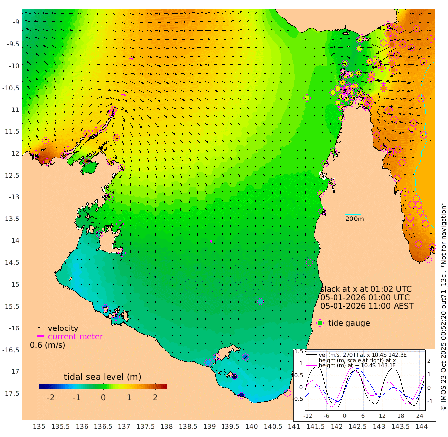 44cm/s 115T +3cm/s rms + 7cm/s -42T. ARA-GOC87 57m 28cm/s 164T +3cm/s rms + 2cm/s -2T. ARA-GOC87 60m 35cm/s 108T +2cm/s rms + 3cm/s 61T. ARA-GOC87 47m 147cm Daru 160cm Bobo Island 134cm Meer Island Barge 156cm Bramble Cay 160cm Unnamed Cay 175cm Pearce Cay 164cm Stephens Island 162cm Merrie England Shoals 153cm Mutacomal Reef 155cm Darnley Island Barge 146cm East Cay 151cm Yorke Island Barge 156cm Rennel Island 152cm Aureed Island 138cm Dungeness Reef 94cm Zagai Island 96cm Yam Island 52cm Dauan Island 46cm Saibai Island 52cm Phipi Reef 95cm Warrior Reef - West 48cm Mabuiag Island Barge 153cm Half Way Island 142cm Coconut Island 151cm Dugong Islet 120cm Poll Island 122cm Kirkcaldie Reef 92cm Suarji Island 109cm Sue Islet 97cm Hawkesbury Island 96cm Alert Patches 104cm Twin Island 78cm Badu Island 88cm St Pauls (Moa Island) 90cm Kubin (Moa Island) 83cm Ince Point 79cm Thursday Island 78cm Nardana Patches 84cm Turtle Head 76cm Round Island 88cm Goods Island 74cm Booby Island 82cm White Rocks Area 47cm Carpentaria 88cm Papou Point 92cm Bampfield Head 51cm Crab Island 75cm Red Wallis Island 90cm Packe Island 156cm Harrington Reef 76cm Herald Camp 7cm Sharp Point 74cm Red Island Point 83cm Possession Island 96cm Alpha Rock 125cm Frederick Point 154cm Wyborn Reef Light 146cm Tetley Island 124cm Triangle Reef 173cm Turtle Head Island 131cm Maclennan Cay 115cm Raine Island 153cm Mcsweeny Reef 145cm Collette Reef 124cm Shadwell Reef 160cm Hannibal Island 164cm Round Point 39cm Vrilya Point 144cm Cape Grenville 143cm Hicks Island 150cm Sir Charles Hardy Island 44cm Harvey Island 141cm Kay Reef 126cm Rocky Island 127cm Chapman Island 120cm Ham Reef 125cm Jubilee Reef 113cm Night Island 123cm Unnamed Reef No. 3 132cm Morris Island 122cm 1st 3 Mile Opening 127cm Creech Reef 129cm Fife Island 152cm Eden Reef 133cm Stanley Island 150cm Normanby River 125cm Yabooma Island 160cm Hutchison River 115cm Elcho Island 102cm North West Crocodile Island 124cm Cape Wessel 124cm Stevens Island 147cm Guluwuru Island 106cm Hopeful Bay 119cm Auster Point 121cm Two Island Bay 170cm Cadell Strait 197cm Mallison Island 117cm Melville Bay (Gove Harbour) 132cm Truant Island 79cm Cape Arnhem 24cm Cape Grey -5cm Hawk Island -75cm Milner Bay (Groote Eylandt) -80cm Cape Beatrice -144cm West Island -148cm Centre Island -134cm Mornington Island -127cm West Wellesley Islands -154cm Bountiful Island -204cm Albert River Mouth -228cm Sweers Island -200cm Karumba -78cm Nassau River Offshore -21cm Christmas Creek 19cm Archer River 37cm Boyd Point 35cm Weipa (Humbug Point) 25cm Pennefather River 35cm Cullen Point