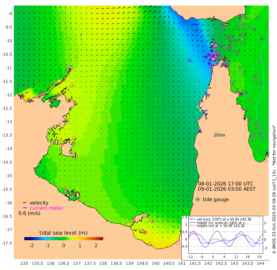 26cm/s 71T +3cm/s rms + 7cm/s -42T. ARA-GOC87 57m 12cm/s -1T +3cm/s rms + 2cm/s -2T. ARA-GOC87 60m 29cm/s 62T +2cm/s rms + 3cm/s 61T. ARA-GOC87 47m 6cm Daru 19cm Bobo Island 6cm Meer Island Barge 6cm Bramble Cay 0cm Unnamed Cay 14cm Pearce Cay 9cm Stephens Island 1cm Merrie England Shoals -6cm Mutacomal Reef 14cm Darnley Island Barge 3cm East Cay 12cm Yorke Island Barge -1cm Rennel Island 17cm Aureed Island -8cm Dungeness Reef -7cm Zagai Island -34cm Yam Island -44cm Dauan Island -36cm Saibai Island -40cm Phipi Reef -13cm Warrior Reef - West -69cm Mabuiag Island Barge -3cm Half Way Island 0cm Coconut Island -9cm Dugong Islet -17cm Poll Island -26cm Kirkcaldie Reef -29cm Suarji Island -15cm Sue Islet -171cm Hawkesbury Island -53cm Alert Patches -47cm Twin Island -132cm Badu Island -47cm St Pauls (Moa Island) -125cm Kubin (Moa Island) -74cm Ince Point -92cm Thursday Island -87cm Nardana Patches -113cm Turtle Head -140cm Round Island -151cm Goods Island -171cm Booby Island -163cm White Rocks Area -137cm Carpentaria -50cm Papou Point -177cm Bampfield Head -142cm Crab Island -163cm Red Wallis Island -139cm Packe Island -2cm Harrington Reef -181cm Herald Camp -8cm Sharp Point -107cm Red Island Point -79cm Possession Island -37cm Alpha Rock -26cm Frederick Point -2cm Wyborn Reef Light -8cm Tetley Island -1cm Triangle Reef -8cm Turtle Head Island -5cm Maclennan Cay -3cm Raine Island 9cm Mcsweeny Reef 8cm Collette Reef 2cm Shadwell Reef 11cm Hannibal Island 4cm Round Point -132cm Vrilya Point -3cm Cape Grenville -1cm Hicks Island -9cm Sir Charles Hardy Island 0cm Harvey Island -4cm Kay Reef -2cm Rocky Island -2cm Chapman Island -4cm Ham Reef -1cm Jubilee Reef 1cm Night Island -3cm Unnamed Reef No. 3 -1cm Morris Island -5cm 1st 3 Mile Opening -2cm Creech Reef 15cm Fife Island 2cm Eden Reef -4cm Stanley Island 0cm Normanby River -18cm Yabooma Island 3cm Hutchison River 2cm Elcho Island -8cm North West Crocodile Island 39cm Cape Wessel 24cm Stevens Island 74cm Guluwuru Island 16cm Hopeful Bay 28cm Auster Point 21cm Two Island Bay 49cm Cadell Strait 172cm Mallison Island 65cm Melville Bay (Gove Harbour) 67cm Truant Island 59cm Cape Arnhem 56cm Cape Grey 51cm Hawk Island 56cm Milner Bay (Groote Eylandt) 49cm Cape Beatrice 48cm West Island 44cm Centre Island 57cm Mornington Island 57cm West Wellesley Islands 58cm Bountiful Island 84cm Albert River Mouth 115cm Sweers Island 68cm Karumba 12cm Nassau River Offshore -27cm Christmas Creek -63cm Archer River -77cm Boyd Point -90cm Weipa (Humbug Point) -79cm Pennefather River -125cm Cullen Point
