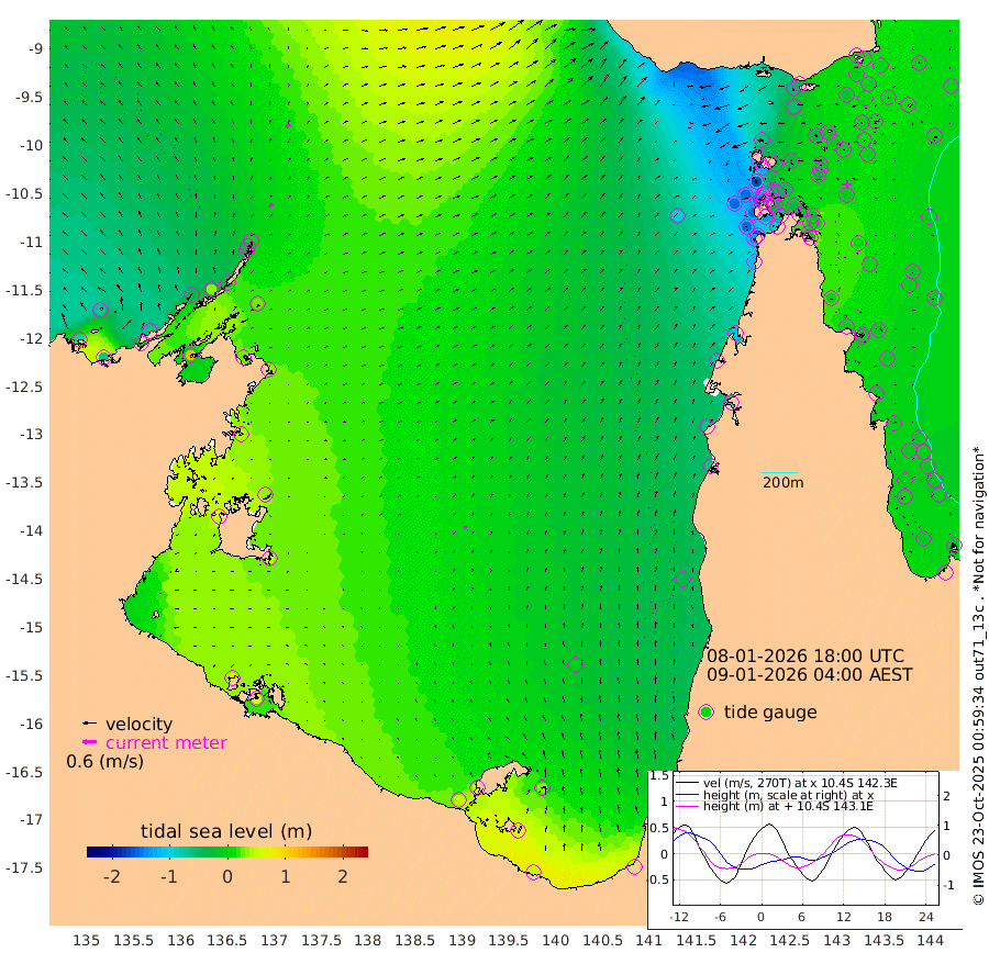 19cm/s 54T +3cm/s rms + 7cm/s -42T. ARA-GOC87 57m 14cm/s 17T +3cm/s rms + 2cm/s -2T. ARA-GOC87 60m 21cm/s 50T +2cm/s rms + 3cm/s 61T. ARA-GOC87 47m 1cm Daru 12cm Bobo Island 0cm Meer Island Barge -4cm Bramble Cay -5cm Unnamed Cay 3cm Pearce Cay 4cm Stephens Island -4cm Merrie England Shoals -10cm Mutacomal Reef 10cm Darnley Island Barge -5cm East Cay 8cm Yorke Island Barge -5cm Rennel Island 13cm Aureed Island -11cm Dungeness Reef -8cm Zagai Island -32cm Yam Island -54cm Dauan Island -40cm Saibai Island -53cm Phipi Reef -20cm Warrior Reef - West -66cm Mabuiag Island Barge -3cm Half Way Island -2cm Coconut Island -8cm Dugong Islet -17cm Poll Island -22cm Kirkcaldie Reef -24cm Suarji Island -11cm Sue Islet -167cm Hawkesbury Island -47cm Alert Patches -41cm Twin Island -133cm Badu Island -41cm St Pauls (Moa Island) -120cm Kubin (Moa Island) -67cm Ince Point -84cm Thursday Island -80cm Nardana Patches -109cm Turtle Head -131cm Round Island -145cm Goods Island -157cm Booby Island -153cm White Rocks Area -102cm Carpentaria -43cm Papou Point -155cm Bampfield Head -131cm Crab Island -151cm Red Wallis Island -134cm Packe Island 1cm Harrington Reef -167cm Herald Camp -4cm Sharp Point -103cm Red Island Point -69cm Possession Island -30cm Alpha Rock -23cm Frederick Point -6cm Wyborn Reef Light -10cm Tetley Island -8cm Triangle Reef -8cm Turtle Head Island -8cm Maclennan Cay -11cm Raine Island 4cm Mcsweeny Reef 2cm Collette Reef -5cm Shadwell Reef 4cm Hannibal Island -7cm Round Point -113cm Vrilya Point -7cm Cape Grenville -7cm Hicks Island -15cm Sir Charles Hardy Island -1cm Harvey Island -9cm Kay Reef -10cm Rocky Island -14cm Chapman Island -11cm Ham Reef -8cm Jubilee Reef -5cm Night Island -10cm Unnamed Reef No. 3 -8cm Morris Island -10cm 1st 3 Mile Opening -7cm Creech Reef 5cm Fife Island -9cm Eden Reef -10cm Stanley Island -9cm Normanby River -83cm Yabooma Island -73cm Hutchison River -62cm Elcho Island -70cm North West Crocodile Island 1cm Cape Wessel -37cm Stevens Island 35cm Guluwuru Island -40cm Hopeful Bay -17cm Auster Point -22cm Two Island Bay -23cm Cadell Strait 121cm Mallison Island 26cm Melville Bay (Gove Harbour) 28cm Truant Island 35cm Cape Arnhem 41cm Cape Grey 36cm Hawk Island 54cm Milner Bay (Groote Eylandt) 47cm Cape Beatrice 63cm West Island 61cm Centre Island 48cm Mornington Island 49cm West Wellesley Islands 35cm Bountiful Island 50cm Albert River Mouth 81cm Sweers Island 35cm Karumba -4cm Nassau River Offshore -37cm Christmas Creek -67cm Archer River -71cm Boyd Point -91cm Weipa (Humbug Point) -70cm Pennefather River -110cm Cullen Point
