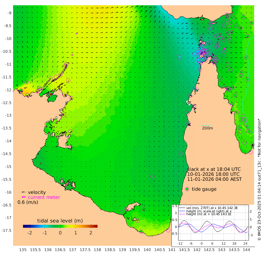 27cm/s 90T +3cm/s rms + 7cm/s -42T. ARA-GOC87 57m 4cm/s 31T +3cm/s rms + 2cm/s -2T. ARA-GOC87 60m 27cm/s 80T +2cm/s rms + 3cm/s 61T. ARA-GOC87 47m -13cm Daru 1cm Bobo Island 13cm Meer Island Barge 8cm Bramble Cay -9cm Unnamed Cay 1cm Pearce Cay 0cm Stephens Island -5cm Merrie England Shoals -22cm Mutacomal Reef 8cm Darnley Island Barge 12cm East Cay -2cm Yorke Island Barge -15cm Rennel Island -1cm Aureed Island -27cm Dungeness Reef -30cm Zagai Island -54cm Yam Island -53cm Dauan Island -40cm Saibai Island -50cm Phipi Reef -35cm Warrior Reef - West -62cm Mabuiag Island Barge -19cm Half Way Island -16cm Coconut Island -29cm Dugong Islet -38cm Poll Island -43cm Kirkcaldie Reef -53cm Suarji Island -31cm Sue Islet -110cm Hawkesbury Island -58cm Alert Patches -57cm Twin Island -84cm Badu Island -62cm St Pauls (Moa Island) -94cm Kubin (Moa Island) -71cm Ince Point -79cm Thursday Island -77cm Nardana Patches -84cm Turtle Head -99cm Round Island -96cm Goods Island -103cm Booby Island -105cm White Rocks Area -78cm Carpentaria -57cm Papou Point -107cm Bampfield Head -83cm Crab Island -103cm Red Wallis Island -99cm Packe Island -25cm Harrington Reef -126cm Herald Camp -18cm Sharp Point -74cm Red Island Point -70cm Possession Island -50cm Alpha Rock -41cm Frederick Point -18cm Wyborn Reef Light -24cm Tetley Island 5cm Triangle Reef -20cm Turtle Head Island 1cm Maclennan Cay 14cm Raine Island -1cm Mcsweeny Reef 4cm Collette Reef 10cm Shadwell Reef 6cm Hannibal Island 7cm Round Point -73cm Vrilya Point 2cm Cape Grenville 5cm Hicks Island 1cm Sir Charles Hardy Island 0cm Harvey Island 10cm Kay Reef 13cm Rocky Island 18cm Chapman Island 15cm Ham Reef 14cm Jubilee Reef 10cm Night Island 16cm Unnamed Reef No. 3 14cm Morris Island 10cm 1st 3 Mile Opening 13cm Creech Reef 25cm Fife Island 21cm Eden Reef 11cm Stanley Island 13cm Normanby River 9cm Yabooma Island 32cm Hutchison River 27cm Elcho Island 16cm North West Crocodile Island 50cm Cape Wessel 43cm Stevens Island 79cm Guluwuru Island 38cm Hopeful Bay 42cm Auster Point 34cm Two Island Bay 68cm Cadell Strait 188cm Mallison Island 68cm Melville Bay (Gove Harbour) 72cm Truant Island 57cm Cape Arnhem 44cm Cape Grey 34cm Hawk Island 22cm Milner Bay (Groote Eylandt) 14cm Cape Beatrice -2cm West Island -4cm Centre Island 8cm Mornington Island 4cm West Wellesley Islands 3cm Bountiful Island 14cm Albert River Mouth 38cm Sweers Island 6cm Karumba -12cm Nassau River Offshore -26cm Christmas Creek -30cm Archer River -41cm Boyd Point -49cm Weipa (Humbug Point) -37cm Pennefather River -74cm Cullen Point