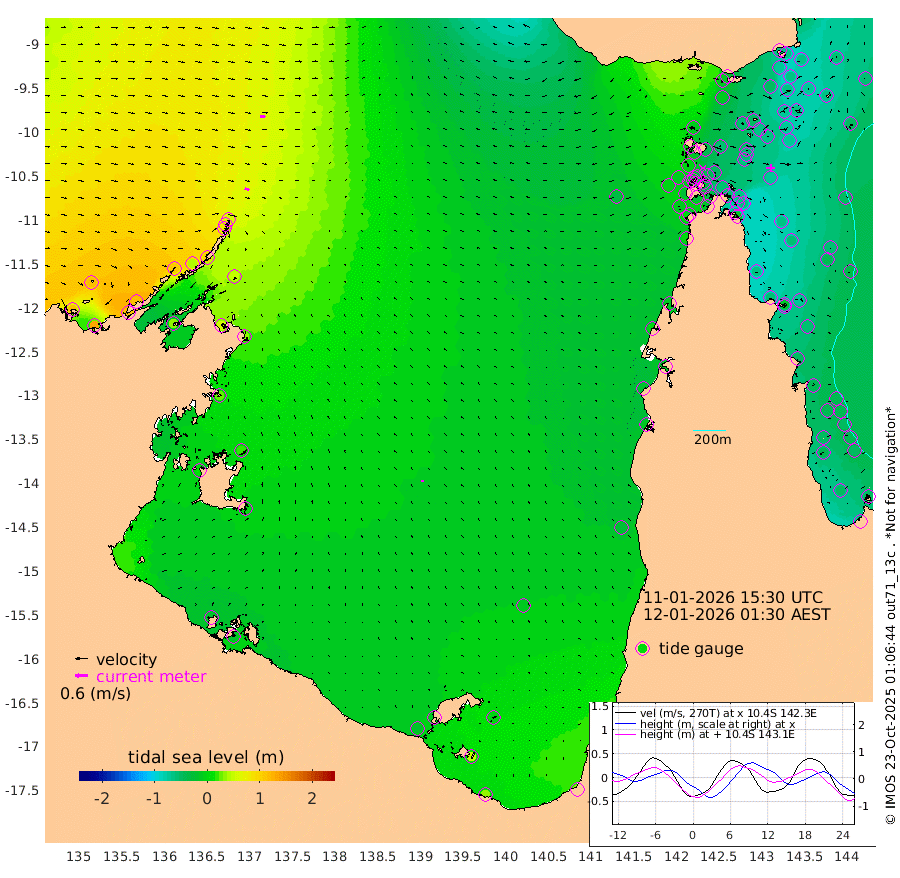 22cm/s 112T +3cm/s rms + 7cm/s -42T. ARA-GOC87 57m 10cm/s -20T +3cm/s rms + 2cm/s -2T. ARA-GOC87 60m 23cm/s 100T +2cm/s rms + 3cm/s 61T. ARA-GOC87 47m -63cm Daru -66cm Bobo Island -49cm Meer Island Barge -57cm Bramble Cay -67cm Unnamed Cay -61cm Pearce Cay -68cm Stephens Island -67cm Merrie England Shoals -69cm Mutacomal Reef -64cm Darnley Island Barge -57cm East Cay -65cm Yorke Island Barge -68cm Rennel Island -69cm Aureed Island -61cm Dungeness Reef -47cm Zagai Island -55cm Yam Island -11cm Dauan Island -21cm Saibai Island -13cm Phipi Reef -46cm Warrior Reef - West -13cm Mabuiag Island Barge -69cm Half Way Island -63cm Coconut Island -74cm Dugong Islet -57cm Poll Island -64cm Kirkcaldie Reef -57cm Suarji Island -56cm Sue Islet -2cm Hawkesbury Island -45cm Alert Patches -51cm Twin Island 7cm Badu Island -44cm St Pauls (Moa Island) -19cm Kubin (Moa Island) -36cm Ince Point -29cm Thursday Island -30cm Nardana Patches -21cm Turtle Head -16cm Round Island -9cm Goods Island -7cm Booby Island -13cm White Rocks Area -36cm Carpentaria -42cm Papou Point -24cm Bampfield Head 2cm Crab Island -14cm Red Wallis Island -23cm Packe Island -78cm Harrington Reef -28cm Herald Camp -14cm Sharp Point -17cm Red Island Point -35cm Possession Island -54cm Alpha Rock -59cm Frederick Point -63cm Wyborn Reef Light -61cm Tetley Island -45cm Triangle Reef -58cm Turtle Head Island -56cm Maclennan Cay -37cm Raine Island -63cm Mcsweeny Reef -59cm Collette Reef -45cm Shadwell Reef -64cm Hannibal Island -56cm Round Point 0cm Vrilya Point -62cm Cape Grenville -55cm Hicks Island -68cm Sir Charles Hardy Island -20cm Harvey Island -57cm Kay Reef -47cm Rocky Island -41cm Chapman Island -45cm Ham Reef -45cm Jubilee Reef -44cm Night Island -46cm Unnamed Reef No. 3 -49cm Morris Island -44cm 1st 3 Mile Opening -49cm Creech Reef -44cm Fife Island -51cm Eden Reef -52cm Stanley Island -57cm Normanby River 119cm Yabooma Island 128cm Hutchison River 117cm Elcho Island 115cm North West Crocodile Island 57cm Cape Wessel 111cm Stevens Island 42cm Guluwuru Island 100cm Hopeful Bay 80cm Auster Point 79cm Two Island Bay 119cm Cadell Strait 32cm Mallison Island 53cm Melville Bay (Gove Harbour) 52cm Truant Island 31cm Cape Arnhem 23cm Cape Grey 22cm Hawk Island 14cm Milner Bay (Groote Eylandt) 4cm Cape Beatrice -18cm West Island -19cm Centre Island -10cm Mornington Island -16cm West Wellesley Islands 0cm Bountiful Island 31cm Albert River Mouth 50cm Sweers Island 31cm Karumba -11cm Nassau River Offshore -23cm Christmas Creek -8cm Archer River -18cm Boyd Point -11cm Weipa (Humbug Point) 7cm Pennefather River -12cm Cullen Point