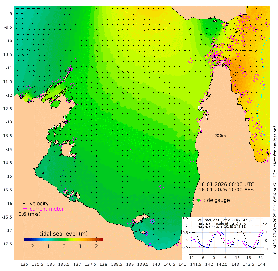9cm/s 153T +3cm/s rms + 7cm/s -42T. ARA-GOC87 57m 25cm/s 163T +3cm/s rms + 2cm/s -2T. ARA-GOC87 60m 7cm/s -155T +2cm/s rms + 3cm/s 61T. ARA-GOC87 47m 132cm Daru 136cm Bobo Island 91cm Meer Island Barge 118cm Bramble Cay 137cm Unnamed Cay 141cm Pearce Cay 129cm Stephens Island 141cm Merrie England Shoals 146cm Mutacomal Reef 120cm Darnley Island Barge 104cm East Cay 126cm Yorke Island Barge 136cm Rennel Island 134cm Aureed Island 128cm Dungeness Reef 103cm Zagai Island 104cm Yam Island 68cm Dauan Island 70cm Saibai Island 79cm Phipi Reef 105cm Warrior Reef - West 76cm Mabuiag Island Barge 129cm Half Way Island 139cm Coconut Island 135cm Dugong Islet 124cm Poll Island 123cm Kirkcaldie Reef 123cm Suarji Island 118cm Sue Islet 100cm Hawkesbury Island 126cm Alert Patches 124cm Twin Island 86cm Badu Island 112cm St Pauls (Moa Island) 94cm Kubin (Moa Island) 106cm Ince Point 101cm Thursday Island 102cm Nardana Patches 99cm Turtle Head 95cm Round Island 92cm Goods Island 83cm Booby Island 91cm White Rocks Area 73cm Carpentaria 100cm Papou Point 112cm Bampfield Head 59cm Crab Island 87cm Red Wallis Island 101cm Packe Island 149cm Harrington Reef 92cm Herald Camp 25cm Sharp Point 86cm Red Island Point 108cm Possession Island 119cm Alpha Rock 134cm Frederick Point 147cm Wyborn Reef Light 145cm Tetley Island 97cm Triangle Reef 149cm Turtle Head Island 95cm Maclennan Cay 74cm Raine Island 129cm Mcsweeny Reef 123cm Collette Reef 94cm Shadwell Reef 133cm Hannibal Island 127cm Round Point 54cm Vrilya Point 115cm Cape Grenville 103cm Hicks Island 109cm Sir Charles Hardy Island 33cm Harvey Island 107cm Kay Reef 88cm Rocky Island 90cm Chapman Island 83cm Ham Reef 84cm Jubilee Reef 80cm Night Island 88cm Unnamed Reef No. 3 90cm Morris Island 80cm 1st 3 Mile Opening 87cm Creech Reef 87cm Fife Island 96cm Eden Reef 92cm Stanley Island 99cm Normanby River -43cm Yabooma Island -36cm Hutchison River -47cm Elcho Island -53cm North West Crocodile Island -1cm Cape Wessel -28cm Stevens Island 12cm Guluwuru Island -24cm Hopeful Bay -11cm Auster Point -24cm Two Island Bay -29cm Cadell Strait 74cm Mallison Island 4cm Melville Bay (Gove Harbour) 11cm Truant Island 5cm Cape Arnhem -14cm Cape Grey -15cm Hawk Island -54cm Milner Bay (Groote Eylandt) -51cm Cape Beatrice -68cm West Island -65cm Centre Island -63cm Mornington Island -58cm West Wellesley Islands -86cm Bountiful Island -142cm Albert River Mouth -146cm Sweers Island -128cm Karumba -29cm Nassau River Offshore 13cm Christmas Creek 39cm Archer River 50cm Boyd Point 46cm Weipa (Humbug Point) 42cm Pennefather River 53cm Cullen Point