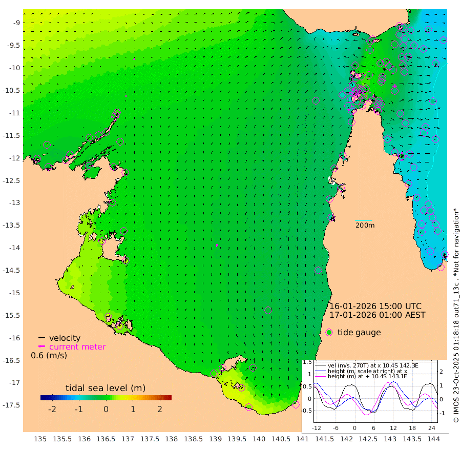 12cm/s 56T +3cm/s rms + 7cm/s -42T. ARA-GOC87 57m 27cm/s 9T +3cm/s rms + 2cm/s -2T. ARA-GOC87 60m 15cm/s 70T +2cm/s rms + 3cm/s 61T. ARA-GOC87 47m -58cm Daru -53cm Bobo Island -81cm Meer Island Barge -85cm Bramble Cay -78cm Unnamed Cay -62cm Pearce Cay -74cm Stephens Island -82cm Merrie England Shoals -63cm Mutacomal Reef -76cm Darnley Island Barge -87cm East Cay -63cm Yorke Island Barge -64cm Rennel Island -50cm Aureed Island -52cm Dungeness Reef -20cm Zagai Island -29cm Yam Island -27cm Dauan Island -24cm Saibai Island -46cm Phipi Reef -29cm Warrior Reef - West -23cm Mabuiag Island Barge -57cm Half Way Island -46cm Coconut Island -53cm Dugong Islet -31cm Poll Island -46cm Kirkcaldie Reef -20cm Suarji Island -36cm Sue Islet -90cm Hawkesbury Island -37cm Alert Patches -28cm Twin Island -69cm Badu Island -17cm St Pauls (Moa Island) -61cm Kubin (Moa Island) -34cm Ince Point -39cm Thursday Island -38cm Nardana Patches -63cm Turtle Head -76cm Round Island -84cm Goods Island -83cm Booby Island -73cm White Rocks Area -50cm Carpentaria -21cm Papou Point -101cm Bampfield Head -69cm Crab Island -71cm Red Wallis Island -70cm Packe Island -45cm Harrington Reef -100cm Herald Camp 3cm Sharp Point -60cm Red Island Point -46cm Possession Island -25cm Alpha Rock -35cm Frederick Point -53cm Wyborn Reef Light -46cm Tetley Island -67cm Triangle Reef -58cm Turtle Head Island -78cm Maclennan Cay -83cm Raine Island -67cm Mcsweeny Reef -76cm Collette Reef -82cm Shadwell Reef -83cm Hannibal Island -87cm Round Point -58cm Vrilya Point -86cm Cape Grenville -85cm Hicks Island -97cm Sir Charles Hardy Island -26cm Harvey Island -95cm Kay Reef -89cm Rocky Island -89cm Chapman Island -87cm Ham Reef -86cm Jubilee Reef -74cm Night Island -85cm Unnamed Reef No. 3 -91cm Morris Island -88cm 1st 3 Mile Opening -87cm Creech Reef -76cm Fife Island -105cm Eden Reef -95cm Stanley Island -95cm Normanby River -7cm Yabooma Island -18cm Hutchison River -3cm Elcho Island 0cm North West Crocodile Island 17cm Cape Wessel 8cm Stevens Island -11cm Guluwuru Island -5cm Hopeful Bay 8cm Auster Point 11cm Two Island Bay -2cm Cadell Strait -46cm Mallison Island -2cm Melville Bay (Gove Harbour) 2cm Truant Island 5cm Cape Arnhem 11cm Cape Grey 14cm Hawk Island 50cm Milner Bay (Groote Eylandt) 40cm Cape Beatrice 63cm West Island 60cm Centre Island 10cm Mornington Island 16cm West Wellesley Islands -3cm Bountiful Island 28cm Albert River Mouth 47cm Sweers Island 12cm Karumba -30cm Nassau River Offshore -63cm Christmas Creek -75cm Archer River -68cm Boyd Point -82cm Weipa (Humbug Point) -52cm Pennefather River -63cm Cullen Point