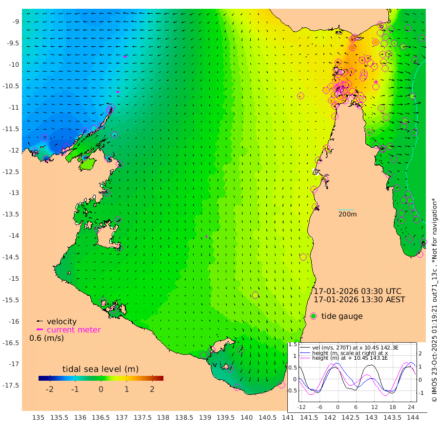 29cm/s -89T +3cm/s rms + 7cm/s -42T. ARA-GOC87 57m 26cm/s 176T +3cm/s rms + 2cm/s -2T. ARA-GOC87 60m 36cm/s -93T +2cm/s rms + 3cm/s 61T. ARA-GOC87 47m 63cm Daru 52cm Bobo Island 1cm Meer Island Barge 4cm Bramble Cay 29cm Unnamed Cay 45cm Pearce Cay 27cm Stephens Island 16cm Merrie England Shoals 51cm Mutacomal Reef 23cm Darnley Island Barge 5cm East Cay 44cm Yorke Island Barge 53cm Rennel Island 60cm Aureed Island 81cm Dungeness Reef 111cm Zagai Island 115cm Yam Island 160cm Dauan Island 146cm Saibai Island 152cm Phipi Reef 133cm Warrior Reef - West 131cm Mabuiag Island Barge 46cm Half Way Island 75cm Coconut Island 66cm Dugong Islet 97cm Poll Island 91cm Kirkcaldie Reef 137cm Suarji Island 95cm Sue Islet 124cm Hawkesbury Island 127cm Alert Patches 122cm Twin Island 124cm Badu Island 136cm St Pauls (Moa Island) 123cm Kubin (Moa Island) 127cm Ince Point 126cm Thursday Island 128cm Nardana Patches 128cm Turtle Head 121cm Round Island 115cm Goods Island 110cm Booby Island 107cm White Rocks Area 87cm Carpentaria 112cm Papou Point 123cm Bampfield Head 91cm Crab Island 113cm Red Wallis Island 123cm Packe Island 75cm Harrington Reef 139cm Herald Camp 41cm Sharp Point 112cm Red Island Point 120cm Possession Island 100cm Alpha Rock 102cm Frederick Point 61cm Wyborn Reef Light 71cm Tetley Island 23cm Triangle Reef 57cm Turtle Head Island 15cm Maclennan Cay -5cm Raine Island 36cm Mcsweeny Reef 25cm Collette Reef 7cm Shadwell Reef 16cm Hannibal Island 8cm Round Point 75cm Vrilya Point 6cm Cape Grenville 9cm Hicks Island 18cm Sir Charles Hardy Island 4cm Harvey Island -8cm Kay Reef -1cm Rocky Island -1cm Chapman Island -2cm Ham Reef -4cm Jubilee Reef 1cm Night Island -1cm Unnamed Reef No. 3 -6cm Morris Island -3cm 1st 3 Mile Opening -1cm Creech Reef 3cm Fife Island -21cm Eden Reef -11cm Stanley Island -16cm Normanby River -141cm Yabooma Island -161cm Hutchison River -152cm Elcho Island -144cm North West Crocodile Island -100cm Cape Wessel -148cm Stevens Island -95cm Guluwuru Island -132cm Hopeful Bay -111cm Auster Point -116cm Two Island Bay -143cm Cadell Strait -128cm Mallison Island -84cm Melville Bay (Gove Harbour) -85cm Truant Island -53cm Cape Arnhem -45cm Cape Grey -35cm Hawk Island -44cm Milner Bay (Groote Eylandt) -31cm Cape Beatrice -13cm West Island -13cm Centre Island 11cm Mornington Island 11cm West Wellesley Islands 6cm Bountiful Island -41cm Albert River Mouth -51cm Sweers Island -15cm Karumba 40cm Nassau River Offshore 66cm Christmas Creek 62cm Archer River 74cm Boyd Point 75cm Weipa (Humbug Point) 51cm Pennefather River 85cm Cullen Point