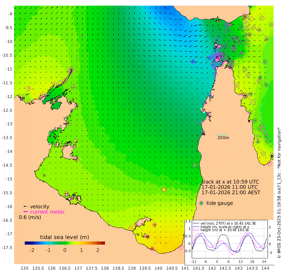 13cm/s 31T +3cm/s rms + 7cm/s -42T. ARA-GOC87 57m 18cm/s -36T +3cm/s rms + 2cm/s -2T. ARA-GOC87 60m 19cm/s 39T +2cm/s rms + 3cm/s 61T. ARA-GOC87 47m 23cm Daru 28cm Bobo Island 23cm Meer Island Barge 42cm Bramble Cay 39cm Unnamed Cay 28cm Pearce Cay 31cm Stephens Island 50cm Merrie England Shoals 37cm Mutacomal Reef 29cm Darnley Island Barge 30cm East Cay 23cm Yorke Island Barge 22cm Rennel Island 18cm Aureed Island 5cm Dungeness Reef -23cm Zagai Island -23cm Yam Island -70cm Dauan Island -59cm Saibai Island -40cm Phipi Reef -26cm Warrior Reef - West -73cm Mabuiag Island Barge 22cm Half Way Island 7cm Coconut Island 12cm Dugong Islet -11cm Poll Island -4cm Kirkcaldie Reef -40cm Suarji Island -11cm Sue Islet -119cm Hawkesbury Island -49cm Alert Patches -44cm Twin Island -108cm Badu Island -55cm St Pauls (Moa Island) -103cm Kubin (Moa Island) -69cm Ince Point -83cm Thursday Island -80cm Nardana Patches -96cm Turtle Head -108cm Round Island -119cm Goods Island -143cm Booby Island -126cm White Rocks Area -148cm Carpentaria -47cm Papou Point -161cm Bampfield Head -119cm Crab Island -134cm Red Wallis Island -108cm Packe Island 11cm Harrington Reef -136cm Herald Camp -9cm Sharp Point -73cm Red Island Point -70cm Possession Island -28cm Alpha Rock -20cm Frederick Point 19cm Wyborn Reef Light 9cm Tetley Island 10cm Triangle Reef 7cm Turtle Head Island 14cm Maclennan Cay 15cm Raine Island 26cm Mcsweeny Reef 32cm Collette Reef 23cm Shadwell Reef 42cm Hannibal Island 40cm Round Point -118cm Vrilya Point 35cm Cape Grenville 27cm Hicks Island 20cm Sir Charles Hardy Island 8cm Harvey Island 38cm Kay Reef 23cm Rocky Island 22cm Chapman Island 16cm Ham Reef 20cm Jubilee Reef 17cm Night Island 18cm Unnamed Reef No. 3 25cm Morris Island 10cm 1st 3 Mile Opening 17cm Creech Reef 19cm Fife Island 33cm Eden Reef 28cm Stanley Island 39cm Normanby River 52cm Yabooma Island 63cm Hutchison River 56cm Elcho Island 60cm North West Crocodile Island 28cm Cape Wessel 63cm Stevens Island 39cm Guluwuru Island 57cm Hopeful Bay 34cm Auster Point 31cm Two Island Bay 61cm Cadell Strait 92cm Mallison Island 36cm Melville Bay (Gove Harbour) 27cm Truant Island 21cm Cape Arnhem 37cm Cape Grey 44cm Hawk Island 57cm Milner Bay (Groote Eylandt) 60cm Cape Beatrice 64cm West Island 62cm Centre Island 99cm Mornington Island 99cm West Wellesley Islands 134cm Bountiful Island 173cm Albert River Mouth 182cm Sweers Island 161cm Karumba 69cm Nassau River Offshore 18cm Christmas Creek -30cm Archer River -68cm Boyd Point -64cm Weipa (Humbug Point) -70cm Pennefather River -110cm Cullen Point
