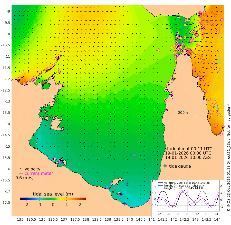 30cm/s 121T +3cm/s rms + 7cm/s -42T. ARA-GOC87 57m 23cm/s 164T +3cm/s rms + 2cm/s -2T. ARA-GOC87 60m 22cm/s 120T +2cm/s rms + 3cm/s 61T. ARA-GOC87 47m 137cm Daru 136cm Bobo Island 115cm Meer Island Barge 143cm Bramble Cay 157cm Unnamed Cay 146cm Pearce Cay 146cm Stephens Island 163cm Merrie England Shoals 155cm Mutacomal Reef 135cm Darnley Island Barge 123cm East Cay 133cm Yorke Island Barge 144cm Rennel Island 127cm Aureed Island 124cm Dungeness Reef 82cm Zagai Island 89cm Yam Island 44cm Dauan Island 35cm Saibai Island 46cm Phipi Reef 79cm Warrior Reef - West 51cm Mabuiag Island Barge 141cm Half Way Island 129cm Coconut Island 140cm Dugong Islet 112cm Poll Island 115cm Kirkcaldie Reef 86cm Suarji Island 102cm Sue Islet 104cm Hawkesbury Island 100cm Alert Patches 101cm Twin Island 84cm Badu Island 87cm St Pauls (Moa Island) 96cm Kubin (Moa Island) 87cm Ince Point 85cm Thursday Island 85cm Nardana Patches 91cm Turtle Head 91cm Round Island 97cm Goods Island 88cm Booby Island 95cm White Rocks Area 62cm Carpentaria 80cm Papou Point 112cm Bampfield Head 62cm Crab Island 86cm Red Wallis Island 100cm Packe Island 143cm Harrington Reef 89cm Herald Camp 10cm Sharp Point 67cm Red Island Point 85cm Possession Island 103cm Alpha Rock 118cm Frederick Point 152cm Wyborn Reef Light 145cm Tetley Island 106cm Triangle Reef 162cm Turtle Head Island 112cm Maclennan Cay 98cm Raine Island 141cm Mcsweeny Reef 136cm Collette Reef 114cm Shadwell Reef 151cm Hannibal Island 150cm Round Point 54cm Vrilya Point 135cm Cape Grenville 124cm Hicks Island 131cm Sir Charles Hardy Island 39cm Harvey Island 131cm Kay Reef 109cm Rocky Island 107cm Chapman Island 101cm Ham Reef 107cm Jubilee Reef 99cm Night Island 104cm Unnamed Reef No. 3 115cm Morris Island 108cm 1st 3 Mile Opening 109cm Creech Reef 106cm Fife Island 129cm Eden Reef 120cm Stanley Island 129cm Normanby River 99cm Yabooma Island 123cm Hutchison River 90cm Elcho Island 77cm North West Crocodile Island 86cm Cape Wessel 103cm Stevens Island 105cm Guluwuru Island 86cm Hopeful Bay 88cm Auster Point 86cm Two Island Bay 111cm Cadell Strait 180cm Mallison Island 84cm Melville Bay (Gove Harbour) 96cm Truant Island 54cm Cape Arnhem 11cm Cape Grey -6cm Hawk Island -61cm Milner Bay (Groote Eylandt) -65cm Cape Beatrice -115cm West Island -118cm Centre Island -115cm Mornington Island -107cm West Wellesley Islands -136cm Bountiful Island -171cm Albert River Mouth -196cm Sweers Island -174cm Karumba -69cm Nassau River Offshore -17cm Christmas Creek 22cm Archer River 39cm Boyd Point 40cm Weipa (Humbug Point) 38cm Pennefather River 46cm Cullen Point