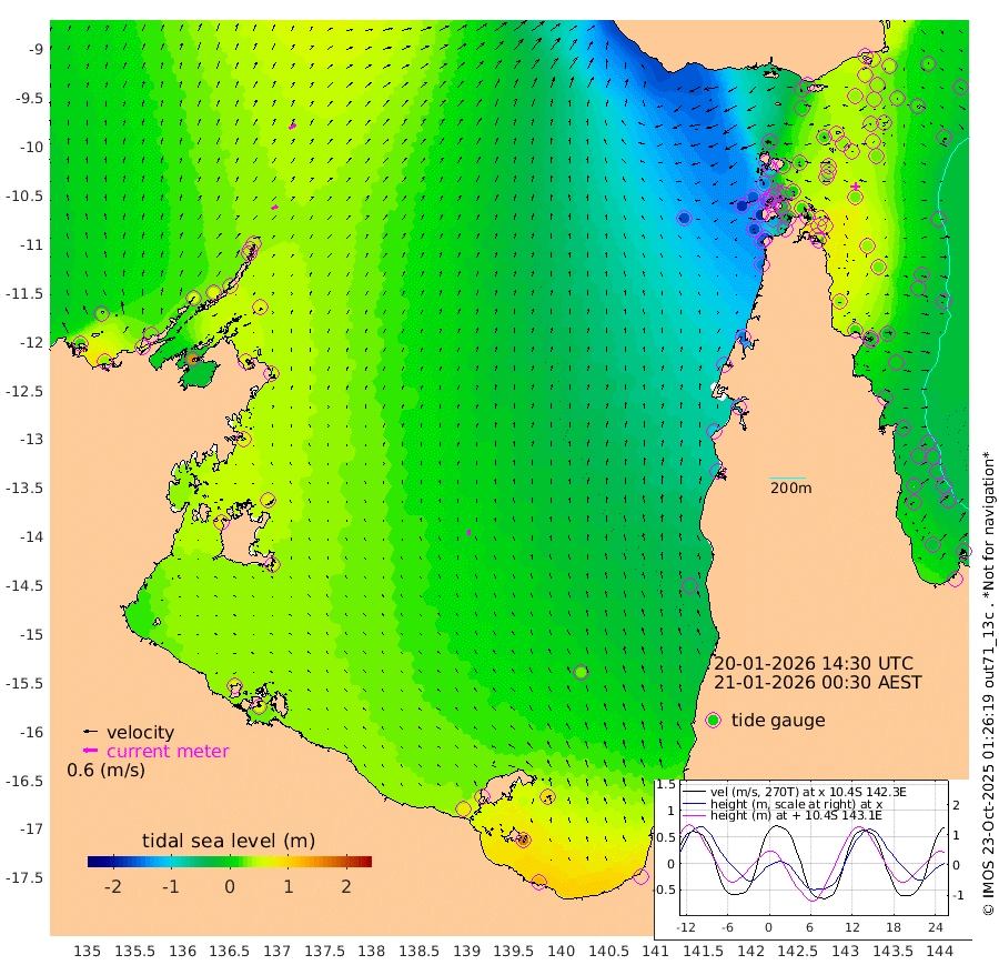 26cm/s 60T +3cm/s rms + 7cm/s -42T. ARA-GOC87 57m 22cm/s -6T +3cm/s rms + 2cm/s -2T. ARA-GOC87 60m 33cm/s 54T +2cm/s rms + 3cm/s 61T. ARA-GOC87 47m 50cm Daru 51cm Bobo Island -7cm Meer Island Barge 17cm Bramble Cay 37cm Unnamed Cay 37cm Pearce Cay 25cm Stephens Island 39cm Merrie England Shoals 50cm Mutacomal Reef 22cm Darnley Island Barge -6cm East Cay 35cm Yorke Island Barge 31cm Rennel Island 38cm Aureed Island 32cm Dungeness Reef 38cm Zagai Island 21cm Yam Island -7cm Dauan Island 4cm Saibai Island 12cm Phipi Reef 32cm Warrior Reef - West -23cm Mabuiag Island Barge 29cm Half Way Island 41cm Coconut Island 29cm Dugong Islet 31cm Poll Island 23cm Kirkcaldie Reef 21cm Suarji Island 35cm Sue Islet -142cm Hawkesbury Island -2cm Alert Patches 3cm Twin Island -108cm Badu Island 6cm St Pauls (Moa Island) -101cm Kubin (Moa Island) -34cm Ince Point -58cm Thursday Island -51cm Nardana Patches -93cm Turtle Head -110cm Round Island -147cm Goods Island -181cm Booby Island -162cm White Rocks Area -172cm Carpentaria -3cm Papou Point -181cm Bampfield Head -152cm Crab Island -171cm Red Wallis Island -127cm Packe Island 41cm Harrington Reef -169cm Herald Camp 13cm Sharp Point -78cm Red Island Point -37cm Possession Island 17cm Alpha Rock 22cm Frederick Point 51cm Wyborn Reef Light 48cm Tetley Island -5cm Triangle Reef 39cm Turtle Head Island -16cm Maclennan Cay -27cm Raine Island 31cm Mcsweeny Reef 27cm Collette Reef -2cm Shadwell Reef 31cm Hannibal Island 16cm Round Point -149cm Vrilya Point 3cm Cape Grenville -4cm Hicks Island -20cm Sir Charles Hardy Island 0cm Harvey Island -7cm Kay Reef -18cm Rocky Island -23cm Chapman Island -28cm Ham Reef -21cm Jubilee Reef -18cm Night Island -27cm Unnamed Reef No. 3 -20cm Morris Island -31cm 1st 3 Mile Opening -26cm Creech Reef -11cm Fife Island -28cm Eden Reef -22cm Stanley Island -16cm Normanby River 21cm Yabooma Island 33cm Hutchison River 27cm Elcho Island 27cm North West Crocodile Island 43cm Cape Wessel 59cm Stevens Island 64cm Guluwuru Island 45cm Hopeful Bay 45cm Auster Point 36cm Two Island Bay 65cm Cadell Strait 153cm Mallison Island 64cm Melville Bay (Gove Harbour) 62cm Truant Island 51cm Cape Arnhem 63cm Cape Grey 65cm Hawk Island 76cm Milner Bay (Groote Eylandt) 65cm Cape Beatrice 70cm West Island 66cm Centre Island 77cm Mornington Island 77cm West Wellesley Islands 96cm Bountiful Island 124cm Albert River Mouth 167cm Sweers Island 114cm Karumba 23cm Nassau River Offshore -32cm Christmas Creek -77cm Archer River -101cm Boyd Point -113cm Weipa (Humbug Point) -93cm Pennefather River -144cm Cullen Point