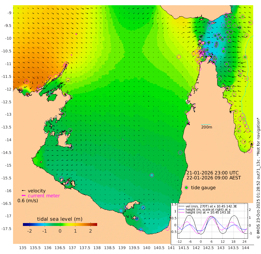 20cm/s 138T +3cm/s rms + 7cm/s -42T. ARA-GOC87 57m 5cm/s 25T +3cm/s rms + 2cm/s -2T. ARA-GOC87 60m 24cm/s 133T +2cm/s rms + 3cm/s 61T. ARA-GOC87 47m -29cm Daru -14cm Bobo Island 40cm Meer Island Barge 28cm Bramble Cay 4cm Unnamed Cay 10cm Pearce Cay 16cm Stephens Island 6cm Merrie England Shoals -21cm Mutacomal Reef 14cm Darnley Island Barge 41cm East Cay -5cm Yorke Island Barge -2cm Rennel Island -10cm Aureed Island -20cm Dungeness Reef -59cm Zagai Island -49cm Yam Island -72cm Dauan Island -75cm Saibai Island -79cm Phipi Reef -71cm Warrior Reef - West -31cm Mabuiag Island Barge 1cm Half Way Island -25cm Coconut Island -7cm Dugong Islet -33cm Poll Island -29cm Kirkcaldie Reef -44cm Suarji Island -42cm Sue Islet 75cm Hawkesbury Island -28cm Alert Patches -29cm Twin Island 45cm Badu Island -42cm St Pauls (Moa Island) 38cm Kubin (Moa Island) -12cm Ince Point 6cm Thursday Island 0cm Nardana Patches 30cm Turtle Head 42cm Round Island 80cm Goods Island 101cm Booby Island 102cm White Rocks Area 88cm Carpentaria -21cm Papou Point 104cm Bampfield Head 72cm Crab Island 87cm Red Wallis Island 47cm Packe Island -15cm Harrington Reef 65cm Herald Camp -33cm Sharp Point 27cm Red Island Point -1cm Possession Island -35cm Alpha Rock -27cm Frederick Point -22cm Wyborn Reef Light -28cm Tetley Island 24cm Triangle Reef 5cm Turtle Head Island 40cm Maclennan Cay 51cm Raine Island 4cm Mcsweeny Reef 6cm Collette Reef 27cm Shadwell Reef 12cm Hannibal Island 30cm Round Point 69cm Vrilya Point 31cm Cape Grenville 37cm Hicks Island 42cm Sir Charles Hardy Island 9cm Harvey Island 45cm Kay Reef 47cm Rocky Island 50cm Chapman Island 50cm Ham Reef 49cm Jubilee Reef 37cm Night Island 50cm Unnamed Reef No. 3 52cm Morris Island 58cm 1st 3 Mile Opening 52cm Creech Reef 37cm Fife Island 70cm Eden Reef 54cm Stanley Island 62cm Normanby River 177cm Yabooma Island 195cm Hutchison River 169cm Elcho Island 160cm North West Crocodile Island 102cm Cape Wessel 132cm Stevens Island 69cm Guluwuru Island 122cm Hopeful Bay 117cm Auster Point 118cm Two Island Bay 134cm Cadell Strait -74cm Mallison Island 60cm Melville Bay (Gove Harbour) 68cm Truant Island 29cm Cape Arnhem 9cm Cape Grey -16cm Hawk Island -34cm Milner Bay (Groote Eylandt) -41cm Cape Beatrice -76cm West Island -78cm Centre Island -113cm Mornington Island -103cm West Wellesley Islands -107cm Bountiful Island -122cm Albert River Mouth -140cm Sweers Island -134cm Karumba -86cm Nassau River Offshore -51cm Christmas Creek 7cm Archer River 26cm Boyd Point 37cm Weipa (Humbug Point) 30cm Pennefather River 52cm Cullen Point