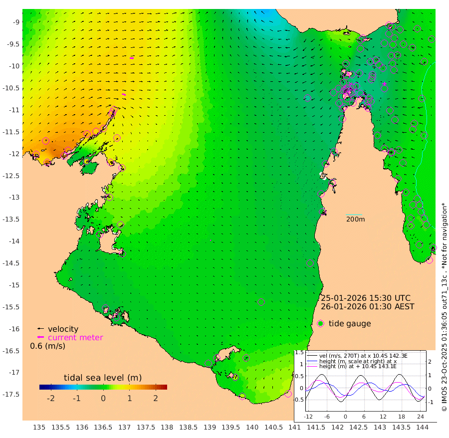 34cm/s 107T +3cm/s rms + 7cm/s -42T. ARA-GOC87 57m 6cm/s -56T +3cm/s rms + 2cm/s -2T. ARA-GOC87 60m 34cm/s 95T +2cm/s rms + 3cm/s 61T. ARA-GOC87 47m -15cm Daru -7cm Bobo Island 8cm Meer Island Barge 0cm Bramble Cay -16cm Unnamed Cay 3cm Pearce Cay -3cm Stephens Island -17cm Merrie England Shoals -30cm Mutacomal Reef -3cm Darnley Island Barge 3cm East Cay -11cm Yorke Island Barge -16cm Rennel Island -8cm Aureed Island -16cm Dungeness Reef -25cm Zagai Island -39cm Yam Island -17cm Dauan Island -38cm Saibai Island -13cm Phipi Reef -23cm Warrior Reef - West -44cm Mabuiag Island Barge -15cm Half Way Island -21cm Coconut Island -25cm Dugong Islet -27cm Poll Island -35cm Kirkcaldie Reef -40cm Suarji Island -38cm Sue Islet -51cm Hawkesbury Island -44cm Alert Patches -43cm Twin Island -31cm Badu Island -41cm St Pauls (Moa Island) -37cm Kubin (Moa Island) -43cm Ince Point -45cm Thursday Island -44cm Nardana Patches -37cm Turtle Head -46cm Round Island -37cm Goods Island -46cm Booby Island -47cm White Rocks Area -72cm Carpentaria -40cm Papou Point -59cm Bampfield Head -35cm Crab Island -49cm Red Wallis Island -40cm Packe Island -27cm Harrington Reef -61cm Herald Camp -19cm Sharp Point -44cm Red Island Point -41cm Possession Island -50cm Alpha Rock -35cm Frederick Point -25cm Wyborn Reef Light -29cm Tetley Island 0cm Triangle Reef -12cm Turtle Head Island -2cm Maclennan Cay 11cm Raine Island -9cm Mcsweeny Reef -9cm Collette Reef 1cm Shadwell Reef -7cm Hannibal Island 1cm Round Point -41cm Vrilya Point -10cm Cape Grenville 2cm Hicks Island -10cm Sir Charles Hardy Island -1cm Harvey Island -8cm Kay Reef 4cm Rocky Island 6cm Chapman Island 1cm Ham Reef 5cm Jubilee Reef 8cm Night Island 1cm Unnamed Reef No. 3 7cm Morris Island 10cm 1st 3 Mile Opening 6cm Creech Reef 18cm Fife Island 15cm Eden Reef 2cm Stanley Island 5cm Normanby River 138cm Yabooma Island 167cm Hutchison River 143cm Elcho Island 132cm North West Crocodile Island 90cm Cape Wessel 134cm Stevens Island 99cm Guluwuru Island 118cm Hopeful Bay 108cm Auster Point 112cm Two Island Bay 169cm Cadell Strait 90cm Mallison Island 98cm Melville Bay (Gove Harbour) 102cm Truant Island 69cm Cape Arnhem 43cm Cape Grey 35cm Hawk Island 14cm Milner Bay (Groote Eylandt) 5cm Cape Beatrice -31cm West Island -33cm Centre Island 0cm Mornington Island -7cm West Wellesley Islands 6cm Bountiful Island 41cm Albert River Mouth 52cm Sweers Island 34cm Karumba 1cm Nassau River Offshore -11cm Christmas Creek -16cm Archer River -26cm Boyd Point -20cm Weipa (Humbug Point) -17cm Pennefather River -42cm Cullen Point