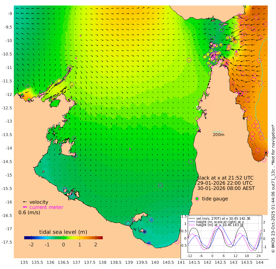 28cm/s 121T +3cm/s rms + 7cm/s -42T. ARA-GOC87 57m 29cm/s 161T +3cm/s rms + 2cm/s -2T. ARA-GOC87 60m 18cm/s 126T +2cm/s rms + 3cm/s 61T. ARA-GOC87 47m 129cm Daru 139cm Bobo Island 139cm Meer Island Barge 155cm Bramble Cay 156cm Unnamed Cay 156cm Pearce Cay 160cm Stephens Island 166cm Merrie England Shoals 140cm Mutacomal Reef 155cm Darnley Island Barge 146cm East Cay 142cm Yorke Island Barge 142cm Rennel Island 136cm Aureed Island 116cm Dungeness Reef 52cm Zagai Island 54cm Yam Island -14cm Dauan Island -15cm Saibai Island -1cm Phipi Reef 45cm Warrior Reef - West -3cm Mabuiag Island Barge 146cm Half Way Island 119cm Coconut Island 138cm Dugong Islet 89cm Poll Island 102cm Kirkcaldie Reef 52cm Suarji Island 83cm Sue Islet 43cm Hawkesbury Island 66cm Alert Patches 68cm Twin Island 25cm Badu Island 47cm St Pauls (Moa Island) 42cm Kubin (Moa Island) 46cm Ince Point 43cm Thursday Island 41cm Nardana Patches 46cm Turtle Head 30cm Round Island 50cm Goods Island 46cm Booby Island 47cm White Rocks Area 50cm Carpentaria 47cm Papou Point 53cm Bampfield Head 32cm Crab Island 44cm Red Wallis Island 51cm Packe Island 142cm Harrington Reef 32cm Herald Camp 0cm Sharp Point 35cm Red Island Point 47cm Possession Island 66cm Alpha Rock 96cm Frederick Point 132cm Wyborn Reef Light 119cm Tetley Island 116cm Triangle Reef 156cm Turtle Head Island 132cm Maclennan Cay 120cm Raine Island 147cm Mcsweeny Reef 144cm Collette Reef 128cm Shadwell Reef 163cm Hannibal Island 160cm Round Point 41cm Vrilya Point 151cm Cape Grenville 142cm Hicks Island 147cm Sir Charles Hardy Island 46cm Harvey Island 151cm Kay Reef 130cm Rocky Island 126cm Chapman Island 123cm Ham Reef 130cm Jubilee Reef 121cm Night Island 128cm Unnamed Reef No. 3 139cm Morris Island 132cm 1st 3 Mile Opening 136cm Creech Reef 132cm Fife Island 162cm Eden Reef 146cm Stanley Island 157cm Normanby River -3cm Yabooma Island 18cm Hutchison River -1cm Elcho Island -14cm North West Crocodile Island 33cm Cape Wessel 13cm Stevens Island 72cm Guluwuru Island 7cm Hopeful Bay 25cm Auster Point 25cm Two Island Bay 41cm Cadell Strait 155cm Mallison Island 45cm Melville Bay (Gove Harbour) 54cm Truant Island 33cm Cape Arnhem 3cm Cape Grey -16cm Hawk Island -58cm Milner Bay (Groote Eylandt) -55cm Cape Beatrice -85cm West Island -86cm Centre Island -84cm Mornington Island -77cm West Wellesley Islands -115cm Bountiful Island -160cm Albert River Mouth -176cm Sweers Island -158cm Karumba -43cm Nassau River Offshore 1cm Christmas Creek 29cm Archer River 38cm Boyd Point 32cm Weipa (Humbug Point) 41cm Pennefather River 28cm Cullen Point