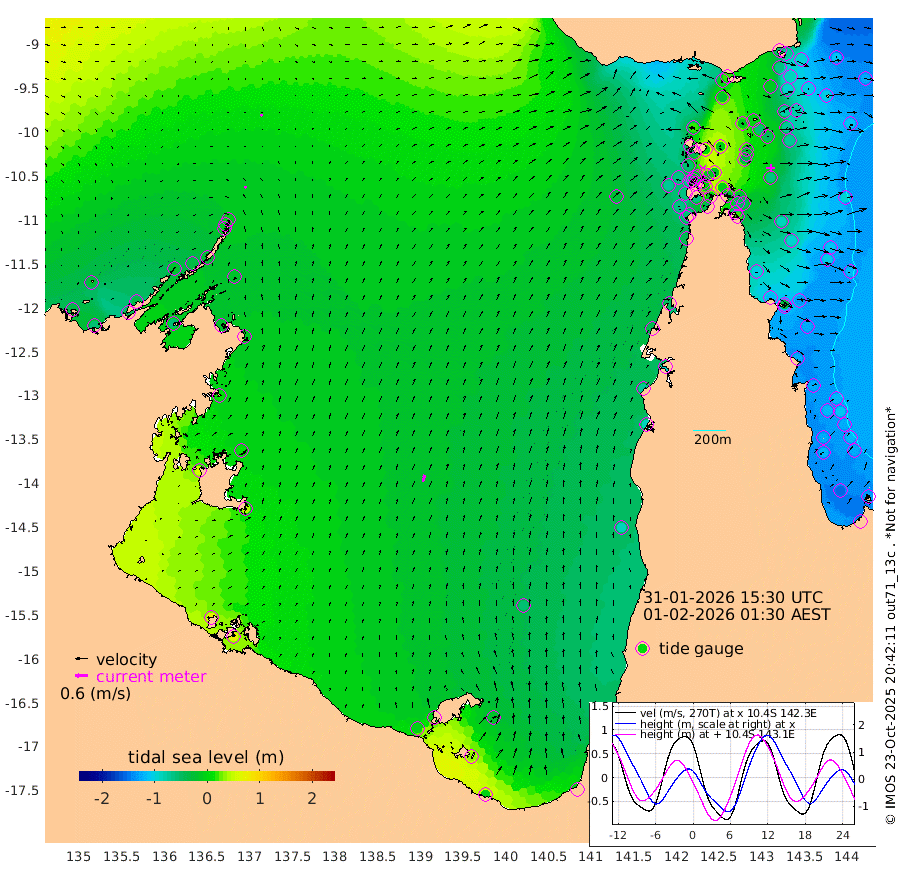 11cm/s 27T +3cm/s rms + 7cm/s -42T. ARA-GOC87 57m 35cm/s 14T +3cm/s rms + 2cm/s -2T. ARA-GOC87 60m 12cm/s 55T +2cm/s rms + 3cm/s 61T. ARA-GOC87 47m -60cm Daru -68cm Bobo Island -111cm Meer Island Barge -112cm Bramble Cay -89cm Unnamed Cay -91cm Pearce Cay -99cm Stephens Island -96cm Merrie England Shoals -65cm Mutacomal Reef -98cm Darnley Island Barge -122cm East Cay -75cm Yorke Island Barge -78cm Rennel Island -71cm Aureed Island -56cm Dungeness Reef 0cm Zagai Island -8cm Yam Island 3cm Dauan Island 15cm Saibai Island -15cm Phipi Reef -14cm Warrior Reef - West 18cm Mabuiag Island Barge -73cm Half Way Island -47cm Coconut Island -63cm Dugong Islet -24cm Poll Island -37cm Kirkcaldie Reef -1cm Suarji Island -16cm Sue Islet -59cm Hawkesbury Island -11cm Alert Patches -8cm Twin Island -41cm Badu Island 11cm St Pauls (Moa Island) -40cm Kubin (Moa Island) -10cm Ince Point -15cm Thursday Island -13cm Nardana Patches -47cm Turtle Head -39cm Round Island -72cm Goods Island -68cm Booby Island -65cm White Rocks Area -28cm Carpentaria 4cm Papou Point -62cm Bampfield Head -53cm Crab Island -64cm Red Wallis Island -62cm Packe Island -52cm Harrington Reef -67cm Herald Camp 17cm Sharp Point -39cm Red Island Point -14cm Possession Island -1cm Alpha Rock -25cm Frederick Point -48cm Wyborn Reef Light -36cm Tetley Island -91cm Triangle Reef -55cm Turtle Head Island -108cm Maclennan Cay -115cm Raine Island -84cm Mcsweeny Reef -91cm Collette Reef -103cm Shadwell Reef -103cm Hannibal Island -116cm Round Point -41cm Vrilya Point -112cm Cape Grenville -114cm Hicks Island -128cm Sir Charles Hardy Island -34cm Harvey Island -124cm Kay Reef -120cm Rocky Island -126cm Chapman Island -118cm Ham Reef -117cm Jubilee Reef -107cm Night Island -122cm Unnamed Reef No. 3 -126cm Morris Island -119cm 1st 3 Mile Opening -123cm Creech Reef -119cm Fife Island -153cm Eden Reef -130cm Stanley Island -138cm Normanby River -37cm Yabooma Island -57cm Hutchison River -36cm Elcho Island -30cm North West Crocodile Island -7cm Cape Wessel -16cm Stevens Island -32cm Guluwuru Island -26cm Hopeful Bay -11cm Auster Point -9cm Two Island Bay -43cm Cadell Strait -54cm Mallison Island -20cm Melville Bay (Gove Harbour) -17cm Truant Island -8cm Cape Arnhem 12cm Cape Grey 14cm Hawk Island 56cm Milner Bay (Groote Eylandt) 38cm Cape Beatrice 69cm West Island 69cm Centre Island -6cm Mornington Island -6cm West Wellesley Islands -19cm Bountiful Island -4cm Albert River Mouth 32cm Sweers Island -11cm Karumba -59cm Nassau River Offshore -88cm Christmas Creek -87cm Archer River -71cm Boyd Point -91cm Weipa (Humbug Point) -44cm Pennefather River -51cm Cullen Point