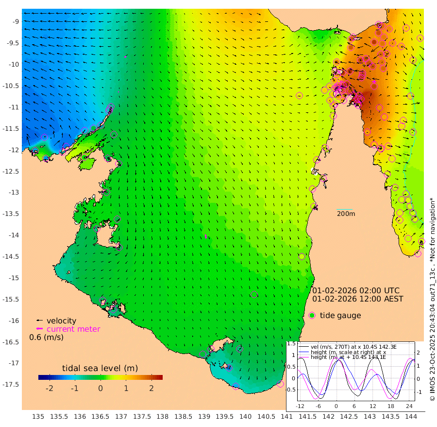 8cm/s -133T +3cm/s rms + 7cm/s -42T. ARA-GOC87 57m 39cm/s 167T +3cm/s rms + 2cm/s -2T. ARA-GOC87 60m 20cm/s -104T +2cm/s rms + 3cm/s 61T. ARA-GOC87 47m 193cm Daru 177cm Bobo Island 78cm Meer Island Barge 112cm Bramble Cay 161cm Unnamed Cay 169cm Pearce Cay 150cm Stephens Island 155cm Merrie England Shoals 191cm Mutacomal Reef 134cm Darnley Island Barge 87cm East Cay 162cm Yorke Island Barge 178cm Rennel Island 172cm Aureed Island 194cm Dungeness Reef 193cm Zagai Island 202cm Yam Island 186cm Dauan Island 169cm Saibai Island 185cm Phipi Reef 209cm Warrior Reef - West 158cm Mabuiag Island Barge 176cm Half Way Island 194cm Coconut Island 197cm Dugong Islet 202cm Poll Island 206cm Kirkcaldie Reef 211cm Suarji Island 195cm Sue Islet 136cm Hawkesbury Island 208cm Alert Patches 208cm Twin Island 138cm Badu Island 215cm St Pauls (Moa Island) 154cm Kubin (Moa Island) 187cm Ince Point 174cm Thursday Island 177cm Nardana Patches 159cm Turtle Head 129cm Round Island 124cm Goods Island 102cm Booby Island 108cm White Rocks Area 78cm Carpentaria 182cm Papou Point 106cm Bampfield Head 82cm Crab Island 110cm Red Wallis Island 146cm Packe Island 212cm Harrington Reef 123cm Herald Camp 62cm Sharp Point 136cm Red Island Point 165cm Possession Island 190cm Alpha Rock 209cm Frederick Point 195cm Wyborn Reef Light 201cm Tetley Island 91cm Triangle Reef 202cm Turtle Head Island 89cm Maclennan Cay 48cm Raine Island 155cm Mcsweeny Reef 135cm Collette Reef 83cm Shadwell Reef 139cm Hannibal Island 117cm Round Point 73cm Vrilya Point 104cm Cape Grenville 95cm Hicks Island 98cm Sir Charles Hardy Island 34cm Harvey Island 77cm Kay Reef 61cm Rocky Island 50cm Chapman Island 49cm Ham Reef 60cm Jubilee Reef 62cm Night Island 53cm Unnamed Reef No. 3 62cm Morris Island 58cm 1st 3 Mile Opening 63cm Creech Reef 68cm Fife Island 52cm Eden Reef 62cm Stanley Island 65cm Normanby River -133cm Yabooma Island -137cm Hutchison River -143cm Elcho Island -138cm North West Crocodile Island -69cm Cape Wessel -115cm Stevens Island -30cm Guluwuru Island -122cm Hopeful Bay -86cm Auster Point -88cm Two Island Bay -93cm Cadell Strait 13cm Mallison Island -40cm Melville Bay (Gove Harbour) -36cm Truant Island -21cm Cape Arnhem -30cm Cape Grey -36cm Hawk Island -64cm Milner Bay (Groote Eylandt) -50cm Cape Beatrice -48cm West Island -55cm Centre Island -36cm Mornington Island -29cm West Wellesley Islands -65cm Bountiful Island -121cm Albert River Mouth -148cm Sweers Island -103cm Karumba 8cm Nassau River Offshore 48cm Christmas Creek 48cm Archer River 66cm Boyd Point 56cm Weipa (Humbug Point) 56cm Pennefather River 67cm Cullen Point