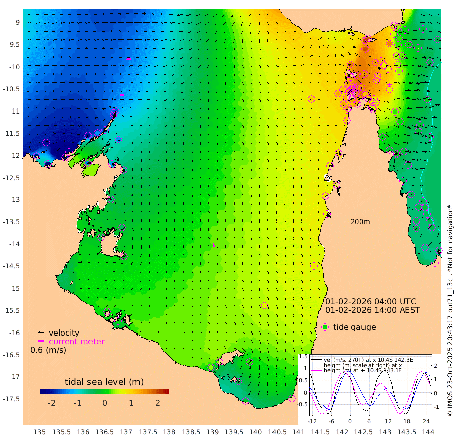 38cm/s -89T +3cm/s rms + 7cm/s -42T. ARA-GOC87 57m 31cm/s 176T +3cm/s rms + 2cm/s -2T. ARA-GOC87 60m 48cm/s -95T +2cm/s rms + 3cm/s 61T. ARA-GOC87 47m 63cm Daru 34cm Bobo Island -31cm Meer Island Barge -24cm Bramble Cay 16cm Unnamed Cay 16cm Pearce Cay 3cm Stephens Island 3cm Merrie England Shoals 51cm Mutacomal Reef -2cm Darnley Island Barge -33cm East Cay 29cm Yorke Island Barge 41cm Rennel Island 38cm Aureed Island 80cm Dungeness Reef 131cm Zagai Island 140cm Yam Island 200cm Dauan Island 183cm Saibai Island 188cm Phipi Reef 156cm Warrior Reef - West 165cm Mabuiag Island Barge 37cm Half Way Island 73cm Coconut Island 62cm Dugong Islet 106cm Poll Island 107cm Kirkcaldie Reef 150cm Suarji Island 110cm Sue Islet 141cm Hawkesbury Island 150cm Alert Patches 141cm Twin Island 154cm Badu Island 164cm St Pauls (Moa Island) 144cm Kubin (Moa Island) 154cm Ince Point 153cm Thursday Island 155cm Nardana Patches 151cm Turtle Head 134cm Round Island 132cm Goods Island 130cm Booby Island 120cm White Rocks Area 106cm Carpentaria 132cm Papou Point 121cm Bampfield Head 116cm Crab Island 132cm Red Wallis Island 142cm Packe Island 68cm Harrington Reef 148cm Herald Camp 58cm Sharp Point 130cm Red Island Point 130cm Possession Island 120cm Alpha Rock 111cm Frederick Point 58cm Wyborn Reef Light 73cm Tetley Island -3cm Triangle Reef 47cm Turtle Head Island -16cm Maclennan Cay -36cm Raine Island 18cm Mcsweeny Reef 6cm Collette Reef -16cm Shadwell Reef -6cm Hannibal Island -25cm Round Point 105cm Vrilya Point -22cm Cape Grenville -23cm Hicks Island -16cm Sir Charles Hardy Island -5cm Harvey Island -41cm Kay Reef -37cm Rocky Island -43cm Chapman Island -39cm Ham Reef -36cm Jubilee Reef -29cm Night Island -38cm Unnamed Reef No. 3 -42cm Morris Island -33cm 1st 3 Mile Opening -35cm Creech Reef -36cm Fife Island -67cm Eden Reef -46cm Stanley Island -61cm Normanby River -214cm Yabooma Island -241cm Hutchison River -219cm Elcho Island -205cm North West Crocodile Island -163cm Cape Wessel -209cm Stevens Island -140cm Guluwuru Island -199cm Hopeful Bay -175cm Auster Point -179cm Two Island Bay -213cm Cadell Strait -145cm Mallison Island -130cm Melville Bay (Gove Harbour) -137cm Truant Island -84cm Cape Arnhem -63cm Cape Grey -52cm Hawk Island -45cm Milner Bay (Groote Eylandt) -25cm Cape Beatrice 9cm West Island 7cm Centre Island 31cm Mornington Island 31cm West Wellesley Islands 17cm Bountiful Island -11cm Albert River Mouth -40cm Sweers Island 10cm Karumba 61cm Nassau River Offshore 86cm Christmas Creek 75cm Archer River 87cm Boyd Point 86cm Weipa (Humbug Point) 77cm Pennefather River 104cm Cullen Point