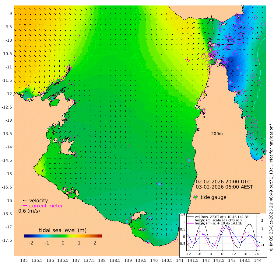 7cm/s -168T +3cm/s rms + 7cm/s -42T. ARA-GOC87 57m 21cm/s 17T +3cm/s rms + 2cm/s -2T. ARA-GOC87 60m 14cm/s 163T +2cm/s rms + 3cm/s 61T. ARA-GOC87 47m -159cm Daru -155cm Bobo Island -72cm Meer Island Barge -104cm Bramble Cay -133cm Unnamed Cay -149cm Pearce Cay -131cm Stephens Island -131cm Merrie England Shoals -151cm Mutacomal Reef -118cm Darnley Island Barge -84cm East Cay -134cm Yorke Island Barge -143cm Rennel Island -147cm Aureed Island -150cm Dungeness Reef -135cm Zagai Island -133cm Yam Island -108cm Dauan Island -91cm Saibai Island -132cm Phipi Reef -154cm Warrior Reef - West -51cm Mabuiag Island Barge -140cm Half Way Island -147cm Coconut Island -148cm Dugong Islet -141cm Poll Island -143cm Kirkcaldie Reef -131cm Suarji Island -128cm Sue Islet 30cm Hawkesbury Island -105cm Alert Patches -114cm Twin Island 6cm Badu Island -115cm St Pauls (Moa Island) -17cm Kubin (Moa Island) -74cm Ince Point -49cm Thursday Island -55cm Nardana Patches -28cm Turtle Head 10cm Round Island 30cm Goods Island 73cm Booby Island 56cm White Rocks Area 102cm Carpentaria -92cm Papou Point 85cm Bampfield Head 57cm Crab Island 55cm Red Wallis Island -6cm Packe Island -160cm Harrington Reef 38cm Herald Camp -39cm Sharp Point -25cm Red Island Point -58cm Possession Island -104cm Alpha Rock -134cm Frederick Point -144cm Wyborn Reef Light -142cm Tetley Island -73cm Triangle Reef -141cm Turtle Head Island -73cm Maclennan Cay -44cm Raine Island -128cm Mcsweeny Reef -114cm Collette Reef -71cm Shadwell Reef -123cm Hannibal Island -107cm Round Point 70cm Vrilya Point -90cm Cape Grenville -86cm Hicks Island -80cm Sir Charles Hardy Island -30cm Harvey Island -68cm Kay Reef -57cm Rocky Island -48cm Chapman Island -42cm Ham Reef -52cm Jubilee Reef -58cm Night Island -47cm Unnamed Reef No. 3 -58cm Morris Island -45cm 1st 3 Mile Opening -55cm Creech Reef -73cm Fife Island -56cm Eden Reef -56cm Stanley Island -68cm Normanby River 74cm Yabooma Island 63cm Hutchison River 74cm Elcho Island 68cm North West Crocodile Island 35cm Cape Wessel 51cm Stevens Island -11cm Guluwuru Island 57cm Hopeful Bay 44cm Auster Point 45cm Two Island Bay 12cm Cadell Strait -75cm Mallison Island -6cm Melville Bay (Gove Harbour) -1cm Truant Island -12cm Cape Arnhem -13cm Cape Grey -20cm Hawk Island -5cm Milner Bay (Groote Eylandt) -20cm Cape Beatrice -23cm West Island -18cm Centre Island -95cm Mornington Island -94cm West Wellesley Islands -100cm Bountiful Island -103cm Albert River Mouth -93cm Sweers Island -112cm Karumba -99cm Nassau River Offshore -78cm Christmas Creek -14cm Archer River 9cm Boyd Point 12cm Weipa (Humbug Point) 29cm Pennefather River 55cm Cullen Point