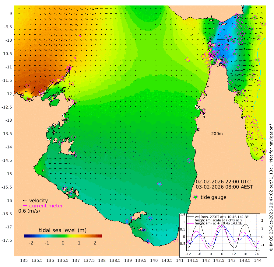 25cm/s 131T +3cm/s rms + 7cm/s -42T. ARA-GOC87 57m 3cm/s 67T +3cm/s rms + 2cm/s -2T. ARA-GOC87 60m 27cm/s 127T +2cm/s rms + 3cm/s 61T. ARA-GOC87 47m -54cm Daru -38cm Bobo Island 37cm Meer Island Barge 26cm Bramble Cay -8cm Unnamed Cay -14cm Pearce Cay -3cm Stephens Island 0cm Merrie England Shoals -37cm Mutacomal Reef 1cm Darnley Island Barge 40cm East Cay -26cm Yorke Island Barge -26cm Rennel Island -37cm Aureed Island -56cm Dungeness Reef -93cm Zagai Island -86cm Yam Island -101cm Dauan Island -94cm Saibai Island -112cm Phipi Reef -106cm Warrior Reef - West -52cm Mabuiag Island Barge -28cm Half Way Island -52cm Coconut Island -42cm Dugong Islet -69cm Poll Island -69cm Kirkcaldie Reef -88cm Suarji Island -71cm Sue Islet 72cm Hawkesbury Island -61cm Alert Patches -64cm Twin Island 33cm Badu Island -83cm St Pauls (Moa Island) 20cm Kubin (Moa Island) -43cm Ince Point -22cm Thursday Island -29cm Nardana Patches 8cm Turtle Head 37cm Round Island 69cm Goods Island 94cm Booby Island 90cm White Rocks Area 84cm Carpentaria -58cm Papou Point 109cm Bampfield Head 66cm Crab Island 80cm Red Wallis Island 37cm Packe Island -53cm Harrington Reef 63cm Herald Camp -45cm Sharp Point 7cm Red Island Point -26cm Possession Island -57cm Alpha Rock -60cm Frederick Point -38cm Wyborn Reef Light -46cm Tetley Island 23cm Triangle Reef -25cm Turtle Head Island 33cm Maclennan Cay 55cm Raine Island -12cm Mcsweeny Reef 0cm Collette Reef 30cm Shadwell Reef 6cm Hannibal Island 31cm Round Point 65cm Vrilya Point 31cm Cape Grenville 32cm Hicks Island 41cm Sir Charles Hardy Island 6cm Harvey Island 53cm Kay Reef 52cm Rocky Island 64cm Chapman Island 60cm Ham Reef 53cm Jubilee Reef 39cm Night Island 59cm Unnamed Reef No. 3 56cm Morris Island 55cm 1st 3 Mile Opening 52cm Creech Reef 42cm Fife Island 77cm Eden Reef 60cm Stanley Island 65cm Normanby River 207cm Yabooma Island 225cm Hutchison River 199cm Elcho Island 186cm North West Crocodile Island 132cm Cape Wessel 173cm Stevens Island 92cm Guluwuru Island 169cm Hopeful Bay 146cm Auster Point 146cm Two Island Bay 163cm Cadell Strait 51cm Mallison Island 85cm Melville Bay (Gove Harbour) 94cm Truant Island 44cm Cape Arnhem 10cm Cape Grey -8cm Hawk Island -43cm Milner Bay (Groote Eylandt) -55cm Cape Beatrice -104cm West Island -103cm Centre Island -137cm Mornington Island -131cm West Wellesley Islands -134cm Bountiful Island -153cm Albert River Mouth -160cm Sweers Island -161cm Karumba -102cm Nassau River Offshore -61cm Christmas Creek 9cm Archer River 26cm Boyd Point 38cm Weipa (Humbug Point) 30cm Pennefather River 55cm Cullen Point
