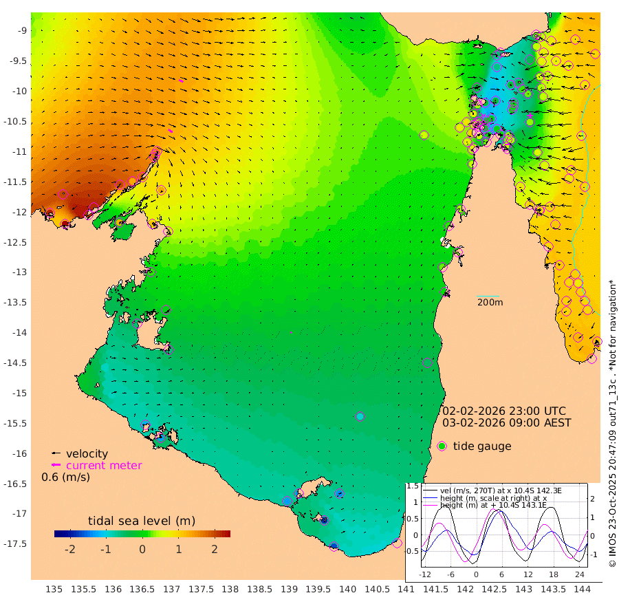 33cm/s 122T +3cm/s rms + 7cm/s -42T. ARA-GOC87 57m 10cm/s 162T +3cm/s rms + 2cm/s -2T. ARA-GOC87 60m 32cm/s 117T +2cm/s rms + 3cm/s 61T. ARA-GOC87 47m 28cm Daru 45cm Bobo Island 88cm Meer Island Barge 93cm Bramble Cay 69cm Unnamed Cay 71cm Pearce Cay 74cm Stephens Island 77cm Merrie England Shoals 45cm Mutacomal Reef 71cm Darnley Island Barge 97cm East Cay 49cm Yorke Island Barge 53cm Rennel Island 42cm Aureed Island 20cm Dungeness Reef -32cm Zagai Island -26cm Yam Island -61cm Dauan Island -59cm Saibai Island -66cm Phipi Reef -40cm Warrior Reef - West -27cm Mabuiag Island Barge 49cm Half Way Island 24cm Coconut Island 37cm Dugong Islet 1cm Poll Island 1cm Kirkcaldie Reef -28cm Suarji Island -8cm Sue Islet 81cm Hawkesbury Island -9cm Alert Patches -8cm Twin Island 43cm Badu Island -30cm St Pauls (Moa Island) 42cm Kubin (Moa Island) -3cm Ince Point 7cm Thursday Island 3cm Nardana Patches 31cm Turtle Head 48cm Round Island 74cm Goods Island 82cm Booby Island 87cm White Rocks Area 58cm Carpentaria -12cm Papou Point 100cm Bampfield Head 53cm Crab Island 75cm Red Wallis Island 55cm Packe Island 32cm Harrington Reef 64cm Herald Camp -32cm Sharp Point 27cm Red Island Point 9cm Possession Island -3cm Alpha Rock 8cm Frederick Point 43cm Wyborn Reef Light 32cm Tetley Island 73cm Triangle Reef 58cm Turtle Head Island 83cm Maclennan Cay 92cm Raine Island 62cm Mcsweeny Reef 67cm Collette Reef 78cm Shadwell Reef 79cm Hannibal Island 101cm Round Point 45cm Vrilya Point 90cm Cape Grenville 90cm Hicks Island 98cm Sir Charles Hardy Island 25cm Harvey Island 105cm Kay Reef 96cm Rocky Island 106cm Chapman Island 98cm Ham Reef 95cm Jubilee Reef 81cm Night Island 99cm Unnamed Reef No. 3 102cm Morris Island 94cm 1st 3 Mile Opening 96cm Creech Reef 93cm Fife Island 126cm Eden Reef 105cm Stanley Island 119cm Normanby River 223cm Yabooma Island 251cm Hutchison River 212cm Elcho Island 197cm North West Crocodile Island 157cm Cape Wessel 196cm Stevens Island 133cm Guluwuru Island 184cm Hopeful Bay 167cm Auster Point 168cm Two Island Bay 205cm Cadell Strait 121cm Mallison Island 118cm Melville Bay (Gove Harbour) 130cm Truant Island 69cm Cape Arnhem 22cm Cape Grey 0cm Hawk Island -55cm Milner Bay (Groote Eylandt) -65cm Cape Beatrice -127cm West Island -130cm Centre Island -141cm Mornington Island -133cm West Wellesley Islands -139cm Bountiful Island -170cm Albert River Mouth -182cm Sweers Island -174cm Karumba -95cm Nassau River Offshore -49cm Christmas Creek 11cm Archer River 26cm Boyd Point 35cm Weipa (Humbug Point) 21cm Pennefather River 40cm Cullen Point