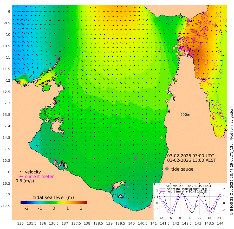 7cm/s 119T +3cm/s rms + 7cm/s -42T. ARA-GOC87 57m 36cm/s 166T +3cm/s rms + 2cm/s -2T. ARA-GOC87 60m 6cm/s -86T +2cm/s rms + 3cm/s 61T. ARA-GOC87 47m 173cm Daru 165cm Bobo Island 75cm Meer Island Barge 103cm Bramble Cay 141cm Unnamed Cay 155cm Pearce Cay 136cm Stephens Island 133cm Merrie England Shoals 165cm Mutacomal Reef 125cm Darnley Island Barge 84cm East Cay 149cm Yorke Island Barge 157cm Rennel Island 158cm Aureed Island 169cm Dungeness Reef 173cm Zagai Island 178cm Yam Island 165cm Dauan Island 154cm Saibai Island 155cm Phipi Reef 190cm Warrior Reef - West 128cm Mabuiag Island Barge 155cm Half Way Island 169cm Coconut Island 172cm Dugong Islet 175cm Poll Island 176cm Kirkcaldie Reef 174cm Suarji Island 171cm Sue Islet 93cm Hawkesbury Island 164cm Alert Patches 172cm Twin Island 92cm Badu Island 178cm St Pauls (Moa Island) 115cm Kubin (Moa Island) 147cm Ince Point 131cm Thursday Island 135cm Nardana Patches 112cm Turtle Head 89cm Round Island 74cm Goods Island 49cm Booby Island 54cm White Rocks Area 35cm Carpentaria 154cm Papou Point 57cm Bampfield Head 39cm Crab Island 61cm Red Wallis Island 101cm Packe Island 185cm Harrington Reef 84cm Herald Camp 52cm Sharp Point 99cm Red Island Point 128cm Possession Island 159cm Alpha Rock 179cm Frederick Point 172cm Wyborn Reef Light 176cm Tetley Island 85cm Triangle Reef 177cm Turtle Head Island 82cm Maclennan Cay 44cm Raine Island 139cm Mcsweeny Reef 119cm Collette Reef 75cm Shadwell Reef 123cm Hannibal Island 106cm Round Point 30cm Vrilya Point 92cm Cape Grenville 89cm Hicks Island 93cm Sir Charles Hardy Island 31cm Harvey Island 69cm Kay Reef 57cm Rocky Island 47cm Chapman Island 49cm Ham Reef 56cm Jubilee Reef 57cm Night Island 50cm Unnamed Reef No. 3 58cm Morris Island 50cm 1st 3 Mile Opening 57cm Creech Reef 69cm Fife Island 50cm Eden Reef 55cm Stanley Island 63cm Normanby River -83cm Yabooma Island -79cm Hutchison River -92cm Elcho Island -89cm North West Crocodile Island -15cm Cape Wessel -63cm Stevens Island 25cm Guluwuru Island -72cm Hopeful Bay -37cm Auster Point -29cm Two Island Bay -21cm Cadell Strait 95cm Mallison Island 8cm Melville Bay (Gove Harbour) 15cm Truant Island 13cm Cape Arnhem -10cm Cape Grey -21cm Hawk Island -61cm Milner Bay (Groote Eylandt) -53cm Cape Beatrice -66cm West Island -74cm Centre Island -52cm Mornington Island -50cm West Wellesley Islands -81cm Bountiful Island -135cm Albert River Mouth -157cm Sweers Island -116cm Karumba -14cm Nassau River Offshore 23cm Christmas Creek 19cm Archer River 38cm Boyd Point 25cm Weipa (Humbug Point) 21cm Pennefather River 33cm Cullen Point