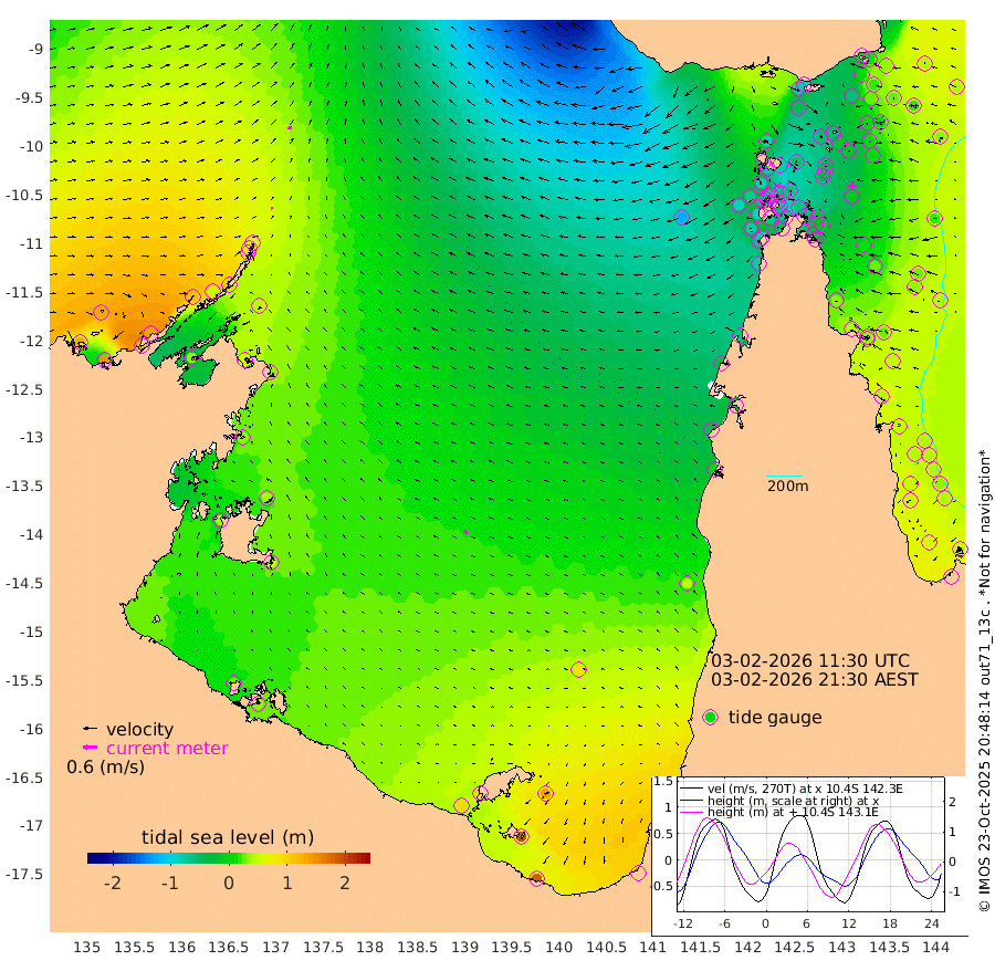 9cm/s 85T +3cm/s rms + 7cm/s -42T. ARA-GOC87 57m 19cm/s -59T +3cm/s rms + 2cm/s -2T. ARA-GOC87 60m 17cm/s 71T +2cm/s rms + 3cm/s 61T. ARA-GOC87 47m -4cm Daru 8cm Bobo Island 35cm Meer Island Barge 43cm Bramble Cay 19cm Unnamed Cay 25cm Pearce Cay 25cm Stephens Island 30cm Merrie England Shoals 4cm Mutacomal Reef 21cm Darnley Island Barge 44cm East Cay 3cm Yorke Island Barge 7cm Rennel Island 5cm Aureed Island -12cm Dungeness Reef -56cm Zagai Island -59cm Yam Island -80cm Dauan Island -88cm Saibai Island -45cm Phipi Reef -53cm Warrior Reef - West -89cm Mabuiag Island Barge 3cm Half Way Island -15cm Coconut Island -13cm Dugong Islet -37cm Poll Island -36cm Kirkcaldie Reef -60cm Suarji Island -51cm Sue Islet -84cm Hawkesbury Island -66cm Alert Patches -66cm Twin Island -73cm Badu Island -81cm St Pauls (Moa Island) -79cm Kubin (Moa Island) -77cm Ince Point -80cm Thursday Island -80cm Nardana Patches -68cm Turtle Head -79cm Round Island -67cm Goods Island -84cm Booby Island -69cm White Rocks Area -122cm Carpentaria -71cm Papou Point -104cm Bampfield Head -68cm Crab Island -80cm Red Wallis Island -68cm Packe Island -16cm Harrington Reef -94cm Herald Camp -29cm Sharp Point -58cm Red Island Point -70cm Possession Island -64cm Alpha Rock -45cm Frederick Point -13cm Wyborn Reef Light -25cm Tetley Island 20cm Triangle Reef -16cm Turtle Head Island 26cm Maclennan Cay 43cm Raine Island 15cm Mcsweeny Reef 23cm Collette Reef 31cm Shadwell Reef 33cm Hannibal Island 46cm Round Point -78cm Vrilya Point 36cm Cape Grenville 37cm Hicks Island 29cm Sir Charles Hardy Island 9cm Harvey Island 46cm Kay Reef 44cm Rocky Island 51cm Chapman Island 38cm Ham Reef 39cm Jubilee Reef 38cm Night Island 43cm Unnamed Reef No. 3 47cm Morris Island 37cm 1st 3 Mile Opening 40cm Creech Reef 48cm Fife Island 64cm Eden Reef 48cm Stanley Island 59cm Normanby River 128cm Yabooma Island 149cm Hutchison River 131cm Elcho Island 128cm North West Crocodile Island 54cm Cape Wessel 114cm Stevens Island 48cm Guluwuru Island 112cm Hopeful Bay 75cm Auster Point 66cm Two Island Bay 119cm Cadell Strait 36cm Mallison Island 56cm Melville Bay (Gove Harbour) 48cm Truant Island 32cm Cape Arnhem 33cm Cape Grey 43cm Hawk Island 41cm Milner Bay (Groote Eylandt) 45cm Cape Beatrice 29cm West Island 31cm Centre Island 96cm Mornington Island 94cm West Wellesley Islands 135cm Bountiful Island 186cm Albert River Mouth 192cm Sweers Island 177cm Karumba 88cm Nassau River Offshore 47cm Christmas Creek 11cm Archer River -33cm Boyd Point -14cm Weipa (Humbug Point) -36cm Pennefather River -70cm Cullen Point