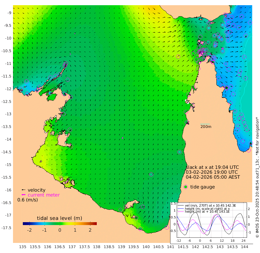 14cm/s -68T +3cm/s rms + 7cm/s -42T. ARA-GOC87 57m 27cm/s 19T +3cm/s rms + 2cm/s -2T. ARA-GOC87 60m 9cm/s -105T +2cm/s rms + 3cm/s 61T. ARA-GOC87 47m -128cm Daru -133cm Bobo Island -96cm Meer Island Barge -124cm Bramble Cay -126cm Unnamed Cay -144cm Pearce Cay -129cm Stephens Island -131cm Merrie England Shoals -129cm Mutacomal Reef -117cm Darnley Island Barge -113cm East Cay -116cm Yorke Island Barge -128cm Rennel Island -124cm Aureed Island -118cm Dungeness Reef -80cm Zagai Island -84cm Yam Island -64cm Dauan Island -46cm Saibai Island -85cm Phipi Reef -99cm Warrior Reef - West -27cm Mabuiag Island Barge -120cm Half Way Island -115cm Coconut Island -119cm Dugong Islet -99cm Poll Island -102cm Kirkcaldie Reef -75cm Suarji Island -83cm Sue Islet -32cm Hawkesbury Island -68cm Alert Patches -74cm Twin Island -32cm Badu Island -64cm St Pauls (Moa Island) -40cm Kubin (Moa Island) -51cm Ince Point -39cm Thursday Island -42cm Nardana Patches -44cm Turtle Head -22cm Round Island -27cm Goods Island 6cm Booby Island -9cm White Rocks Area 63cm Carpentaria -57cm Papou Point 18cm Bampfield Head 4cm Crab Island -6cm Red Wallis Island -43cm Packe Island -123cm Harrington Reef -14cm Herald Camp -11cm Sharp Point -45cm Red Island Point -43cm Possession Island -65cm Alpha Rock -96cm Frederick Point -119cm Wyborn Reef Light -112cm Tetley Island -91cm Triangle Reef -120cm Turtle Head Island -95cm Maclennan Cay -83cm Raine Island -120cm Mcsweeny Reef -115cm Collette Reef -93cm Shadwell Reef -126cm Hannibal Island -131cm Round Point 24cm Vrilya Point -109cm Cape Grenville -109cm Hicks Island -109cm Sir Charles Hardy Island -34cm Harvey Island -103cm Kay Reef -94cm Rocky Island -95cm Chapman Island -84cm Ham Reef -88cm Jubilee Reef -85cm Night Island -89cm Unnamed Reef No. 3 -97cm Morris Island -80cm 1st 3 Mile Opening -90cm Creech Reef -106cm Fife Island -109cm Eden Reef -95cm Stanley Island -112cm Normanby River -81cm Yabooma Island -106cm Hutchison River -74cm Elcho Island -74cm North West Crocodile Island -52cm Cape Wessel -76cm Stevens Island -73cm Guluwuru Island -67cm Hopeful Bay -55cm Auster Point -55cm Two Island Bay -118cm Cadell Strait -115cm Mallison Island -65cm Melville Bay (Gove Harbour) -64cm Truant Island -40cm Cape Arnhem -16cm Cape Grey -15cm Hawk Island 31cm Milner Bay (Groote Eylandt) 18cm Cape Beatrice 55cm West Island 60cm Centre Island -26cm Mornington Island -25cm West Wellesley Islands -40cm Bountiful Island -39cm Albert River Mouth -18cm Sweers Island -50cm Karumba -65cm Nassau River Offshore -68cm Christmas Creek -42cm Archer River -18cm Boyd Point -30cm Weipa (Humbug Point) 2cm Pennefather River 14cm Cullen Point