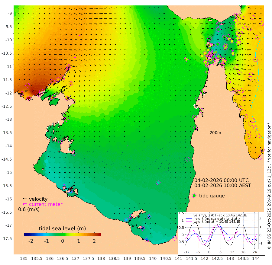 29cm/s 120T +3cm/s rms + 7cm/s -42T. ARA-GOC87 57m 11cm/s 174T +3cm/s rms + 2cm/s -2T. ARA-GOC87 60m 27cm/s 112T +2cm/s rms + 3cm/s 61T. ARA-GOC87 47m 59cm Daru 72cm Bobo Island 88cm Meer Island Barge 101cm Bramble Cay 89cm Unnamed Cay 92cm Pearce Cay 90cm Stephens Island 94cm Merrie England Shoals 75cm Mutacomal Reef 82cm Darnley Island Barge 99cm East Cay 69cm Yorke Island Barge 78cm Rennel Island 67cm Aureed Island 51cm Dungeness Reef 7cm Zagai Island 14cm Yam Island -16cm Dauan Island -20cm Saibai Island -22cm Phipi Reef 5cm Warrior Reef - West 3cm Mabuiag Island Barge 70cm Half Way Island 55cm Coconut Island 64cm Dugong Islet 37cm Poll Island 32cm Kirkcaldie Reef 14cm Suarji Island 25cm Sue Islet 85cm Hawkesbury Island 24cm Alert Patches 26cm Twin Island 55cm Badu Island 9cm St Pauls (Moa Island) 58cm Kubin (Moa Island) 24cm Ince Point 29cm Thursday Island 27cm Nardana Patches 47cm Turtle Head 60cm Round Island 76cm Goods Island 72cm Booby Island 83cm White Rocks Area 38cm Carpentaria 18cm Papou Point 95cm Bampfield Head 43cm Crab Island 69cm Red Wallis Island 65cm Packe Island 62cm Harrington Reef 68cm Herald Camp -19cm Sharp Point 37cm Red Island Point 32cm Possession Island 30cm Alpha Rock 42cm Frederick Point 75cm Wyborn Reef Light 66cm Tetley Island 79cm Triangle Reef 83cm Turtle Head Island 85cm Maclennan Cay 86cm Raine Island 81cm Mcsweeny Reef 82cm Collette Reef 81cm Shadwell Reef 92cm Hannibal Island 110cm Round Point 27cm Vrilya Point 95cm Cape Grenville 94cm Hicks Island 102cm Sir Charles Hardy Island 27cm Harvey Island 103cm Kay Reef 93cm Rocky Island 101cm Chapman Island 92cm Ham Reef 90cm Jubilee Reef 79cm Night Island 93cm Unnamed Reef No. 3 98cm Morris Island 88cm 1st 3 Mile Opening 90cm Creech Reef 93cm Fife Island 117cm Eden Reef 99cm Stanley Island 114cm Normanby River 226cm Yabooma Island 255cm Hutchison River 212cm Elcho Island 199cm North West Crocodile Island 159cm Cape Wessel 200cm Stevens Island 138cm Guluwuru Island 185cm Hopeful Bay 169cm Auster Point 169cm Two Island Bay 210cm Cadell Strait 129cm Mallison Island 126cm Melville Bay (Gove Harbour) 138cm Truant Island 75cm Cape Arnhem 28cm Cape Grey 8cm Hawk Island -49cm Milner Bay (Groote Eylandt) -57cm Cape Beatrice -121cm West Island -126cm Centre Island -124cm Mornington Island -116cm West Wellesley Islands -116cm Bountiful Island -145cm Albert River Mouth -158cm Sweers Island -149cm Karumba -81cm Nassau River Offshore -41cm Christmas Creek 6cm Archer River 20cm Boyd Point 29cm Weipa (Humbug Point) 7cm Pennefather River 28cm Cullen Point