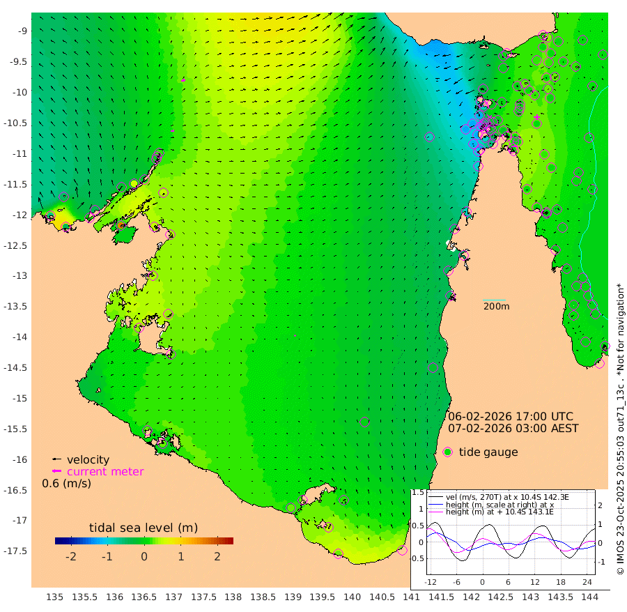 25cm/s 81T +3cm/s rms + 7cm/s -42T. ARA-GOC87 57m 6cm/s 53T +3cm/s rms + 2cm/s -2T. ARA-GOC87 60m 24cm/s 71T +2cm/s rms + 3cm/s 61T. ARA-GOC87 47m 20cm Daru 31cm Bobo Island 8cm Meer Island Barge 6cm Bramble Cay 7cm Unnamed Cay 21cm Pearce Cay 14cm Stephens Island 4cm Merrie England Shoals 6cm Mutacomal Reef 20cm Darnley Island Barge 4cm East Cay 23cm Yorke Island Barge 8cm Rennel Island 30cm Aureed Island 10cm Dungeness Reef 25cm Zagai Island -1cm Yam Island -3cm Dauan Island 8cm Saibai Island -1cm Phipi Reef 20cm Warrior Reef - West -28cm Mabuiag Island Barge 7cm Half Way Island 20cm Coconut Island 5cm Dugong Islet 7cm Poll Island -1cm Kirkcaldie Reef 4cm Suarji Island 13cm Sue Islet -123cm Hawkesbury Island -18cm Alert Patches -12cm Twin Island -84cm Badu Island -9cm St Pauls (Moa Island) -83cm Kubin (Moa Island) -36cm Ince Point -51cm Thursday Island -47cm Nardana Patches -73cm Turtle Head -96cm Round Island -107cm Goods Island -122cm Booby Island -121cm White Rocks Area -85cm Carpentaria -14cm Papou Point -124cm Bampfield Head -101cm Crab Island -117cm Red Wallis Island -96cm Packe Island 14cm Harrington Reef -131cm Herald Camp 3cm Sharp Point -67cm Red Island Point -41cm Possession Island -9cm Alpha Rock 1cm Frederick Point 12cm Wyborn Reef Light 11cm Tetley Island 6cm Triangle Reef 7cm Turtle Head Island -1cm Maclennan Cay -3cm Raine Island 15cm Mcsweeny Reef 13cm Collette Reef 4cm Shadwell Reef 14cm Hannibal Island 3cm Round Point -91cm Vrilya Point -1cm Cape Grenville 1cm Hicks Island -3cm Sir Charles Hardy Island 1cm Harvey Island -4cm Kay Reef -2cm Rocky Island -2cm Chapman Island -3cm Ham Reef 0cm Jubilee Reef 1cm Night Island -2cm Unnamed Reef No. 3 -2cm Morris Island -5cm 1st 3 Mile Opening -1cm Creech Reef 9cm Fife Island -2cm Eden Reef -7cm Stanley Island -6cm Normanby River -64cm Yabooma Island -45cm Hutchison River -44cm Elcho Island -52cm North West Crocodile Island 16cm Cape Wessel -18cm Stevens Island 58cm Guluwuru Island -23cm Hopeful Bay -2cm Auster Point -9cm Two Island Bay 11cm Cadell Strait 163cm Mallison Island 45cm Melville Bay (Gove Harbour) 48cm Truant Island 47cm Cape Arnhem 41cm Cape Grey 33cm Hawk Island 33cm Milner Bay (Groote Eylandt) 24cm Cape Beatrice 25cm West Island 24cm Centre Island 29cm Mornington Island 25cm West Wellesley Islands 21cm Bountiful Island 24cm Albert River Mouth 49cm Sweers Island 16cm Karumba -1cm Nassau River Offshore -21cm Christmas Creek -44cm Archer River -50cm Boyd Point -65cm Weipa (Humbug Point) -52cm Pennefather River -86cm Cullen Point