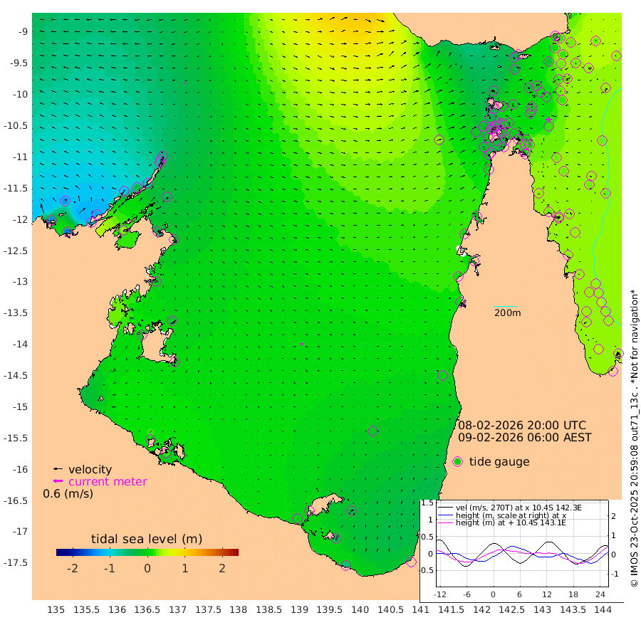 0cm/s -86T +3cm/s rms + 7cm/s -42T. ARA-GOC87 57m 12cm/s 132T +3cm/s rms + 2cm/s -2T. ARA-GOC87 60m 5cm/s -114T +2cm/s rms + 3cm/s 61T. ARA-GOC87 47m 9cm Daru 21cm Bobo Island 34cm Meer Island Barge 26cm Bramble Cay 20cm Unnamed Cay 24cm Pearce Cay 28cm Stephens Island 24cm Merrie England Shoals 10cm Mutacomal Reef 35cm Darnley Island Barge 33cm East Cay 27cm Yorke Island Barge 15cm Rennel Island 28cm Aureed Island 7cm Dungeness Reef -6cm Zagai Island -17cm Yam Island -42cm Dauan Island -23cm Saibai Island -37cm Phipi Reef -16cm Warrior Reef - West -26cm Mabuiag Island Barge 19cm Half Way Island 14cm Coconut Island 16cm Dugong Islet -1cm Poll Island 3cm Kirkcaldie Reef -4cm Suarji Island 7cm Sue Islet -36cm Hawkesbury Island -4cm Alert Patches -5cm Twin Island -34cm Badu Island -14cm St Pauls (Moa Island) -32cm Kubin (Moa Island) -15cm Ince Point -15cm Thursday Island -17cm Nardana Patches -21cm Turtle Head -33cm Round Island -22cm Goods Island -12cm Booby Island -19cm White Rocks Area 34cm Carpentaria -12cm Papou Point -10cm Bampfield Head -13cm Crab Island -15cm Red Wallis Island -26cm Packe Island 20cm Harrington Reef -33cm Herald Camp -3cm Sharp Point -16cm Red Island Point -12cm Possession Island -4cm Alpha Rock 4cm Frederick Point 8cm Wyborn Reef Light 4cm Tetley Island 26cm Triangle Reef 15cm Turtle Head Island 31cm Maclennan Cay 29cm Raine Island 25cm Mcsweeny Reef 28cm Collette Reef 29cm Shadwell Reef 31cm Hannibal Island 26cm Round Point 6cm Vrilya Point 33cm Cape Grenville 28cm Hicks Island 33cm Sir Charles Hardy Island 10cm Harvey Island 37cm Kay Reef 32cm Rocky Island 34cm Chapman Island 36cm Ham Reef 34cm Jubilee Reef 30cm Night Island 38cm Unnamed Reef No. 3 34cm Morris Island 34cm 1st 3 Mile Opening 37cm Creech Reef 31cm Fife Island 42cm Eden Reef 37cm Stanley Island 36cm Normanby River -138cm Yabooma Island -143cm Hutchison River -126cm Elcho Island -130cm North West Crocodile Island -54cm Cape Wessel -112cm Stevens Island -30cm Guluwuru Island -98cm Hopeful Bay -74cm Auster Point -82cm Two Island Bay -107cm Cadell Strait 31cm Mallison Island -40cm Melville Bay (Gove Harbour) -39cm Truant Island -18cm Cape Arnhem -11cm Cape Grey -15cm Hawk Island -9cm Milner Bay (Groote Eylandt) -8cm Cape Beatrice 12cm West Island 16cm Centre Island -9cm Mornington Island -6cm West Wellesley Islands -28cm Bountiful Island -64cm Albert River Mouth -51cm Sweers Island -62cm Karumba -12cm Nassau River Offshore -1cm Christmas Creek 7cm Archer River 12cm Boyd Point 0cm Weipa (Humbug Point) 13cm Pennefather River 1cm Cullen Point