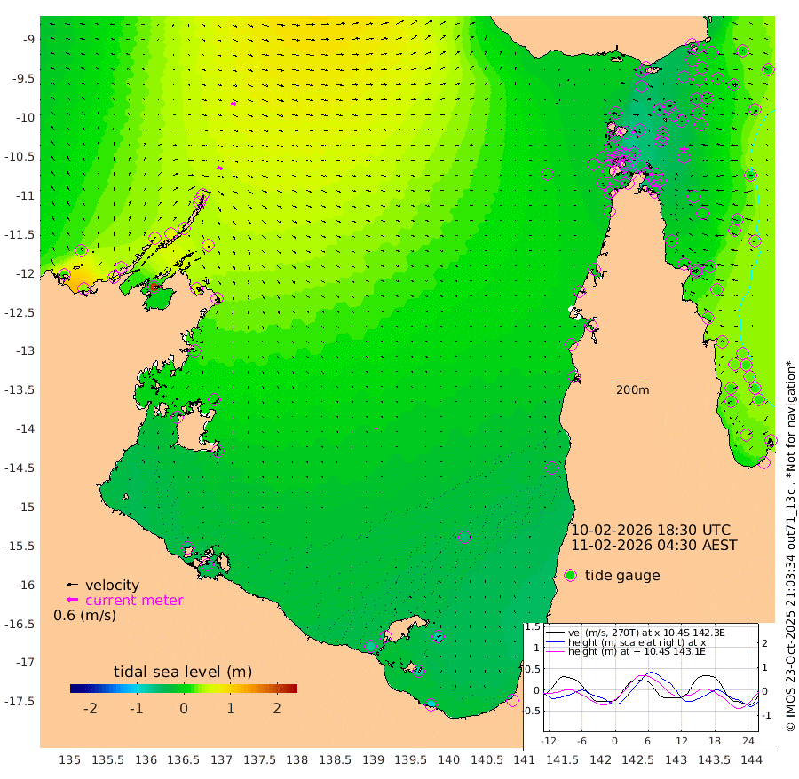 29cm/s 109T +3cm/s rms + 7cm/s -42T. ARA-GOC87 57m 10cm/s 135T +3cm/s rms + 2cm/s -2T. ARA-GOC87 60m 24cm/s 102T +2cm/s rms + 3cm/s 61T. ARA-GOC87 47m -20cm Daru -14cm Bobo Island 18cm Meer Island Barge 9cm Bramble Cay -7cm Unnamed Cay -13cm Pearce Cay -6cm Stephens Island -3cm Merrie England Shoals -21cm Mutacomal Reef 6cm Darnley Island Barge 13cm East Cay -6cm Yorke Island Barge -22cm Rennel Island -16cm Aureed Island -32cm Dungeness Reef -31cm Zagai Island -45cm Yam Island -34cm Dauan Island -19cm Saibai Island -38cm Phipi Reef -38cm Warrior Reef - West -29cm Mabuiag Island Barge -24cm Half Way Island -23cm Coconut Island -33cm Dugong Islet -39cm Poll Island -41cm Kirkcaldie Reef -54cm Suarji Island -26cm Sue Islet -18cm Hawkesbury Island -40cm Alert Patches -44cm Twin Island -16cm Badu Island -48cm St Pauls (Moa Island) -30cm Kubin (Moa Island) -40cm Ince Point -37cm Thursday Island -38cm Nardana Patches -32cm Turtle Head -21cm Round Island -19cm Goods Island -11cm Booby Island -26cm White Rocks Area 8cm Carpentaria -41cm Papou Point 2cm Bampfield Head -8cm Crab Island -19cm Red Wallis Island -28cm Packe Island -37cm Harrington Reef -23cm Herald Camp -17cm Sharp Point -29cm Red Island Point -32cm Possession Island -35cm Alpha Rock -37cm Frederick Point -17cm Wyborn Reef Light -21cm Tetley Island 12cm Triangle Reef -18cm Turtle Head Island 7cm Maclennan Cay 23cm Raine Island -6cm Mcsweeny Reef 4cm Collette Reef 19cm Shadwell Reef 6cm Hannibal Island 9cm Round Point 3cm Vrilya Point 9cm Cape Grenville 9cm Hicks Island 13cm Sir Charles Hardy Island 1cm Harvey Island 21cm Kay Reef 21cm Rocky Island 28cm Chapman Island 27cm Ham Reef 23cm Jubilee Reef 16cm Night Island 25cm Unnamed Reef No. 3 21cm Morris Island 21cm 1st 3 Mile Opening 21cm Creech Reef 18cm Fife Island 31cm Eden Reef 23cm Stanley Island 17cm Normanby River 21cm Yabooma Island 37cm Hutchison River 31cm Elcho Island 18cm North West Crocodile Island 50cm Cape Wessel 46cm Stevens Island 74cm Guluwuru Island 47cm Hopeful Bay 45cm Auster Point 44cm Two Island Bay 61cm Cadell Strait 209cm Mallison Island 60cm Melville Bay (Gove Harbour) 66cm Truant Island 46cm Cape Arnhem 20cm Cape Grey 9cm Hawk Island -20cm Milner Bay (Groote Eylandt) -32cm Cape Beatrice -61cm West Island -58cm Centre Island -64cm Mornington Island -71cm West Wellesley Islands -80cm Bountiful Island -97cm Albert River Mouth -82cm Sweers Island -95cm Karumba -53cm Nassau River Offshore -32cm Christmas Creek -2cm Archer River 2cm Boyd Point -3cm Weipa (Humbug Point) 11cm Pennefather River 0cm Cullen Point