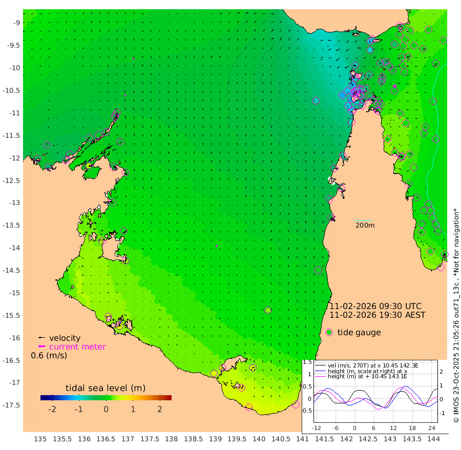 15cm/s -11T +3cm/s rms + 7cm/s -42T. ARA-GOC87 57m 16cm/s -10T +3cm/s rms + 2cm/s -2T. ARA-GOC87 60m 13cm/s 3T +2cm/s rms + 3cm/s 61T. ARA-GOC87 47m -15cm Daru -5cm Bobo Island 2cm Meer Island Barge 10cm Bramble Cay 1cm Unnamed Cay -7cm Pearce Cay 2cm Stephens Island 12cm Merrie England Shoals -1cm Mutacomal Reef 1cm Darnley Island Barge 9cm East Cay -7cm Yorke Island Barge -9cm Rennel Island -7cm Aureed Island -29cm Dungeness Reef -48cm Zagai Island -46cm Yam Island -99cm Dauan Island -80cm Saibai Island -93cm Phipi Reef -57cm Warrior Reef - West -88cm Mabuiag Island Barge -5cm Half Way Island -21cm Coconut Island -14cm Dugong Islet -35cm Poll Island -32cm Kirkcaldie Reef -60cm Suarji Island -37cm Sue Islet -123cm Hawkesbury Island -70cm Alert Patches -58cm Twin Island -125cm Badu Island -72cm St Pauls (Moa Island) -104cm Kubin (Moa Island) -79cm Ince Point -87cm Thursday Island -86cm Nardana Patches -102cm Turtle Head -108cm Round Island -117cm Goods Island -122cm Booby Island -108cm White Rocks Area -84cm Carpentaria -60cm Papou Point -131cm Bampfield Head -99cm Crab Island -105cm Red Wallis Island -97cm Packe Island -13cm Harrington Reef -116cm Herald Camp -13cm Sharp Point -83cm Red Island Point -80cm Possession Island -38cm Alpha Rock -40cm Frederick Point -15cm Wyborn Reef Light -21cm Tetley Island -5cm Triangle Reef -31cm Turtle Head Island 0cm Maclennan Cay 0cm Raine Island -3cm Mcsweeny Reef 2cm Collette Reef 0cm Shadwell Reef 8cm Hannibal Island 9cm Round Point -86cm Vrilya Point 12cm Cape Grenville 3cm Hicks Island 3cm Sir Charles Hardy Island 2cm Harvey Island 16cm Kay Reef 4cm Rocky Island 7cm Chapman Island 6cm Ham Reef 3cm Jubilee Reef 6cm Night Island 9cm Unnamed Reef No. 3 6cm Morris Island -7cm 1st 3 Mile Opening 3cm Creech Reef 9cm Fife Island 12cm Eden Reef 11cm Stanley Island 19cm Normanby River -43cm Yabooma Island -55cm Hutchison River -38cm Elcho Island -34cm North West Crocodile Island -9cm Cape Wessel -22cm Stevens Island -14cm Guluwuru Island -18cm Hopeful Bay -25cm Auster Point -23cm Two Island Bay -38cm Cadell Strait 61cm Mallison Island -18cm Melville Bay (Gove Harbour) -20cm Truant Island -10cm Cape Arnhem 0cm Cape Grey 13cm Hawk Island 39cm Milner Bay (Groote Eylandt) 43cm Cape Beatrice 65cm West Island 67cm Centre Island 62cm Mornington Island 67cm West Wellesley Islands 57cm Bountiful Island 84cm Albert River Mouth 84cm Sweers Island 72cm Karumba 32cm Nassau River Offshore -1cm Christmas Creek -37cm Archer River -55cm Boyd Point -61cm Weipa (Humbug Point) -58cm Pennefather River -76cm Cullen Point
