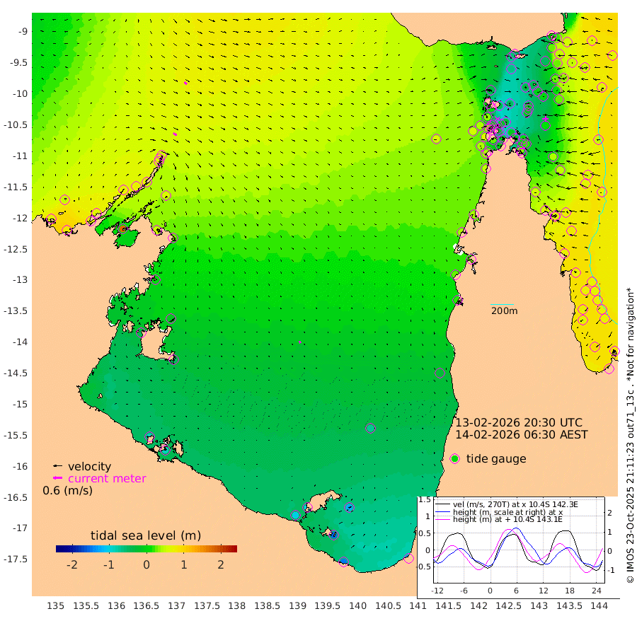 26cm/s 123T +3cm/s rms + 7cm/s -42T. ARA-GOC87 57m 16cm/s 151T +3cm/s rms + 2cm/s -2T. ARA-GOC87 60m 21cm/s 125T +2cm/s rms + 3cm/s 61T. ARA-GOC87 47m 12cm Daru 16cm Bobo Island 66cm Meer Island Barge 64cm Bramble Cay 48cm Unnamed Cay 29cm Pearce Cay 46cm Stephens Island 58cm Merrie England Shoals 27cm Mutacomal Reef 52cm Darnley Island Barge 64cm East Cay 31cm Yorke Island Barge 25cm Rennel Island 14cm Aureed Island -1cm Dungeness Reef -38cm Zagai Island -36cm Yam Island -60cm Dauan Island -54cm Saibai Island -64cm Phipi Reef -48cm Warrior Reef - West -35cm Mabuiag Island Barge 27cm Half Way Island 3cm Coconut Island 15cm Dugong Islet -17cm Poll Island -11cm Kirkcaldie Reef -48cm Suarji Island -13cm Sue Islet 37cm Hawkesbury Island -21cm Alert Patches -25cm Twin Island 12cm Badu Island -40cm St Pauls (Moa Island) 12cm Kubin (Moa Island) -18cm Ince Point -9cm Thursday Island -13cm Nardana Patches 6cm Turtle Head 22cm Round Island 38cm Goods Island 53cm Booby Island 42cm White Rocks Area 60cm Carpentaria -30cm Papou Point 68cm Bampfield Head 38cm Crab Island 42cm Red Wallis Island 25cm Packe Island 5cm Harrington Reef 37cm Herald Camp -23cm Sharp Point -5cm Red Island Point -10cm Possession Island -12cm Alpha Rock -12cm Frederick Point 22cm Wyborn Reef Light 13cm Tetley Island 48cm Triangle Reef 31cm Turtle Head Island 56cm Maclennan Cay 68cm Raine Island 40cm Mcsweeny Reef 49cm Collette Reef 63cm Shadwell Reef 59cm Hannibal Island 66cm Round Point 49cm Vrilya Point 67cm Cape Grenville 61cm Hicks Island 69cm Sir Charles Hardy Island 18cm Harvey Island 80cm Kay Reef 69cm Rocky Island 73cm Chapman Island 72cm Ham Reef 72cm Jubilee Reef 61cm Night Island 71cm Unnamed Reef No. 3 75cm Morris Island 74cm 1st 3 Mile Opening 72cm Creech Reef 63cm Fife Island 94cm Eden Reef 83cm Stanley Island 82cm Normanby River 65cm Yabooma Island 75cm Hutchison River 64cm Elcho Island 49cm North West Crocodile Island 60cm Cape Wessel 71cm Stevens Island 73cm Guluwuru Island 69cm Hopeful Bay 62cm Auster Point 65cm Two Island Bay 71cm Cadell Strait 177cm Mallison Island 56cm Melville Bay (Gove Harbour) 64cm Truant Island 36cm Cape Arnhem 3cm Cape Grey -10cm Hawk Island -43cm Milner Bay (Groote Eylandt) -52cm Cape Beatrice -86cm West Island -85cm Centre Island -103cm Mornington Island -100cm West Wellesley Islands -123cm Bountiful Island -149cm Albert River Mouth -155cm Sweers Island -153cm Karumba -70cm Nassau River Offshore -30cm Christmas Creek 16cm Archer River 29cm Boyd Point 30cm Weipa (Humbug Point) 38cm Pennefather River 40cm Cullen Point