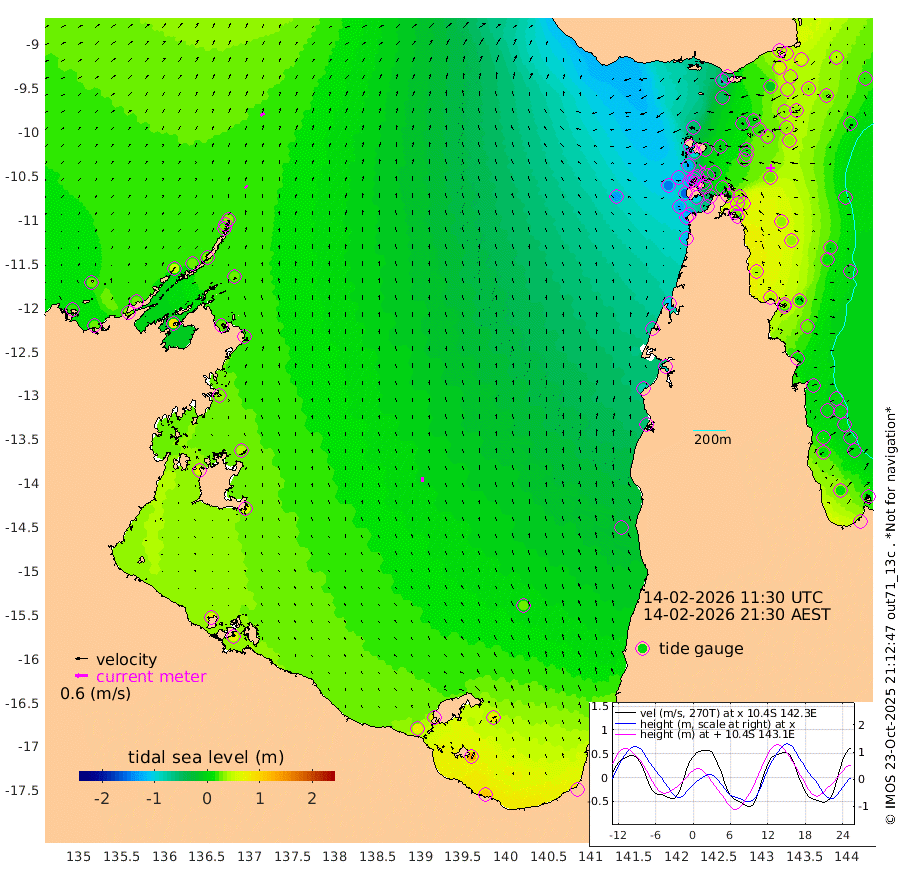 17cm/s 42T +3cm/s rms + 7cm/s -42T. ARA-GOC87 57m 25cm/s -7T +3cm/s rms + 2cm/s -2T. ARA-GOC87 60m 22cm/s 50T +2cm/s rms + 3cm/s 61T. ARA-GOC87 47m 38cm Daru 46cm Bobo Island 11cm Meer Island Barge 38cm Bramble Cay 45cm Unnamed Cay 41cm Pearce Cay 37cm Stephens Island 56cm Merrie England Shoals 54cm Mutacomal Reef 29cm Darnley Island Barge 22cm East Cay 31cm Yorke Island Barge 37cm Rennel Island 35cm Aureed Island 20cm Dungeness Reef -1cm Zagai Island -4cm Yam Island -68cm Dauan Island -50cm Saibai Island -46cm Phipi Reef -11cm Warrior Reef - West -56cm Mabuiag Island Barge 35cm Half Way Island 33cm Coconut Island 30cm Dugong Islet 15cm Poll Island 15cm Kirkcaldie Reef -7cm Suarji Island 11cm Sue Islet -122cm Hawkesbury Island -21cm Alert Patches -12cm Twin Island -107cm Badu Island -24cm St Pauls (Moa Island) -96cm Kubin (Moa Island) -46cm Ince Point -63cm Thursday Island -60cm Nardana Patches -88cm Turtle Head -103cm Round Island -121cm Goods Island -143cm Booby Island -117cm White Rocks Area -128cm Carpentaria -19cm Papou Point -150cm Bampfield Head -118cm Crab Island -127cm Red Wallis Island -102cm Packe Island 42cm Harrington Reef -142cm Herald Camp 0cm Sharp Point -64cm Red Island Point -49cm Possession Island 4cm Alpha Rock 11cm Frederick Point 44cm Wyborn Reef Light 37cm Tetley Island 8cm Triangle Reef 30cm Turtle Head Island 7cm Maclennan Cay 0cm Raine Island 37cm Mcsweeny Reef 36cm Collette Reef 13cm Shadwell Reef 44cm Hannibal Island 40cm Round Point -113cm Vrilya Point 30cm Cape Grenville 19cm Hicks Island 7cm Sir Charles Hardy Island 7cm Harvey Island 27cm Kay Reef 9cm Rocky Island 9cm Chapman Island 2cm Ham Reef 5cm Jubilee Reef 7cm Night Island 7cm Unnamed Reef No. 3 10cm Morris Island -7cm 1st 3 Mile Opening 3cm Creech Reef 15cm Fife Island 10cm Eden Reef 12cm Stanley Island 25cm Normanby River 21cm Yabooma Island 23cm Hutchison River 24cm Elcho Island 28cm North West Crocodile Island 32cm Cape Wessel 46cm Stevens Island 26cm Guluwuru Island 36cm Hopeful Bay 28cm Auster Point 18cm Two Island Bay 32cm Cadell Strait 84cm Mallison Island 27cm Melville Bay (Gove Harbour) 24cm Truant Island 19cm Cape Arnhem 34cm Cape Grey 38cm Hawk Island 61cm Milner Bay (Groote Eylandt) 57cm Cape Beatrice 70cm West Island 69cm Centre Island 69cm Mornington Island 75cm West Wellesley Islands 81cm Bountiful Island 110cm Albert River Mouth 129cm Sweers Island 98cm Karumba 29cm Nassau River Offshore -17cm Christmas Creek -54cm Archer River -80cm Boyd Point -88cm Weipa (Humbug Point) -74cm Pennefather River -111cm Cullen Point