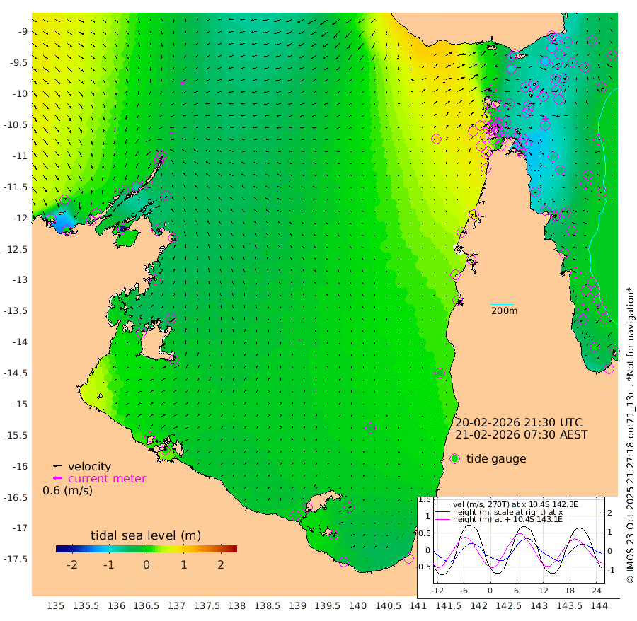 25cm/s -95T +3cm/s rms + 7cm/s -42T. ARA-GOC87 57m 9cm/s 5T +3cm/s rms + 2cm/s -2T. ARA-GOC87 60m 22cm/s -118T +2cm/s rms + 3cm/s 61T. ARA-GOC87 47m -101cm Daru -93cm Bobo Island -29cm Meer Island Barge -51cm Bramble Cay -74cm Unnamed Cay -76cm Pearce Cay -68cm Stephens Island -72cm Merrie England Shoals -90cm Mutacomal Reef -63cm Darnley Island Barge -30cm East Cay -78cm Yorke Island Barge -78cm Rennel Island -79cm Aureed Island -85cm Dungeness Reef -97cm Zagai Island -89cm Yam Island -82cm Dauan Island -72cm Saibai Island -88cm Phipi Reef -106cm Warrior Reef - West -30cm Mabuiag Island Barge -78cm Half Way Island -87cm Coconut Island -81cm Dugong Islet -85cm Poll Island -86cm Kirkcaldie Reef -66cm Suarji Island -82cm Sue Islet 54cm Hawkesbury Island -52cm Alert Patches -61cm Twin Island 27cm Badu Island -69cm St Pauls (Moa Island) 10cm Kubin (Moa Island) -33cm Ince Point -12cm Thursday Island -18cm Nardana Patches 10cm Turtle Head 31cm Round Island 59cm Goods Island 92cm Booby Island 87cm White Rocks Area 100cm Carpentaria -54cm Papou Point 98cm Bampfield Head 65cm Crab Island 78cm Red Wallis Island 28cm Packe Island -87cm Harrington Reef 61cm Herald Camp -29cm Sharp Point 13cm Red Island Point -19cm Possession Island -63cm Alpha Rock -76cm Frederick Point -91cm Wyborn Reef Light -91cm Tetley Island -30cm Triangle Reef -84cm Turtle Head Island -23cm Maclennan Cay -7cm Raine Island -69cm Mcsweeny Reef -60cm Collette Reef -31cm Shadwell Reef -64cm Hannibal Island -48cm Round Point 69cm Vrilya Point -35cm Cape Grenville -35cm Hicks Island -26cm Sir Charles Hardy Island -13cm Harvey Island -18cm Kay Reef -12cm Rocky Island -1cm Chapman Island -1cm Ham Reef -12cm Jubilee Reef -17cm Night Island -3cm Unnamed Reef No. 3 -12cm Morris Island -5cm 1st 3 Mile Opening -10cm Creech Reef -25cm Fife Island -7cm Eden Reef -10cm Stanley Island -13cm Normanby River 20cm Yabooma Island 1cm Hutchison River 13cm Elcho Island 14cm North West Crocodile Island -18cm Cape Wessel -17cm Stevens Island -70cm Guluwuru Island 1cm Hopeful Bay -9cm Auster Point -19cm Two Island Bay -57cm Cadell Strait -196cm Mallison Island -54cm Melville Bay (Gove Harbour) -56cm Truant Island -47cm Cape Arnhem -27cm Cape Grey -27cm Hawk Island -6cm Milner Bay (Groote Eylandt) -7cm Cape Beatrice 10cm West Island 14cm Centre Island -33cm Mornington Island -24cm West Wellesley Islands -13cm Bountiful Island -38cm Albert River Mouth -28cm Sweers Island -39cm Karumba -28cm Nassau River Offshore -15cm Christmas Creek 24cm Archer River 34cm Boyd Point 44cm Weipa (Humbug Point) 34cm Pennefather River 63cm Cullen Point