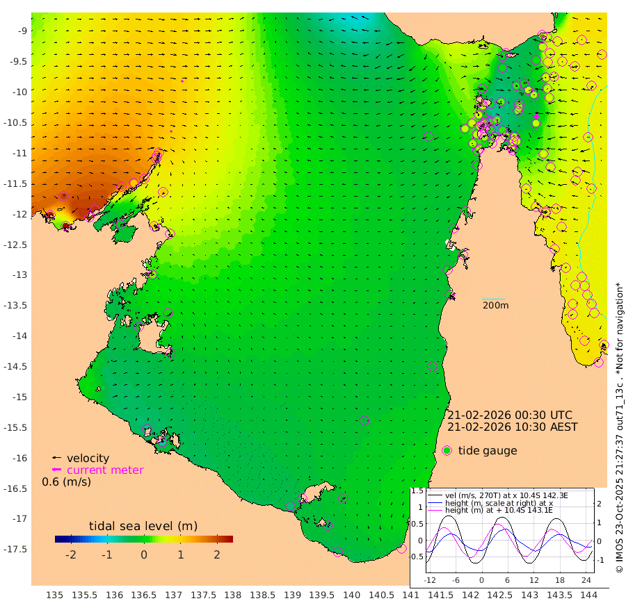 14cm/s 125T +3cm/s rms + 7cm/s -42T. ARA-GOC87 57m 7cm/s -134T +3cm/s rms + 2cm/s -2T. ARA-GOC87 60m 16cm/s 109T +2cm/s rms + 3cm/s 61T. ARA-GOC87 47m 49cm Daru 59cm Bobo Island 66cm Meer Island Barge 74cm Bramble Cay 66cm Unnamed Cay 77cm Pearce Cay 73cm Stephens Island 64cm Merrie England Shoals 51cm Mutacomal Reef 63cm Darnley Island Barge 75cm East Cay 55cm Yorke Island Barge 65cm Rennel Island 55cm Aureed Island 50cm Dungeness Reef 11cm Zagai Island 20cm Yam Island 0cm Dauan Island -14cm Saibai Island 1cm Phipi Reef 14cm Warrior Reef - West 4cm Mabuiag Island Barge 60cm Half Way Island 42cm Coconut Island 58cm Dugong Islet 34cm Poll Island 34cm Kirkcaldie Reef 23cm Suarji Island 21cm Sue Islet 60cm Hawkesbury Island 21cm Alert Patches 23cm Twin Island 42cm Badu Island 15cm St Pauls (Moa Island) 46cm Kubin (Moa Island) 21cm Ince Point 23cm Thursday Island 22cm Nardana Patches 38cm Turtle Head 39cm Round Island 56cm Goods Island 45cm Booby Island 59cm White Rocks Area -1cm Carpentaria 21cm Papou Point 50cm Bampfield Head 21cm Crab Island 40cm Red Wallis Island 40cm Packe Island 55cm Harrington Reef 42cm Herald Camp -14cm Sharp Point 33cm Red Island Point 26cm Possession Island 16cm Alpha Rock 35cm Frederick Point 51cm Wyborn Reef Light 44cm Tetley Island 55cm Triangle Reef 69cm Turtle Head Island 67cm Maclennan Cay 63cm Raine Island 62cm Mcsweeny Reef 57cm Collette Reef 55cm Shadwell Reef 65cm Hannibal Island 78cm Round Point 0cm Vrilya Point 66cm Cape Grenville 73cm Hicks Island 76cm Sir Charles Hardy Island 21cm Harvey Island 69cm Kay Reef 69cm Rocky Island 67cm Chapman Island 63cm Ham Reef 66cm Jubilee Reef 56cm Night Island 63cm Unnamed Reef No. 3 72cm Morris Island 68cm 1st 3 Mile Opening 67cm Creech Reef 69cm Fife Island 85cm Eden Reef 70cm Stanley Island 86cm Normanby River 218cm Yabooma Island 248cm Hutchison River 205cm Elcho Island 199cm North West Crocodile Island 129cm Cape Wessel 174cm Stevens Island 110cm Guluwuru Island 158cm Hopeful Bay 146cm Auster Point 149cm Two Island Bay 196cm Cadell Strait -12cm Mallison Island 104cm Melville Bay (Gove Harbour) 109cm Truant Island 59cm Cape Arnhem 37cm Cape Grey 15cm Hawk Island -21cm Milner Bay (Groote Eylandt) -23cm Cape Beatrice -68cm West Island -79cm Centre Island -60cm Mornington Island -53cm West Wellesley Islands -26cm Bountiful Island -40cm Albert River Mouth -52cm Sweers Island -45cm Karumba -35cm Nassau River Offshore -20cm Christmas Creek -1cm Archer River 5cm Boyd Point 19cm Weipa (Humbug Point) -14cm Pennefather River 2cm Cullen Point