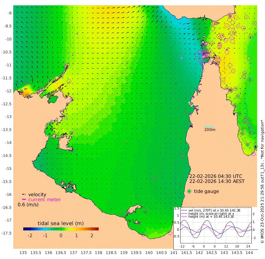 18cm/s 59T +3cm/s rms + 7cm/s -42T. ARA-GOC87 57m 10cm/s 172T +3cm/s rms + 2cm/s -2T. ARA-GOC87 60m 19cm/s 39T +2cm/s rms + 3cm/s 61T. ARA-GOC87 47m 74cm Daru 71cm Bobo Island 27cm Meer Island Barge 38cm Bramble Cay 56cm Unnamed Cay 54cm Pearce Cay 52cm Stephens Island 48cm Merrie England Shoals 64cm Mutacomal Reef 53cm Darnley Island Barge 26cm East Cay 65cm Yorke Island Barge 57cm Rennel Island 60cm Aureed Island 60cm Dungeness Reef 78cm Zagai Island 73cm Yam Island 67cm Dauan Island 73cm Saibai Island 53cm Phipi Reef 84cm Warrior Reef - West 25cm Mabuiag Island Barge 56cm Half Way Island 59cm Coconut Island 63cm Dugong Islet 60cm Poll Island 61cm Kirkcaldie Reef 43cm Suarji Island 69cm Sue Islet -53cm Hawkesbury Island 26cm Alert Patches 38cm Twin Island -40cm Badu Island 46cm St Pauls (Moa Island) -21cm Kubin (Moa Island) 14cm Ince Point -6cm Thursday Island 0cm Nardana Patches -28cm Turtle Head -42cm Round Island -68cm Goods Island -95cm Booby Island -92cm White Rocks Area -83cm Carpentaria 40cm Papou Point -94cm Bampfield Head -80cm Crab Island -86cm Red Wallis Island -50cm Packe Island 61cm Harrington Reef -60cm Herald Camp 21cm Sharp Point -22cm Red Island Point 0cm Possession Island 47cm Alpha Rock 51cm Frederick Point 65cm Wyborn Reef Light 66cm Tetley Island 25cm Triangle Reef 58cm Turtle Head Island 23cm Maclennan Cay 5cm Raine Island 51cm Mcsweeny Reef 44cm Collette Reef 24cm Shadwell Reef 47cm Hannibal Island 32cm Round Point -84cm Vrilya Point 26cm Cape Grenville 28cm Hicks Island 33cm Sir Charles Hardy Island 11cm Harvey Island 16cm Kay Reef 13cm Rocky Island 2cm Chapman Island 9cm Ham Reef 15cm Jubilee Reef 10cm Night Island 4cm Unnamed Reef No. 3 11cm Morris Island 5cm 1st 3 Mile Opening 10cm Creech Reef 16cm Fife Island 9cm Eden Reef 9cm Stanley Island 15cm Normanby River -7cm Yabooma Island 11cm Hutchison River -2cm Elcho Island -1cm North West Crocodile Island 41cm Cape Wessel 19cm Stevens Island 91cm Guluwuru Island 5cm Hopeful Bay 22cm Auster Point 37cm Two Island Bay 63cm Cadell Strait 188cm Mallison Island 63cm Melville Bay (Gove Harbour) 67cm Truant Island 51cm Cape Arnhem 36cm Cape Grey 22cm Hawk Island 0cm Milner Bay (Groote Eylandt) 0cm Cape Beatrice -16cm West Island -26cm Centre Island -1cm Mornington Island -3cm West Wellesley Islands -4cm Bountiful Island -5cm Albert River Mouth -19cm Sweers Island -10cm Karumba -12cm Nassau River Offshore -16cm Christmas Creek -45cm Archer River -40cm Boyd Point -54cm Weipa (Humbug Point) -61cm Pennefather River -70cm Cullen Point
