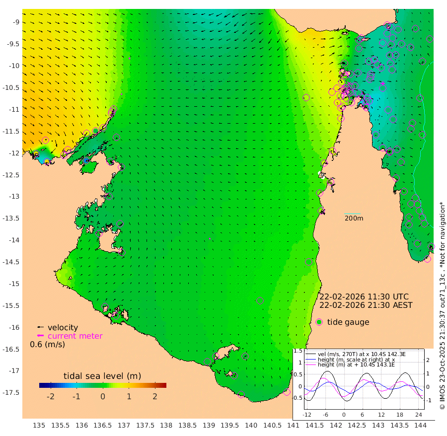 12cm/s 179T +3cm/s rms + 7cm/s -42T. ARA-GOC87 57m 13cm/s -23T +3cm/s rms + 2cm/s -2T. ARA-GOC87 60m 15cm/s 160T +2cm/s rms + 3cm/s 61T. ARA-GOC87 47m -68cm Daru -63cm Bobo Island -30cm Meer Island Barge -36cm Bramble Cay -58cm Unnamed Cay -45cm Pearce Cay -49cm Stephens Island -50cm Merrie England Shoals -62cm Mutacomal Reef -56cm Darnley Island Barge -25cm East Cay -66cm Yorke Island Barge -52cm Rennel Island -60cm Aureed Island -58cm Dungeness Reef -75cm Zagai Island -64cm Yam Island -60cm Dauan Island -73cm Saibai Island -54cm Phipi Reef -76cm Warrior Reef - West -31cm Mabuiag Island Barge -50cm Half Way Island -58cm Coconut Island -59cm Dugong Islet -56cm Poll Island -56cm Kirkcaldie Reef -58cm Suarji Island -74cm Sue Islet 53cm Hawkesbury Island -40cm Alert Patches -42cm Twin Island 39cm Badu Island -50cm St Pauls (Moa Island) 23cm Kubin (Moa Island) -20cm Ince Point -2cm Thursday Island -8cm Nardana Patches 20cm Turtle Head 27cm Round Island 58cm Goods Island 77cm Booby Island 80cm White Rocks Area 44cm Carpentaria -36cm Papou Point 52cm Bampfield Head 75cm Crab Island 77cm Red Wallis Island 47cm Packe Island -60cm Harrington Reef 44cm Herald Camp -23cm Sharp Point 26cm Red Island Point -17cm Possession Island -53cm Alpha Rock -52cm Frederick Point -65cm Wyborn Reef Light -65cm Tetley Island -28cm Triangle Reef -56cm Turtle Head Island -26cm Maclennan Cay -8cm Raine Island -53cm Mcsweeny Reef -49cm Collette Reef -31cm Shadwell Reef -52cm Hannibal Island -30cm Round Point 71cm Vrilya Point -33cm Cape Grenville -28cm Hicks Island -39cm Sir Charles Hardy Island -11cm Harvey Island -25cm Kay Reef -19cm Rocky Island -9cm Chapman Island -15cm Ham Reef -19cm Jubilee Reef -14cm Night Island -10cm Unnamed Reef No. 3 -16cm Morris Island -15cm 1st 3 Mile Opening -16cm Creech Reef -14cm Fife Island -14cm Eden Reef -17cm Stanley Island -15cm Normanby River 110cm Yabooma Island 104cm Hutchison River 101cm Elcho Island 104cm North West Crocodile Island 23cm Cape Wessel 74cm Stevens Island -33cm Guluwuru Island 70cm Hopeful Bay 45cm Auster Point 43cm Two Island Bay 56cm Cadell Strait -150cm Mallison Island -14cm Melville Bay (Gove Harbour) -16cm Truant Island -23cm Cape Arnhem -26cm Cape Grey -19cm Hawk Island -10cm Milner Bay (Groote Eylandt) -8cm Cape Beatrice -16cm West Island -12cm Centre Island -15cm Mornington Island -16cm West Wellesley Islands -17cm Bountiful Island 14cm Albert River Mouth 3cm Sweers Island 16cm Karumba 7cm Nassau River Offshore 9cm Christmas Creek 32cm Archer River 23cm Boyd Point 40cm Weipa (Humbug Point) 48cm Pennefather River 53cm Cullen Point