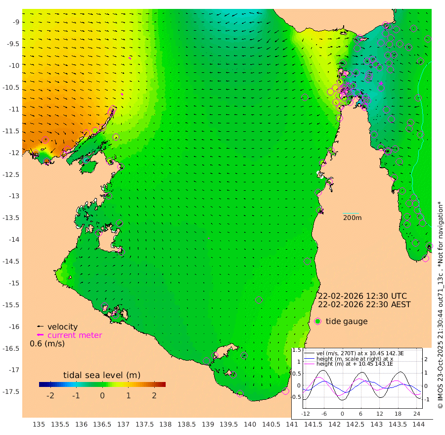 22cm/s 133T +3cm/s rms + 7cm/s -42T. ARA-GOC87 57m 12cm/s -33T +3cm/s rms + 2cm/s -2T. ARA-GOC87 60m 24cm/s 123T +2cm/s rms + 3cm/s 61T. ARA-GOC87 47m -36cm Daru -28cm Bobo Island -5cm Meer Island Barge -8cm Bramble Cay -29cm Unnamed Cay -9cm Pearce Cay -17cm Stephens Island -24cm Merrie England Shoals -36cm Mutacomal Reef -26cm Darnley Island Barge -1cm East Cay -35cm Yorke Island Barge -23cm Rennel Island -28cm Aureed Island -28cm Dungeness Reef -49cm Zagai Island -44cm Yam Island -38cm Dauan Island -60cm Saibai Island -29cm Phipi Reef -48cm Warrior Reef - West -29cm Mabuiag Island Barge -23cm Half Way Island -30cm Coconut Island -33cm Dugong Islet -33cm Poll Island -35cm Kirkcaldie Reef -39cm Suarji Island -54cm Sue Islet 38cm Hawkesbury Island -29cm Alert Patches -29cm Twin Island 35cm Badu Island -35cm St Pauls (Moa Island) 21cm Kubin (Moa Island) -15cm Ince Point -3cm Thursday Island -7cm Nardana Patches 18cm Turtle Head 21cm Round Island 47cm Goods Island 53cm Booby Island 58cm White Rocks Area 8cm Carpentaria -25cm Papou Point 34cm Bampfield Head 52cm Crab Island 52cm Red Wallis Island 37cm Packe Island -32cm Harrington Reef 26cm Herald Camp -22cm Sharp Point 19cm Red Island Point -10cm Possession Island -44cm Alpha Rock -32cm Frederick Point -36cm Wyborn Reef Light -38cm Tetley Island -7cm Triangle Reef -22cm Turtle Head Island -5cm Maclennan Cay 11cm Raine Island -24cm Mcsweeny Reef -23cm Collette Reef -10cm Shadwell Reef -23cm Hannibal Island -2cm Round Point 41cm Vrilya Point -12cm Cape Grenville -3cm Hicks Island -16cm Sir Charles Hardy Island -4cm Harvey Island -7cm Kay Reef 1cm Rocky Island 9cm Chapman Island 0cm Ham Reef 0cm Jubilee Reef 4cm Night Island 5cm Unnamed Reef No. 3 5cm Morris Island 5cm 1st 3 Mile Opening 3cm Creech Reef 10cm Fife Island 10cm Eden Reef 1cm Stanley Island 7cm Normanby River 169cm Yabooma Island 183cm Hutchison River 163cm Elcho Island 160cm North West Crocodile Island 73cm Cape Wessel 135cm Stevens Island 31cm Guluwuru Island 122cm Hopeful Bay 98cm Auster Point 98cm Two Island Bay 139cm Cadell Strait -81cm Mallison Island 45cm Melville Bay (Gove Harbour) 46cm Truant Island 20cm Cape Arnhem 3cm Cape Grey 2cm Hawk Island -7cm Milner Bay (Groote Eylandt) -10cm Cape Beatrice -38cm West Island -36cm Centre Island -20cm Mornington Island -25cm West Wellesley Islands -17cm Bountiful Island 18cm Albert River Mouth 10cm Sweers Island 18cm Karumba 2cm Nassau River Offshore 3cm Christmas Creek 21cm Archer River 10cm Boyd Point 28cm Weipa (Humbug Point) 30cm Pennefather River 28cm Cullen Point