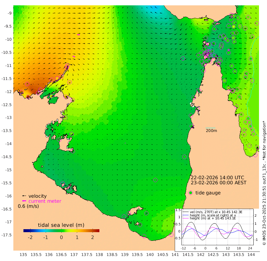 39cm/s 113T +3cm/s rms + 7cm/s -42T. ARA-GOC87 57m 6cm/s -52T +3cm/s rms + 2cm/s -2T. ARA-GOC87 60m 39cm/s 102T +2cm/s rms + 3cm/s 61T. ARA-GOC87 47m 20cm Daru 28cm Bobo Island 29cm Meer Island Barge 30cm Bramble Cay 18cm Unnamed Cay 40cm Pearce Cay 30cm Stephens Island 18cm Merrie England Shoals 8cm Mutacomal Reef 23cm Darnley Island Barge 30cm East Cay 17cm Yorke Island Barge 21cm Rennel Island 24cm Aureed Island 19cm Dungeness Reef 2cm Zagai Island -6cm Yam Island 0cm Dauan Island -24cm Saibai Island 13cm Phipi Reef 4cm Warrior Reef - West -20cm Mabuiag Island Barge 20cm Half Way Island 17cm Coconut Island 11cm Dugong Islet 8cm Poll Island 3cm Kirkcaldie Reef -5cm Suarji Island -11cm Sue Islet -7cm Hawkesbury Island -9cm Alert Patches -5cm Twin Island 9cm Badu Island -7cm St Pauls (Moa Island) 4cm Kubin (Moa Island) -9cm Ince Point -9cm Thursday Island -9cm Nardana Patches 1cm Turtle Head -5cm Round Island 5cm Goods Island -7cm Booby Island -3cm White Rocks Area -48cm Carpentaria -5cm Papou Point -14cm Bampfield Head -1cm Crab Island -9cm Red Wallis Island 3cm Packe Island 14cm Harrington Reef -18cm Herald Camp -13cm Sharp Point -5cm Red Island Point -5cm Possession Island -19cm Alpha Rock 3cm Frederick Point 13cm Wyborn Reef Light 9cm Tetley Island 21cm Triangle Reef 29cm Turtle Head Island 22cm Maclennan Cay 30cm Raine Island 22cm Mcsweeny Reef 19cm Collette Reef 20cm Shadwell Reef 23cm Hannibal Island 34cm Round Point -15cm Vrilya Point 18cm Cape Grenville 29cm Hicks Island 16cm Sir Charles Hardy Island 7cm Harvey Island 17cm Kay Reef 25cm Rocky Island 26cm Chapman Island 18cm Ham Reef 24cm Jubilee Reef 26cm Night Island 21cm Unnamed Reef No. 3 29cm Morris Island 29cm 1st 3 Mile Opening 25cm Creech Reef 36cm Fife Island 36cm Eden Reef 23cm Stanley Island 30cm Normanby River 177cm Yabooma Island 212cm Hutchison River 178cm Elcho Island 167cm North West Crocodile Island 109cm Cape Wessel 163cm Stevens Island 109cm Guluwuru Island 143cm Hopeful Bay 130cm Auster Point 132cm Two Island Bay 197cm Cadell Strait 63cm Mallison Island 108cm Melville Bay (Gove Harbour) 112cm Truant Island 72cm Cape Arnhem 39cm Cape Grey 29cm Hawk Island 0cm Milner Bay (Groote Eylandt) -9cm Cape Beatrice -55cm West Island -55cm Centre Island -20cm Mornington Island -29cm West Wellesley Islands -16cm Bountiful Island 15cm Albert River Mouth 15cm Sweers Island 11cm Karumba -6cm Nassau River Offshore -7cm Christmas Creek -3cm Archer River -13cm Boyd Point -2cm Weipa (Humbug Point) -3cm Pennefather River -20cm Cullen Point