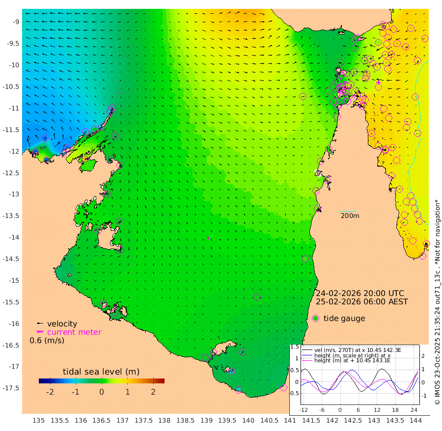6cm/s 136T +3cm/s rms + 7cm/s -42T. ARA-GOC87 57m 26cm/s 156T +3cm/s rms + 2cm/s -2T. ARA-GOC87 60m 7cm/s -121T +2cm/s rms + 3cm/s 61T. ARA-GOC87 47m 79cm Daru 77cm Bobo Island 79cm Meer Island Barge 85cm Bramble Cay 93cm Unnamed Cay 80cm Pearce Cay 90cm Stephens Island 100cm Merrie England Shoals 86cm Mutacomal Reef 94cm Darnley Island Barge 76cm East Cay 88cm Yorke Island Barge 80cm Rennel Island 79cm Aureed Island 69cm Dungeness Reef 39cm Zagai Island 36cm Yam Island -1cm Dauan Island 5cm Saibai Island 7cm Phipi Reef 33cm Warrior Reef - West 2cm Mabuiag Island Barge 86cm Half Way Island 71cm Coconut Island 84cm Dugong Islet 55cm Poll Island 66cm Kirkcaldie Reef 37cm Suarji Island 61cm Sue Islet 1cm Hawkesbury Island 47cm Alert Patches 44cm Twin Island -3cm Badu Island 35cm St Pauls (Moa Island) 10cm Kubin (Moa Island) 29cm Ince Point 26cm Thursday Island 25cm Nardana Patches 19cm Turtle Head 5cm Round Island 11cm Goods Island 14cm Booby Island 5cm White Rocks Area 45cm Carpentaria 26cm Papou Point 20cm Bampfield Head 8cm Crab Island 11cm Red Wallis Island 17cm Packe Island 84cm Harrington Reef 8cm Herald Camp 10cm Sharp Point 6cm Red Island Point 27cm Possession Island 49cm Alpha Rock 59cm Frederick Point 78cm Wyborn Reef Light 72cm Tetley Island 64cm Triangle Reef 87cm Turtle Head Island 73cm Maclennan Cay 63cm Raine Island 88cm Mcsweeny Reef 88cm Collette Reef 77cm Shadwell Reef 98cm Hannibal Island 85cm Round Point 28cm Vrilya Point 88cm Cape Grenville 76cm Hicks Island 83cm Sir Charles Hardy Island 26cm Harvey Island 86cm Kay Reef 70cm Rocky Island 66cm Chapman Island 67cm Ham Reef 72cm Jubilee Reef 68cm Night Island 69cm Unnamed Reef No. 3 75cm Morris Island 75cm 1st 3 Mile Opening 76cm Creech Reef 69cm Fife Island 85cm Eden Reef 84cm Stanley Island 81cm Normanby River -150cm Yabooma Island -159cm Hutchison River -146cm Elcho Island -153cm North West Crocodile Island -67cm Cape Wessel -117cm Stevens Island -19cm Guluwuru Island -108cm Hopeful Bay -84cm Auster Point -86cm Two Island Bay -110cm Cadell Strait 118cm Mallison Island -35cm Melville Bay (Gove Harbour) -33cm Truant Island -15cm Cape Arnhem -18cm Cape Grey -22cm Hawk Island -28cm Milner Bay (Groote Eylandt) -25cm Cape Beatrice -13cm West Island -12cm Centre Island -21cm Mornington Island -15cm West Wellesley Islands -49cm Bountiful Island -93cm Albert River Mouth -93cm Sweers Island -90cm Karumba -3cm Nassau River Offshore 22cm Christmas Creek 27cm Archer River 33cm Boyd Point 22cm Weipa (Humbug Point) 36cm Pennefather River 22cm Cullen Point