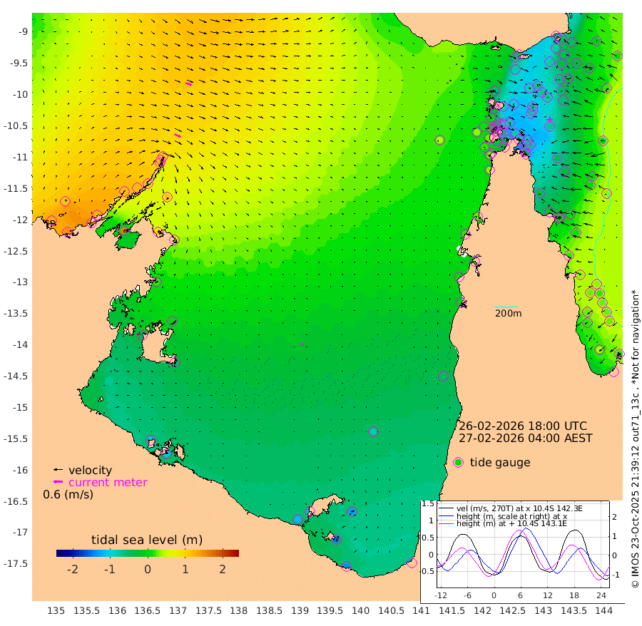 44cm/s 116T +3cm/s rms + 7cm/s -42T. ARA-GOC87 57m 11cm/s 135T +3cm/s rms + 2cm/s -2T. ARA-GOC87 60m 41cm/s 112T +2cm/s rms + 3cm/s 61T. ARA-GOC87 47m -68cm Daru -52cm Bobo Island 16cm Meer Island Barge -11cm Bramble Cay -48cm Unnamed Cay -38cm Pearce Cay -31cm Stephens Island -48cm Merrie England Shoals -77cm Mutacomal Reef -17cm Darnley Island Barge 8cm East Cay -40cm Yorke Island Barge -59cm Rennel Island -48cm Aureed Island -69cm Dungeness Reef -74cm Zagai Island -84cm Yam Island -59cm Dauan Island -54cm Saibai Island -80cm Phipi Reef -81cm Warrior Reef - West -53cm Mabuiag Island Barge -54cm Half Way Island -69cm Coconut Island -68cm Dugong Islet -80cm Poll Island -82cm Kirkcaldie Reef -100cm Suarji Island -74cm Sue Islet 5cm Hawkesbury Island -84cm Alert Patches -81cm Twin Island -1cm Badu Island -87cm St Pauls (Moa Island) -19cm Kubin (Moa Island) -63cm Ince Point -49cm Thursday Island -54cm Nardana Patches -29cm Turtle Head -21cm Round Island 12cm Goods Island 31cm Booby Island 13cm White Rocks Area 41cm Carpentaria -67cm Papou Point 23cm Bampfield Head 27cm Crab Island 20cm Red Wallis Island -12cm Packe Island -82cm Harrington Reef -3cm Herald Camp -38cm Sharp Point -25cm Red Island Point -59cm Possession Island -82cm Alpha Rock -80cm Frederick Point -72cm Wyborn Reef Light -76cm Tetley Island 3cm Triangle Reef -58cm Turtle Head Island 6cm Maclennan Cay 31cm Raine Island -40cm Mcsweeny Reef -30cm Collette Reef 5cm Shadwell Reef -30cm Hannibal Island -13cm Round Point 34cm Vrilya Point -12cm Cape Grenville 0cm Hicks Island 9cm Sir Charles Hardy Island -3cm Harvey Island 8cm Kay Reef 21cm Rocky Island 31cm Chapman Island 31cm Ham Reef 27cm Jubilee Reef 16cm Night Island 29cm Unnamed Reef No. 3 23cm Morris Island 29cm 1st 3 Mile Opening 26cm Creech Reef 19cm Fife Island 42cm Eden Reef 22cm Stanley Island 21cm Normanby River 122cm Yabooma Island 145cm Hutchison River 126cm Elcho Island 111cm North West Crocodile Island 109cm Cape Wessel 117cm Stevens Island 116cm Guluwuru Island 109cm Hopeful Bay 107cm Auster Point 117cm Two Island Bay 156cm Cadell Strait 163cm Mallison Island 95cm Melville Bay (Gove Harbour) 106cm Truant Island 65cm Cape Arnhem 21cm Cape Grey -5cm Hawk Island -41cm Milner Bay (Groote Eylandt) -56cm Cape Beatrice -103cm West Island -103cm Centre Island -116cm Mornington Island -119cm West Wellesley Islands -128cm Bountiful Island -139cm Albert River Mouth -147cm Sweers Island -147cm Karumba -82cm Nassau River Offshore -46cm Christmas Creek 2cm Archer River 15cm Boyd Point 18cm Weipa (Humbug Point) 21cm Pennefather River 25cm Cullen Point