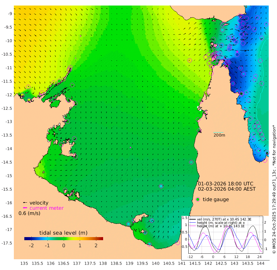 10cm/s 140T +3cm/s rms + 7cm/s -42T. ARA-GOC87 57m 20cm/s 22T +3cm/s rms + 2cm/s -2T. ARA-GOC87 60m 16cm/s 136T +2cm/s rms + 3cm/s 61T. ARA-GOC87 47m -171cm Daru -169cm Bobo Island -99cm Meer Island Barge -135cm Bramble Cay -160cm Unnamed Cay -170cm Pearce Cay -159cm Stephens Island -166cm Merrie England Shoals -172cm Mutacomal Reef -141cm Darnley Island Barge -115cm East Cay -150cm Yorke Island Barge -166cm Rennel Island -161cm Aureed Island -159cm Dungeness Reef -115cm Zagai Island -119cm Yam Island -63cm Dauan Island -47cm Saibai Island -96cm Phipi Reef -129cm Warrior Reef - West -28cm Mabuiag Island Barge -162cm Half Way Island -157cm Coconut Island -166cm Dugong Islet -141cm Poll Island -149cm Kirkcaldie Reef -122cm Suarji Island -124cm Sue Islet 22cm Hawkesbury Island -104cm Alert Patches -110cm Twin Island 12cm Badu Island -101cm St Pauls (Moa Island) -17cm Kubin (Moa Island) -68cm Ince Point -46cm Thursday Island -51cm Nardana Patches -30cm Turtle Head 5cm Round Island 18cm Goods Island 58cm Booby Island 37cm White Rocks Area 85cm Carpentaria -84cm Papou Point 65cm Bampfield Head 47cm Crab Island 41cm Red Wallis Island -12cm Packe Island -180cm Harrington Reef 30cm Herald Camp -31cm Sharp Point -27cm Red Island Point -59cm Possession Island -103cm Alpha Rock -138cm Frederick Point -160cm Wyborn Reef Light -153cm Tetley Island -92cm Triangle Reef -163cm Turtle Head Island -99cm Maclennan Cay -71cm Raine Island -152cm Mcsweeny Reef -140cm Collette Reef -96cm Shadwell Reef -153cm Hannibal Island -141cm Round Point 57cm Vrilya Point -124cm Cape Grenville -116cm Hicks Island -107cm Sir Charles Hardy Island -39cm Harvey Island -105cm Kay Reef -86cm Rocky Island -75cm Chapman Island -69cm Ham Reef -80cm Jubilee Reef -84cm Night Island -76cm Unnamed Reef No. 3 -91cm Morris Island -75cm 1st 3 Mile Opening -85cm Creech Reef -101cm Fife Island -94cm Eden Reef -92cm Stanley Island -107cm Normanby River 62cm Yabooma Island 50cm Hutchison River 61cm Elcho Island 56cm North West Crocodile Island 37cm Cape Wessel 46cm Stevens Island 0cm Guluwuru Island 49cm Hopeful Bay 41cm Auster Point 45cm Two Island Bay 21cm Cadell Strait -33cm Mallison Island 4cm Melville Bay (Gove Harbour) 9cm Truant Island -1cm Cape Arnhem -7cm Cape Grey -16cm Hawk Island -2cm Milner Bay (Groote Eylandt) -22cm Cape Beatrice -26cm West Island -21cm Centre Island -90cm Mornington Island -91cm West Wellesley Islands -91cm Bountiful Island -93cm Albert River Mouth -83cm Sweers Island -102cm Karumba -93cm Nassau River Offshore -74cm Christmas Creek -20cm Archer River 4cm Boyd Point 5cm Weipa (Humbug Point) 19cm Pennefather River 48cm Cullen Point