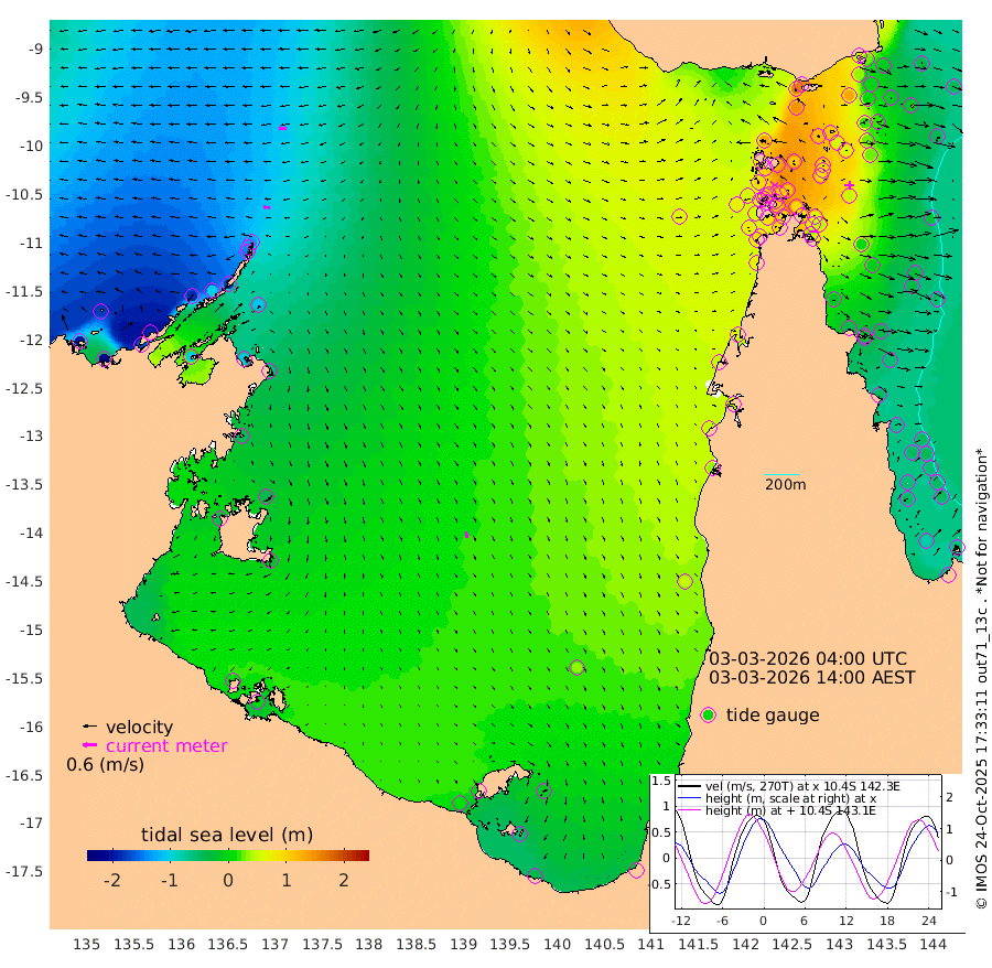 26cm/s -85T +3cm/s rms + 7cm/s -42T. ARA-GOC87 57m 26cm/s 171T +3cm/s rms + 2cm/s -2T. ARA-GOC87 60m 35cm/s -90T +2cm/s rms + 3cm/s 61T. ARA-GOC87 47m 45cm Daru 25cm Bobo Island -39cm Meer Island Barge -36cm Bramble Cay -1cm Unnamed Cay 5cm Pearce Cay -9cm Stephens Island -13cm Merrie England Shoals 30cm Mutacomal Reef -10cm Darnley Island Barge -45cm East Cay 19cm Yorke Island Barge 22cm Rennel Island 26cm Aureed Island 59cm Dungeness Reef 110cm Zagai Island 116cm Yam Island 161cm Dauan Island 152cm Saibai Island 146cm Phipi Reef 129cm Warrior Reef - West 128cm Mabuiag Island Barge 25cm Half Way Island 53cm Coconut Island 46cm Dugong Islet 84cm Poll Island 85cm Kirkcaldie Reef 112cm Suarji Island 91cm Sue Islet 91cm Hawkesbury Island 111cm Alert Patches 109cm Twin Island 99cm Badu Island 132cm St Pauls (Moa Island) 99cm Kubin (Moa Island) 115cm Ince Point 110cm Thursday Island 113cm Nardana Patches 98cm Turtle Head 84cm Round Island 74cm Goods Island 70cm Booby Island 58cm White Rocks Area 67cm Carpentaria 108cm Papou Point 55cm Bampfield Head 68cm Crab Island 76cm Red Wallis Island 88cm Packe Island 50cm Harrington Reef 91cm Herald Camp 51cm Sharp Point 91cm Red Island Point 94cm Possession Island 93cm Alpha Rock 86cm Frederick Point 38cm Wyborn Reef Light 53cm Tetley Island -16cm Triangle Reef 35cm Turtle Head Island -28cm Maclennan Cay -50cm Raine Island 3cm Mcsweeny Reef -9cm Collette Reef -30cm Shadwell Reef -20cm Hannibal Island -40cm Round Point 68cm Vrilya Point -36cm Cape Grenville -36cm Hicks Island -33cm Sir Charles Hardy Island -8cm Harvey Island -56cm Kay Reef -51cm Rocky Island -60cm Chapman Island -51cm Ham Reef -48cm Jubilee Reef -40cm Night Island -53cm Unnamed Reef No. 3 -56cm Morris Island -50cm 1st 3 Mile Opening -49cm Creech Reef -51cm Fife Island -77cm Eden Reef -60cm Stanley Island -71cm Normanby River -196cm Yabooma Island -215cm Hutchison River -194cm Elcho Island -179cm North West Crocodile Island -132cm Cape Wessel -182cm Stevens Island -104cm Guluwuru Island -177cm Hopeful Bay -148cm Auster Point -139cm Two Island Bay -168cm Cadell Strait -104cm Mallison Island -104cm Melville Bay (Gove Harbour) -108cm Truant Island -65cm Cape Arnhem -51cm Cape Grey -41cm Hawk Island -38cm Milner Bay (Groote Eylandt) -22cm Cape Beatrice 7cm West Island 5cm Centre Island 14cm Mornington Island 9cm West Wellesley Islands -13cm Bountiful Island -32cm Albert River Mouth -55cm Sweers Island -12cm Karumba 30cm Nassau River Offshore 47cm Christmas Creek 36cm Archer River 50cm Boyd Point 40cm Weipa (Humbug Point) 49cm Pennefather River 64cm Cullen Point